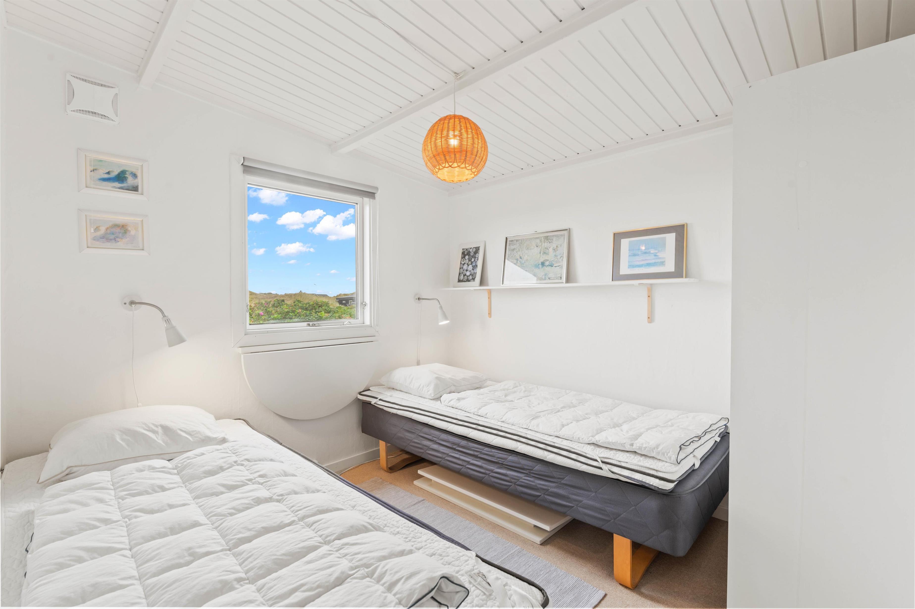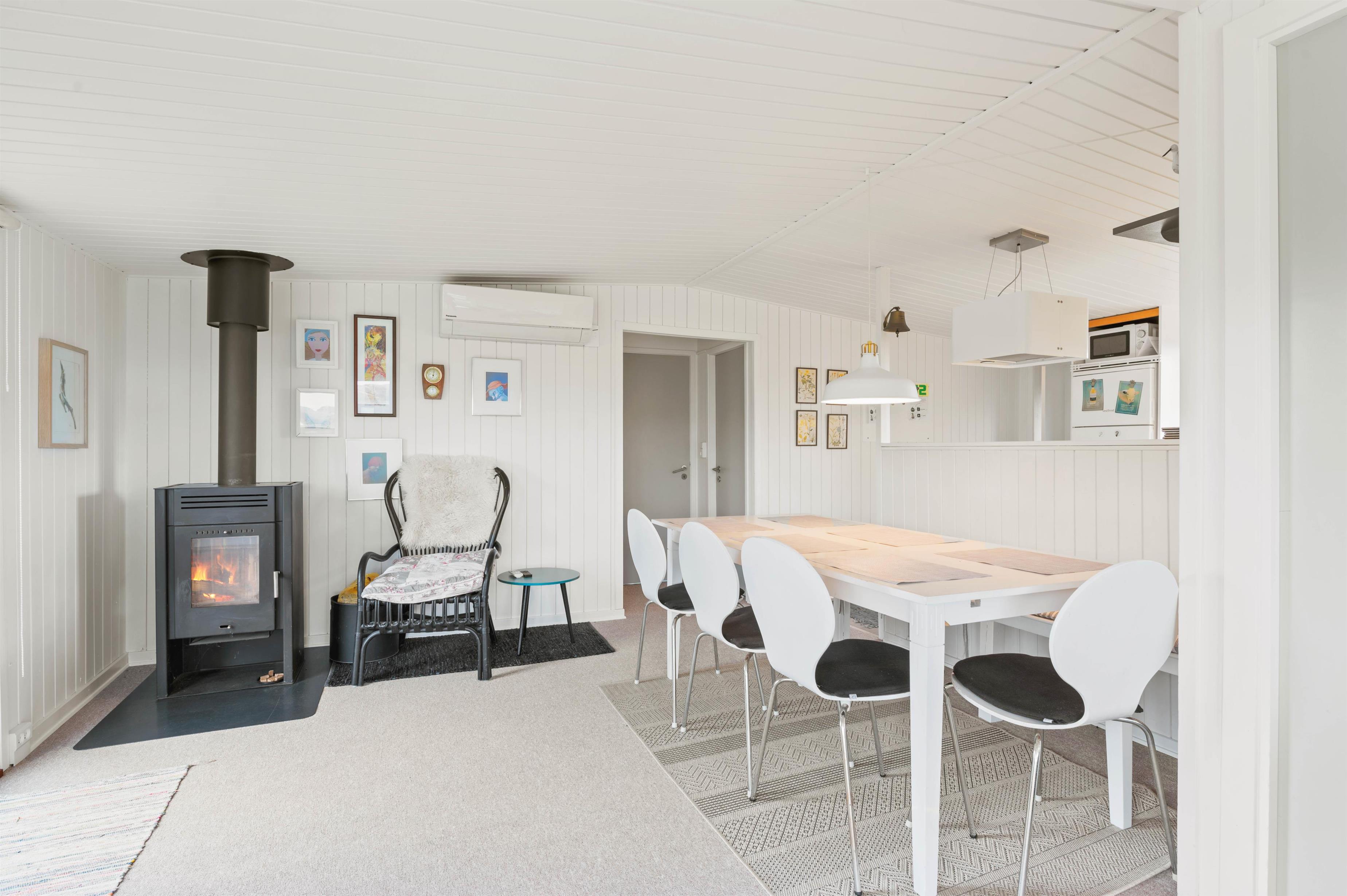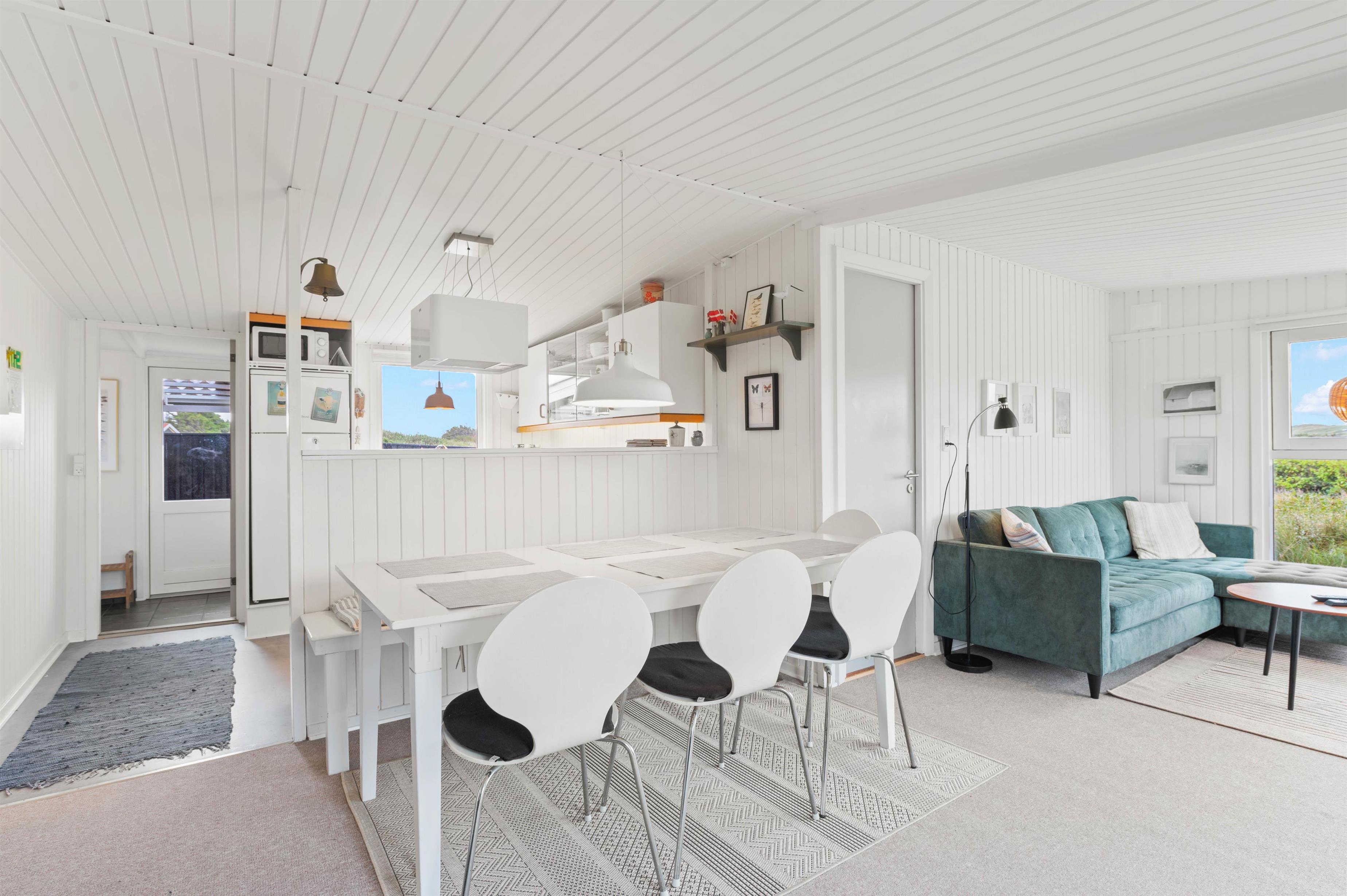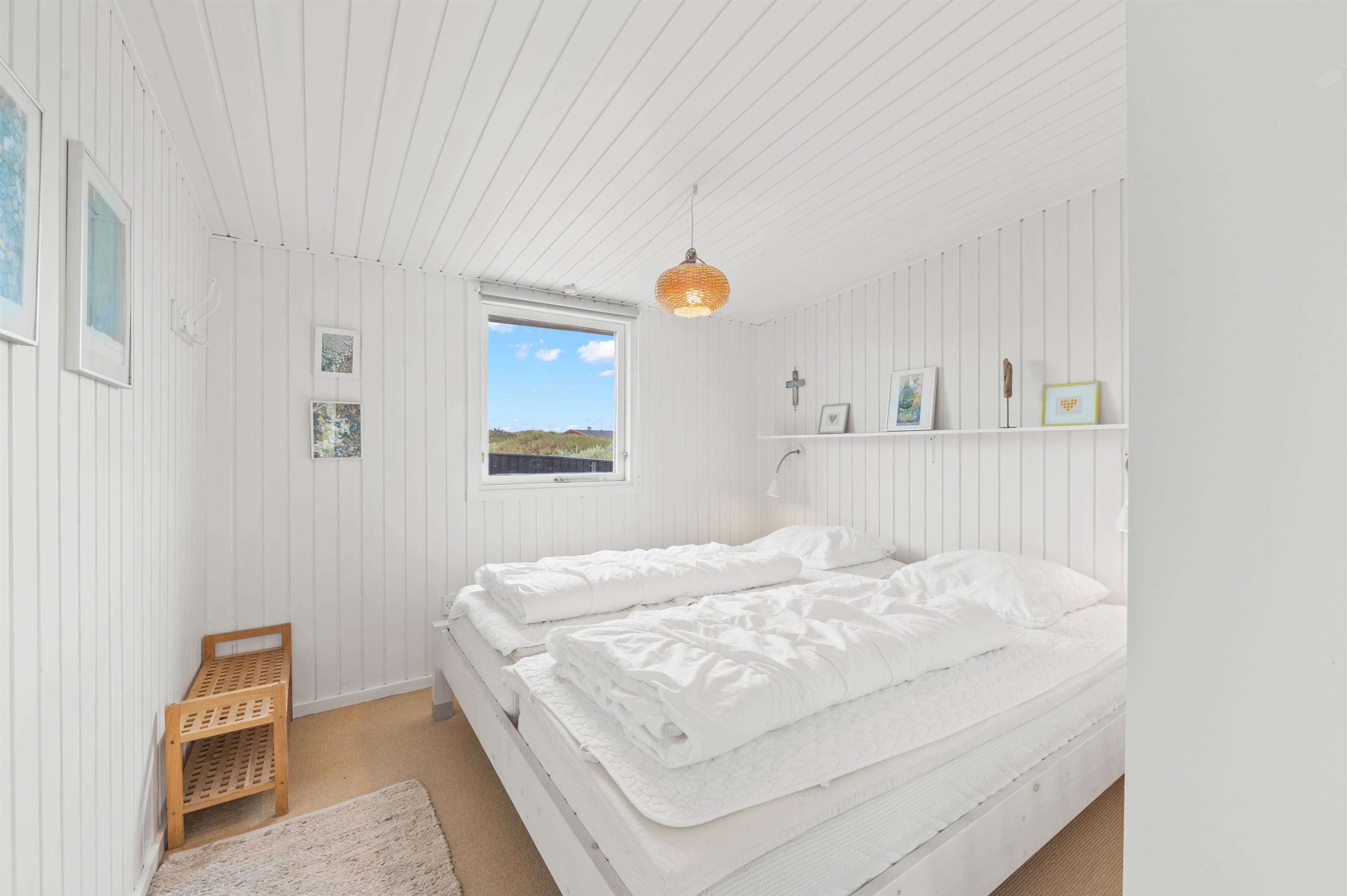 Indvendigt er feriehuset beklædt med hvidmalede træpaneler. Det indeholder et åbent og lyst køkken med forbindelse til stue med spiseplads, brændeovn og afslapningshjørne, hvor du er tæt på den vestjyske natur. Der er et dejligt badeværelse med gulvvarme samt et ekstra gæstetoilet. Sommerhuset har et soveværelse med dobbeltseng og 2 værelser med enkeltsenge. Her er plads til ophold og hygge for den lille familie eller vennegruppe.
