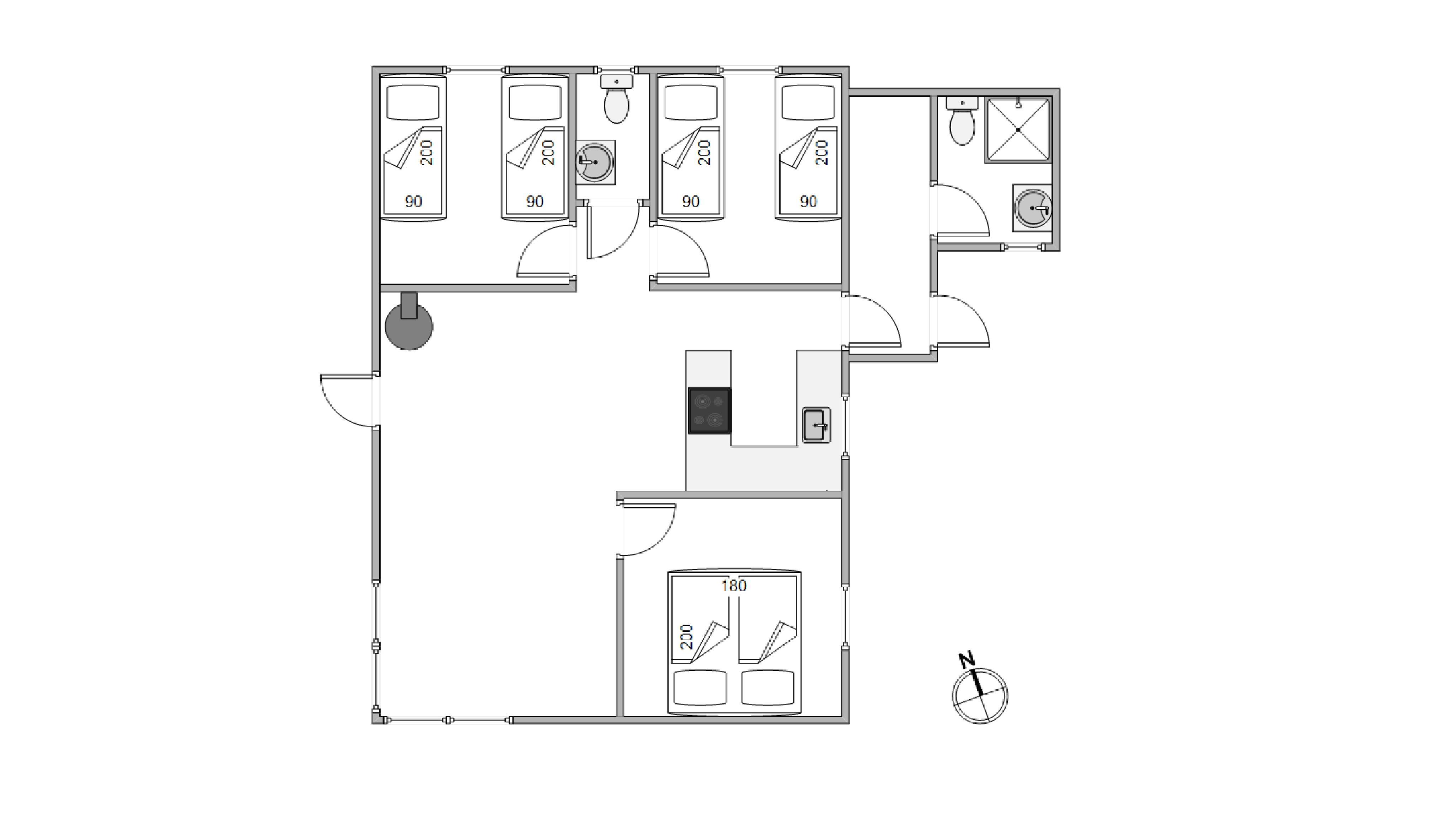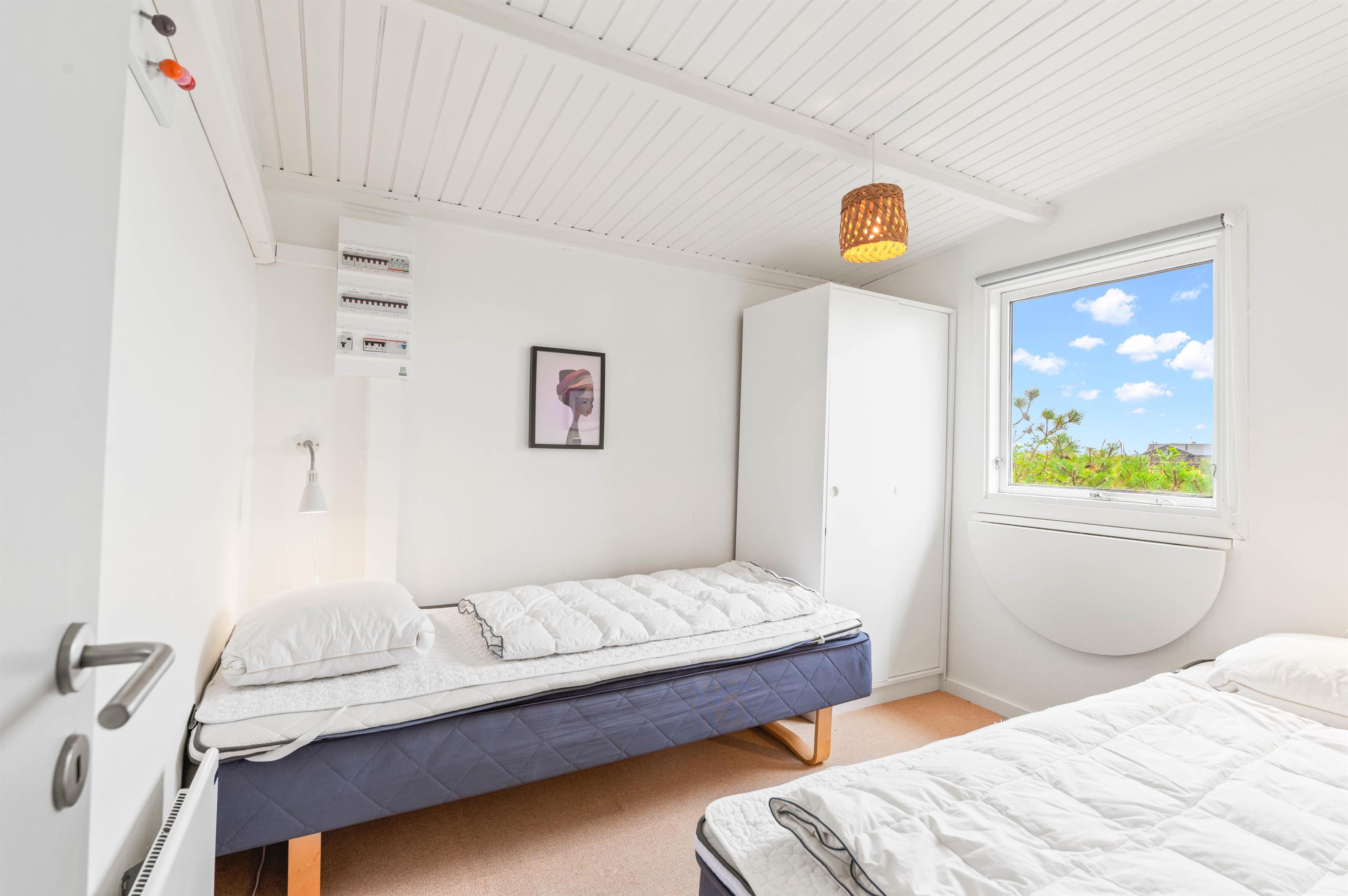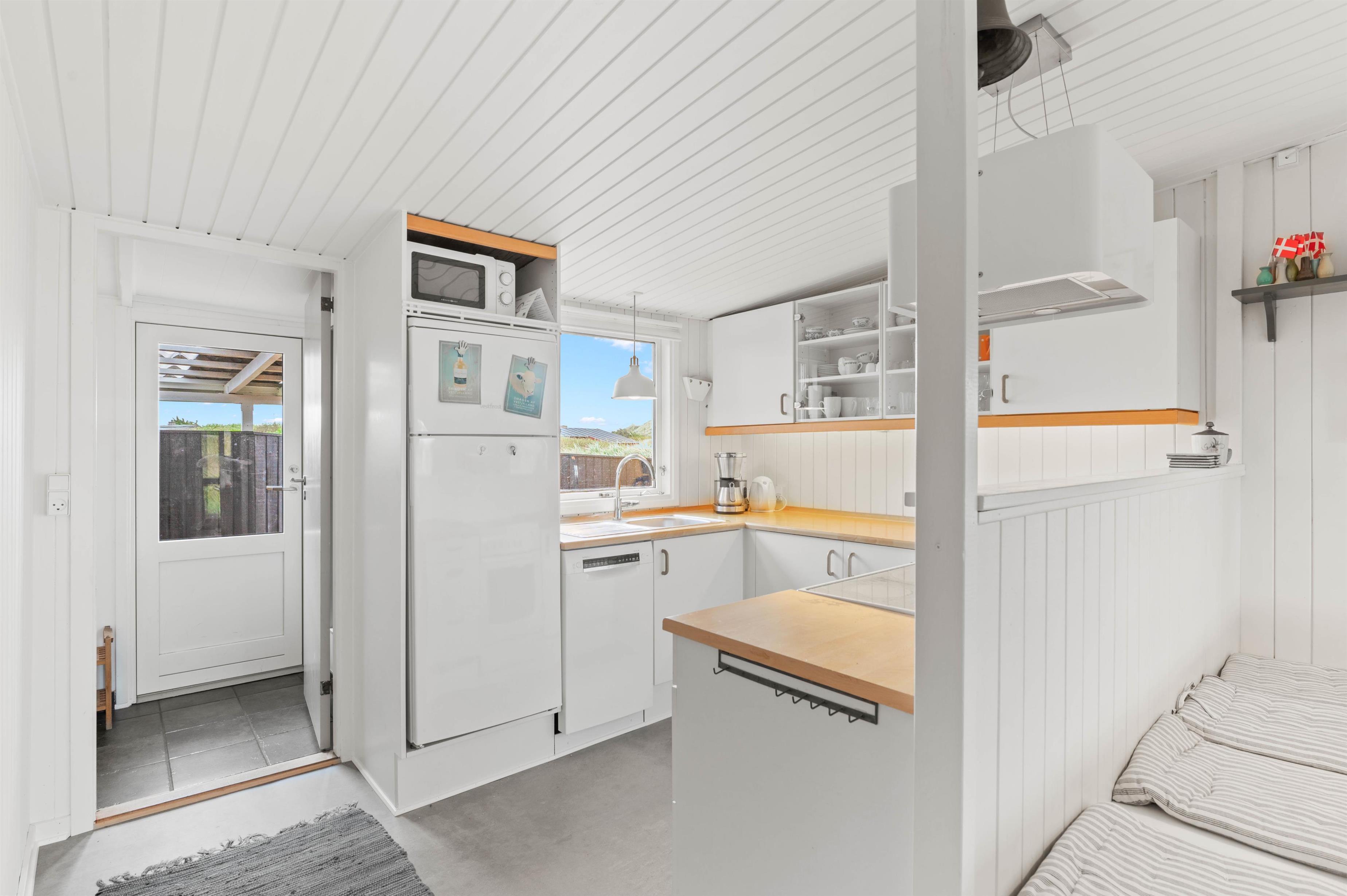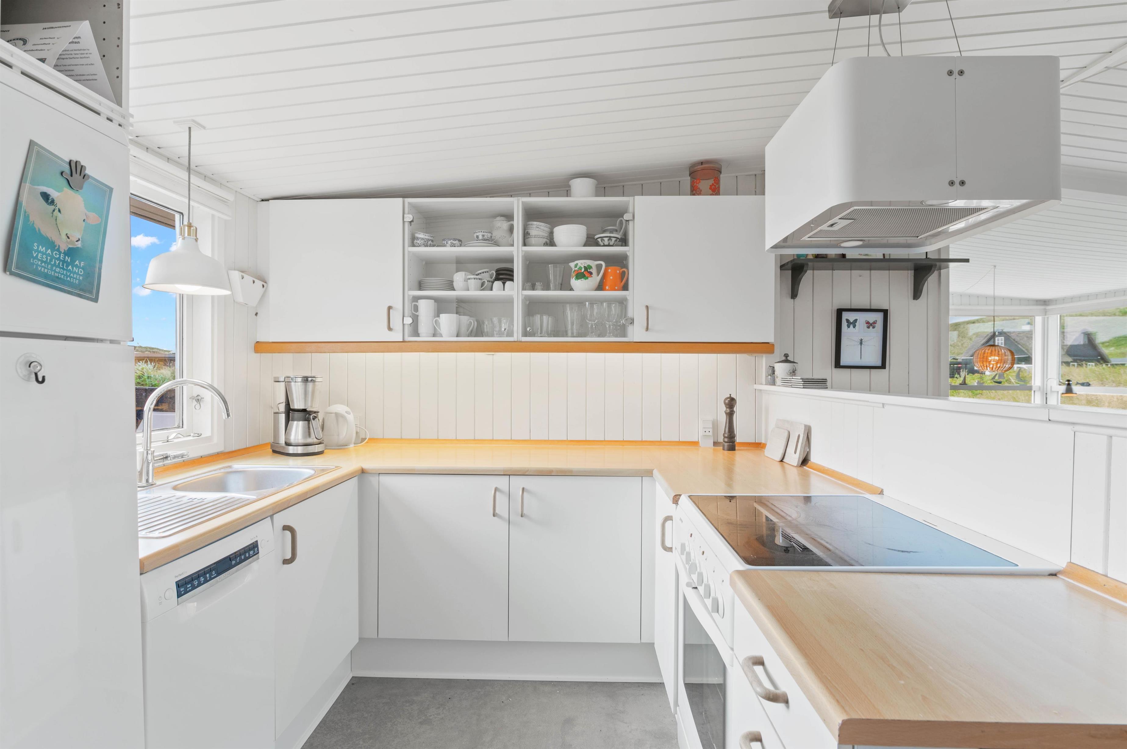 Indvendigt er feriehuset beklædt med hvidmalede træpaneler. Det indeholder et åbent og lyst køkken med forbindelse til stue med spiseplads, brændeovn og afslapningshjørne, hvor du er tæt på den vestjyske natur. Der er et dejligt badeværelse med gulvvarme samt et ekstra gæstetoilet. Sommerhuset har et soveværelse med dobbeltseng og 2 værelser med enkeltsenge. Her er plads til ophold og hygge for den lille familie eller vennegruppe.