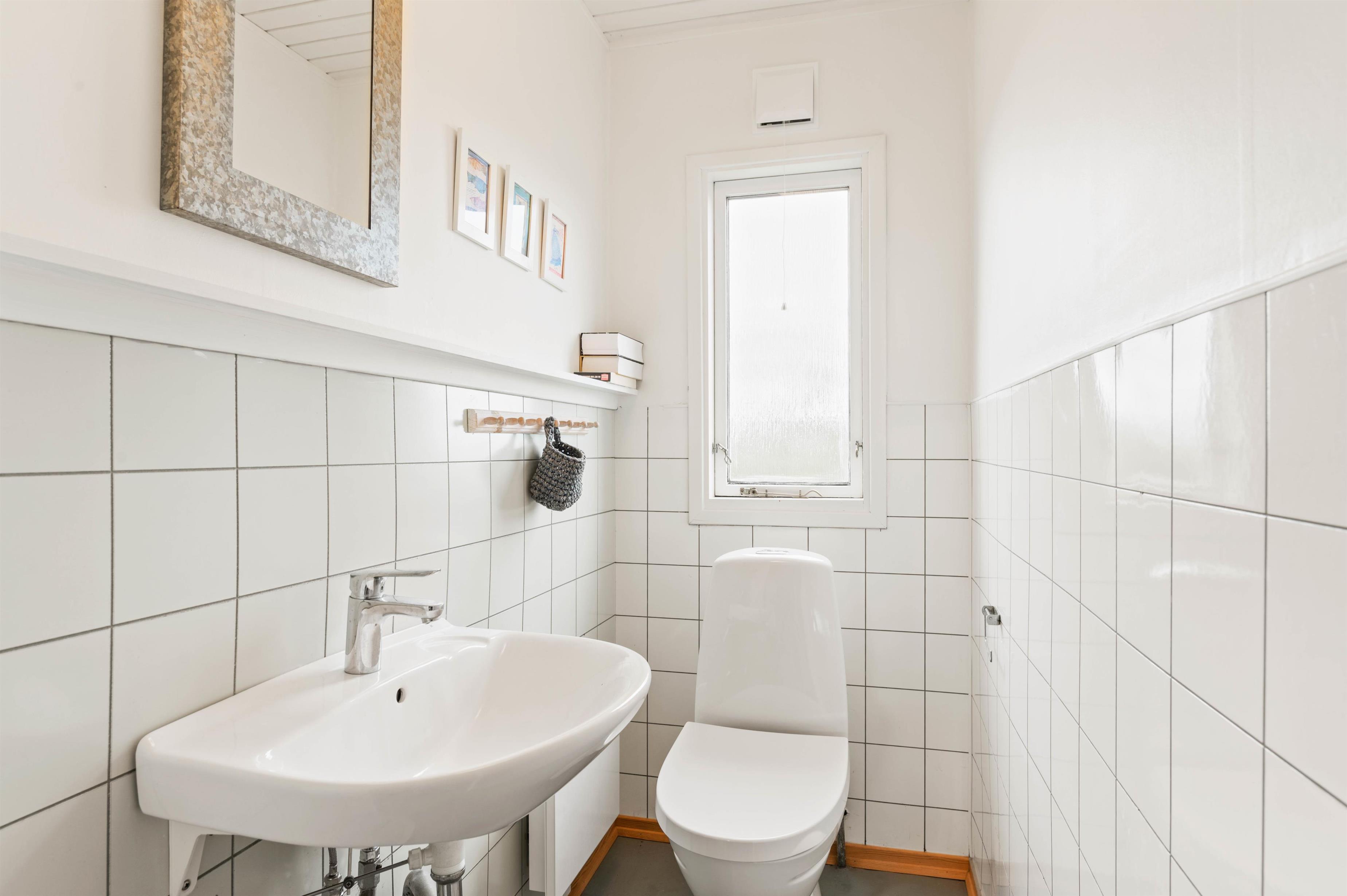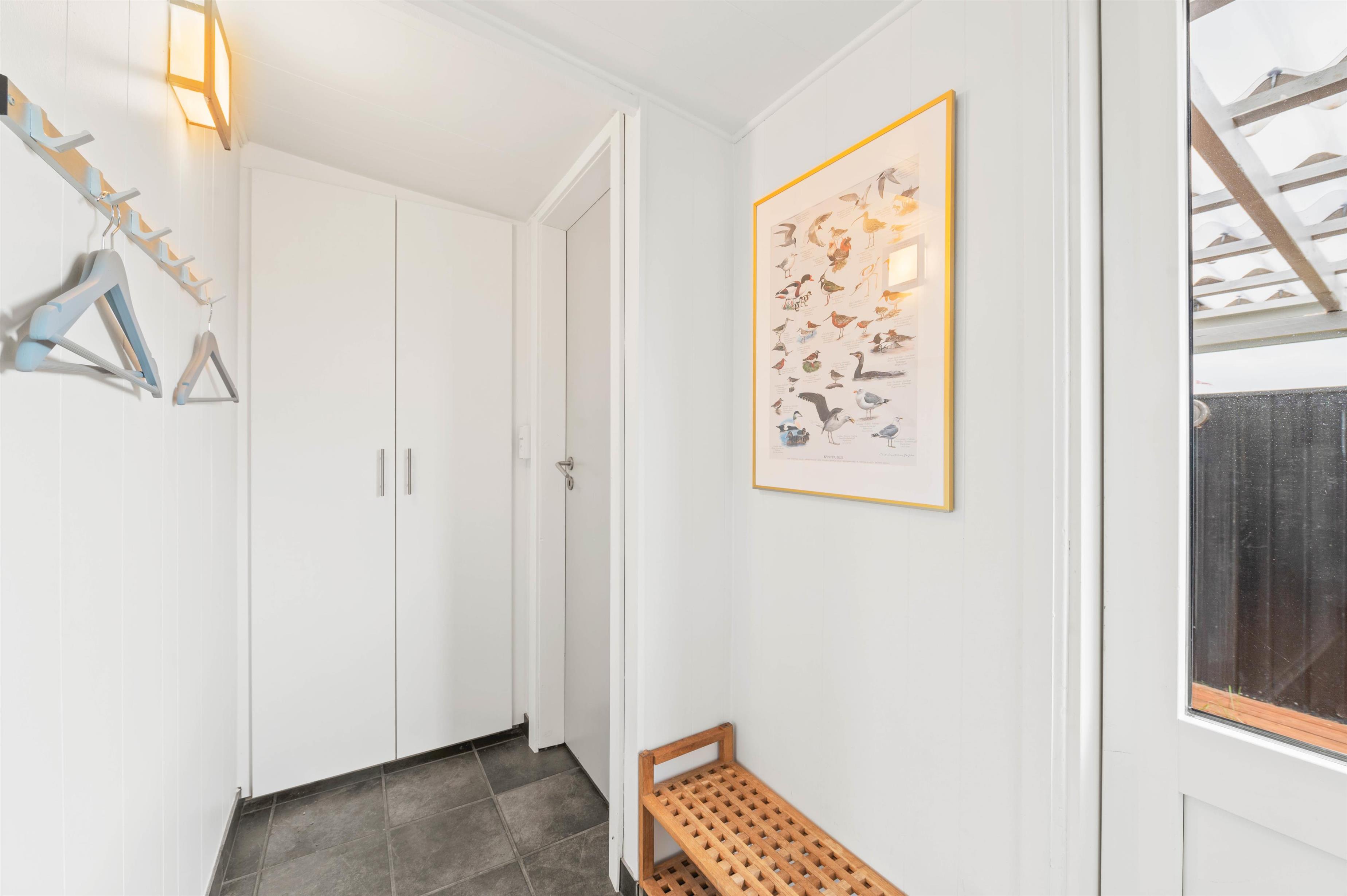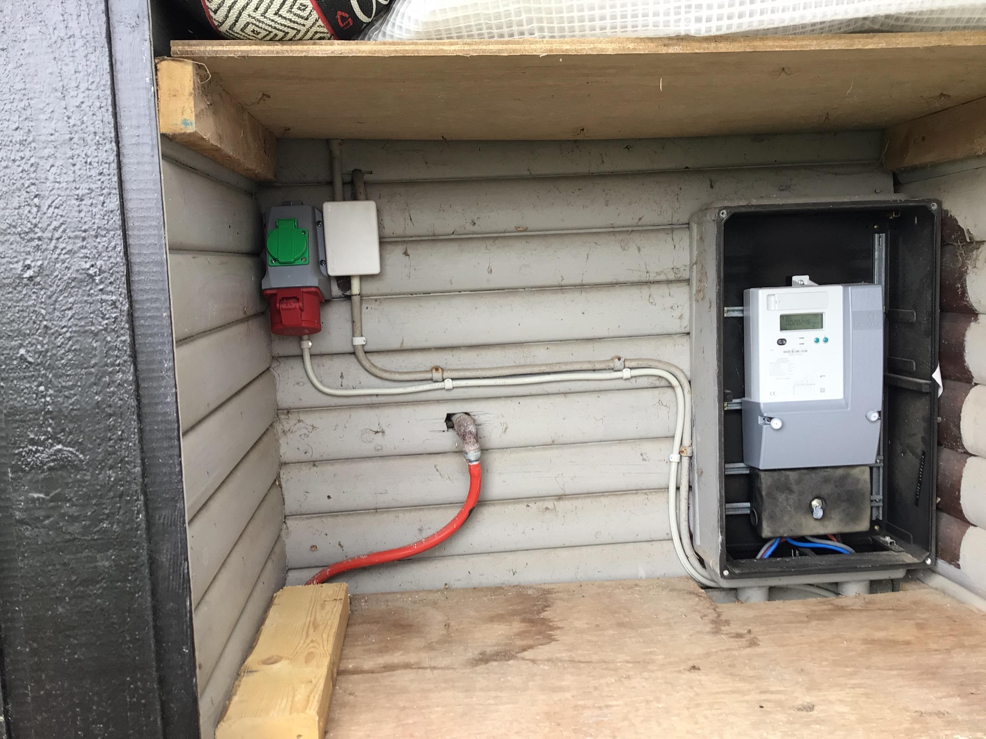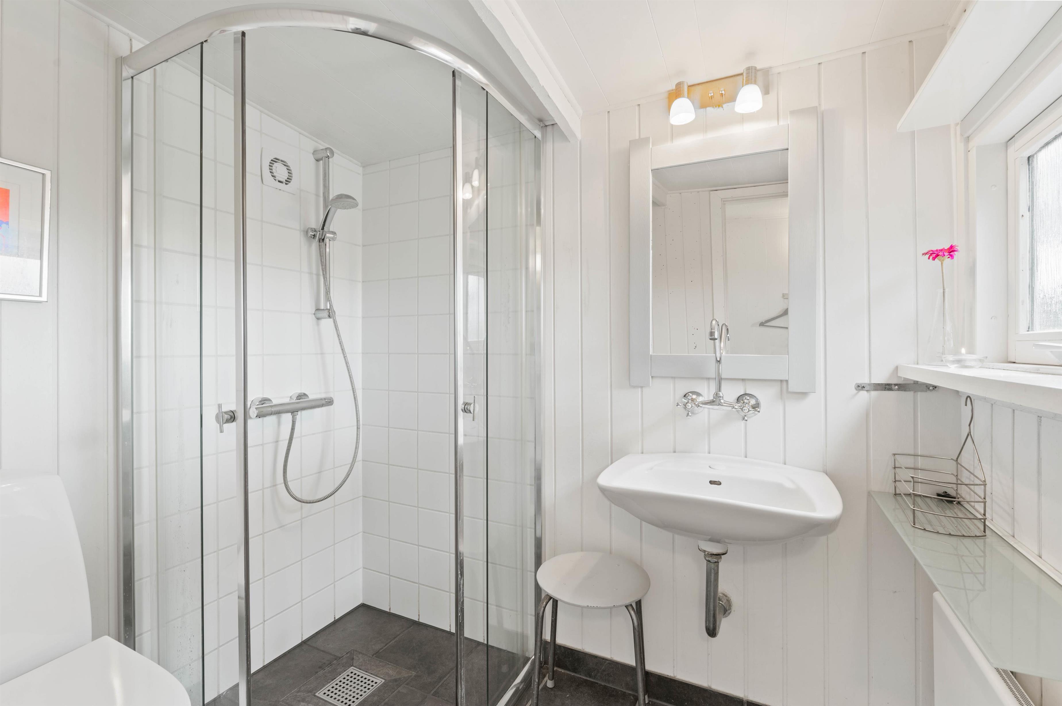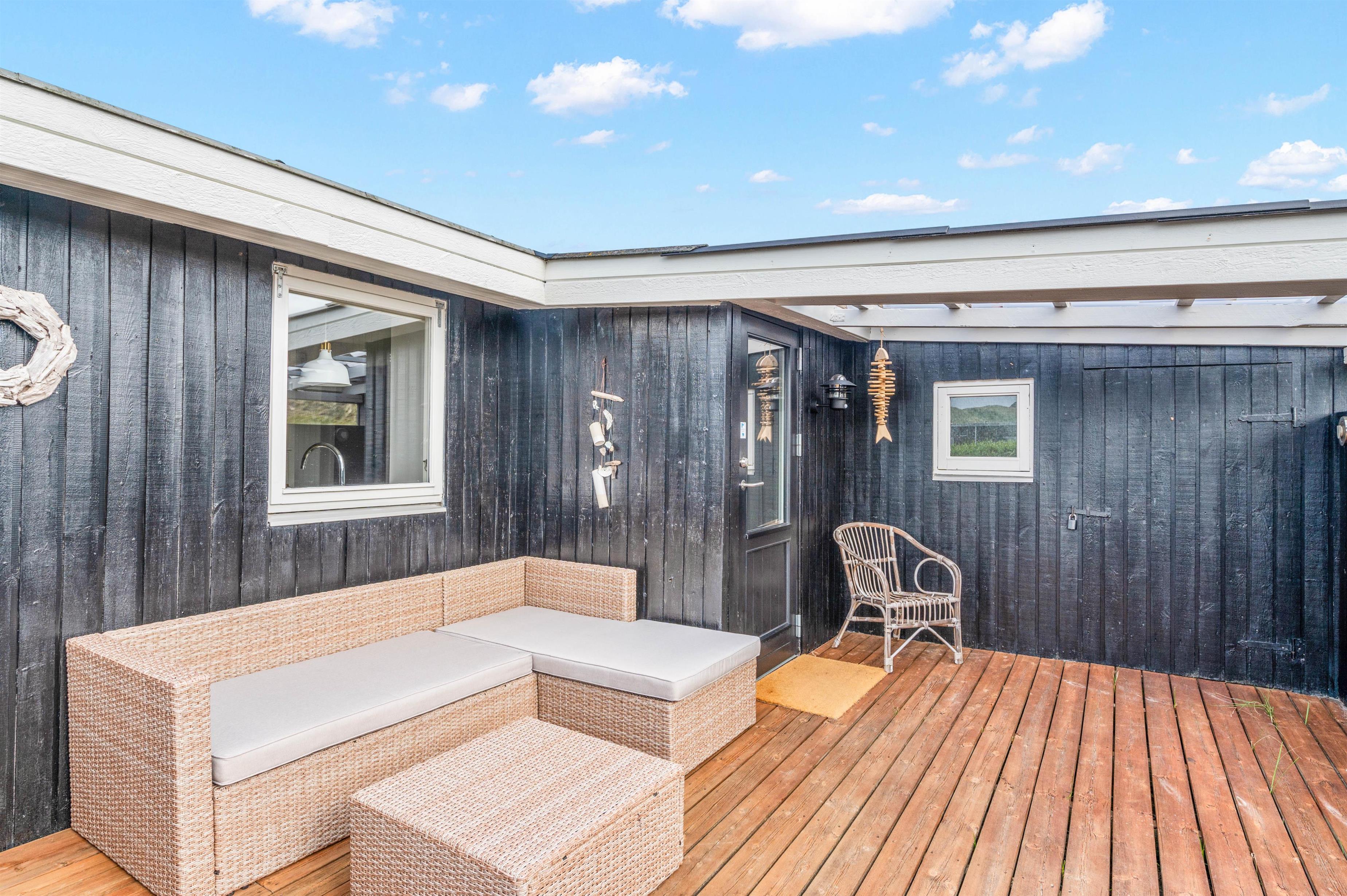 Fra stuen er der udgang til en åben terrasse med endnu en spiseplads og grill. Der er således siddepladser både nord-, syd-, øst og vest for feriehuset, så der vil altid være en plads med læ for vinden. Feriehuset rummer også redskabsrum og ladestander til elbil.