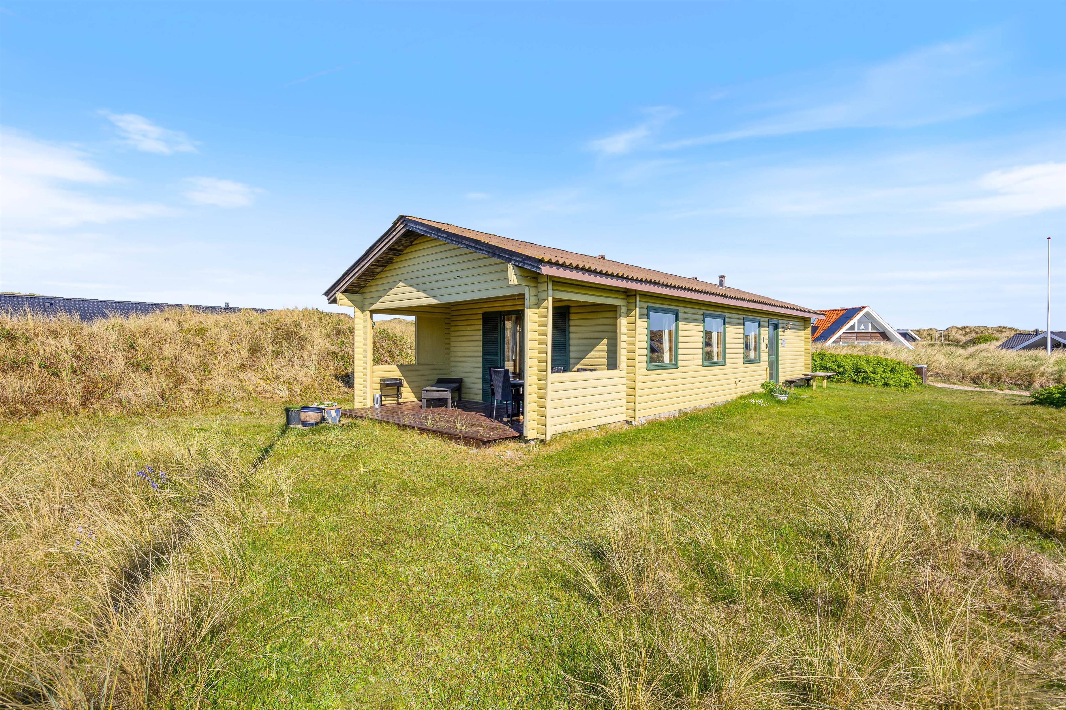 Udenfor venter en fantastisk naturgrund med en skøn udsigt udover klitterne – det skønneste sted at finde ro. Terrassen er både afskærmet og overdækket - perfekt til læ og privatliv samt en kop kaffe i skyggen. Her er der havemøbler og grill, så I både har mulighed for at slappe af udenfor samt mulighed for at rykke aftensmaden udenfor.