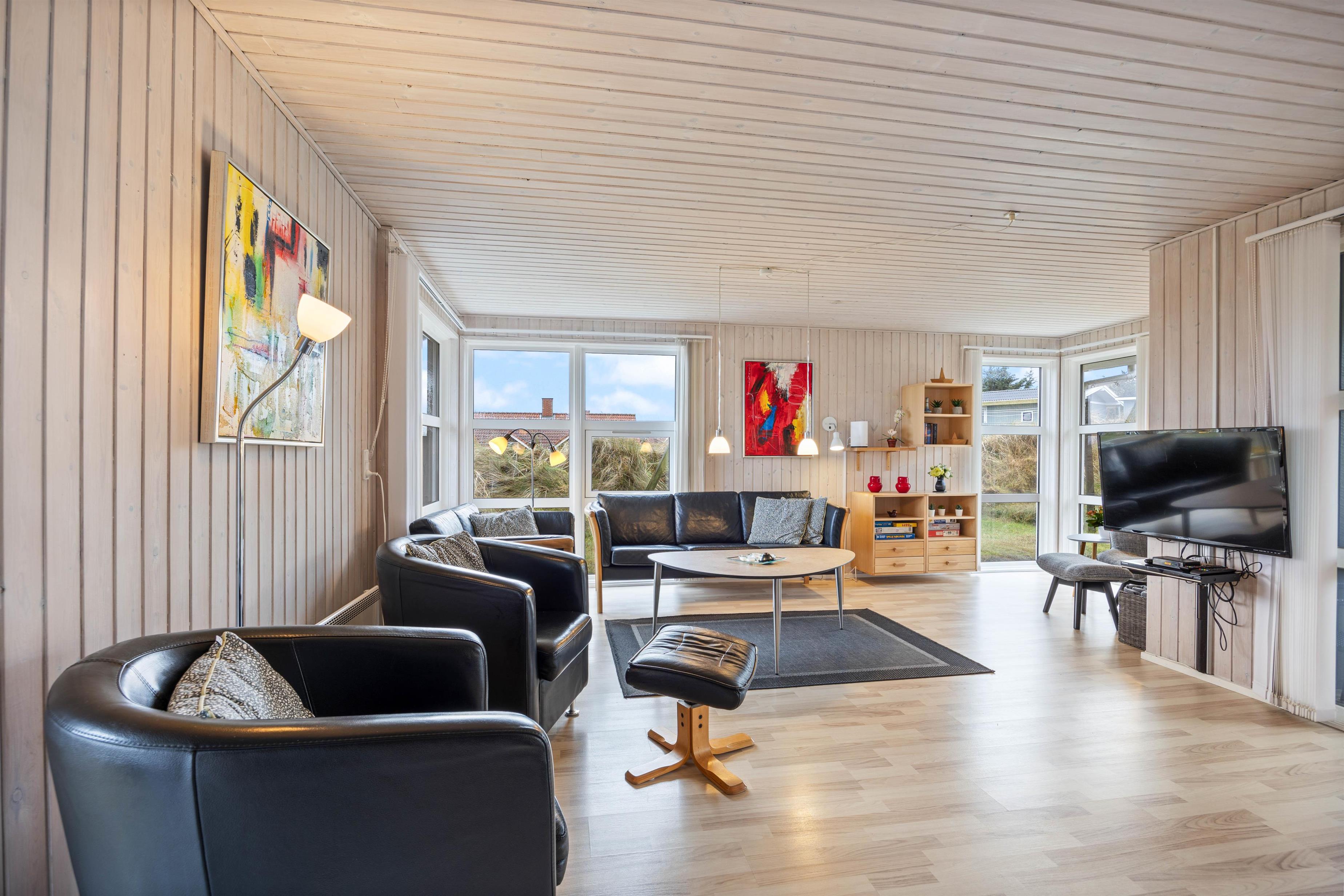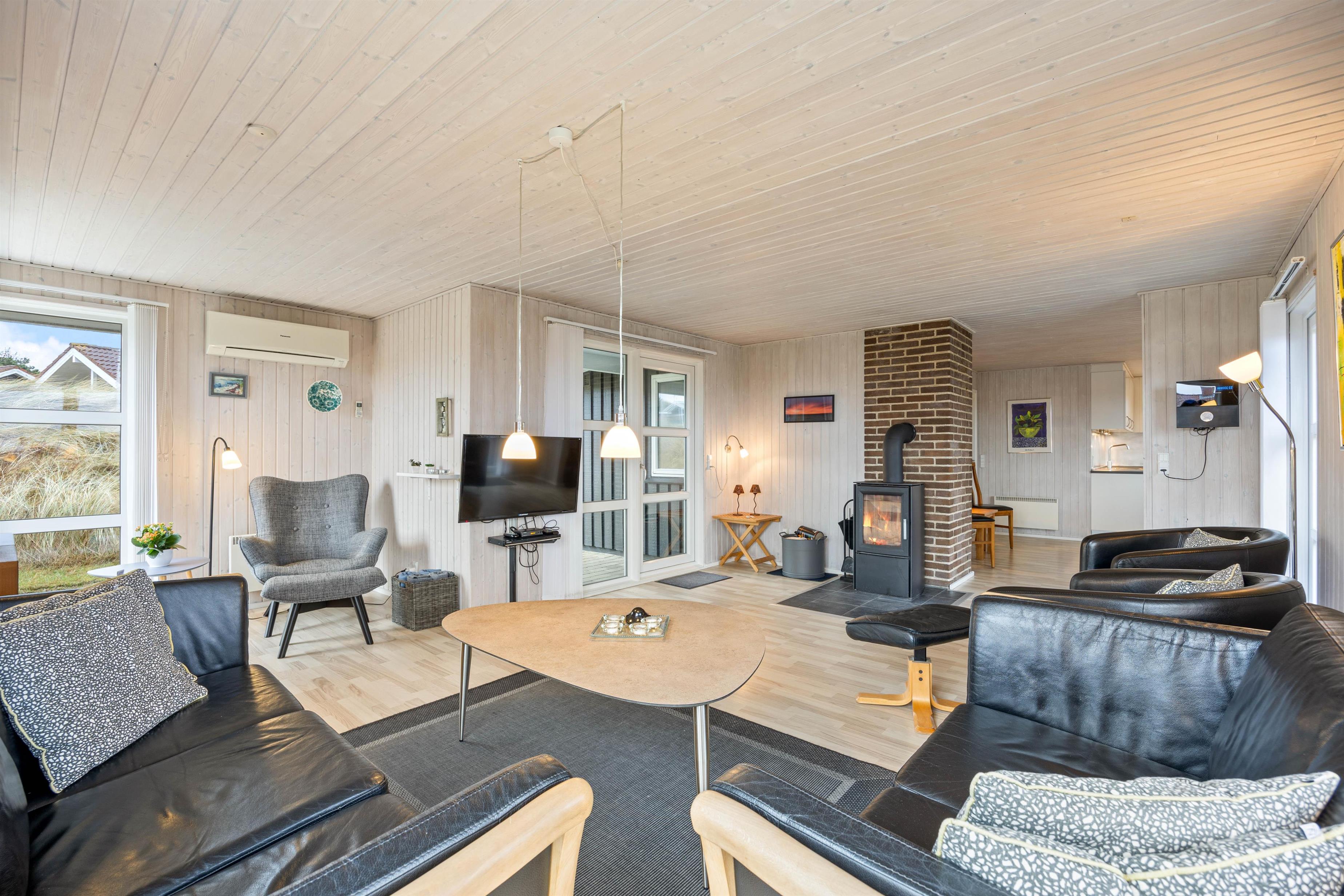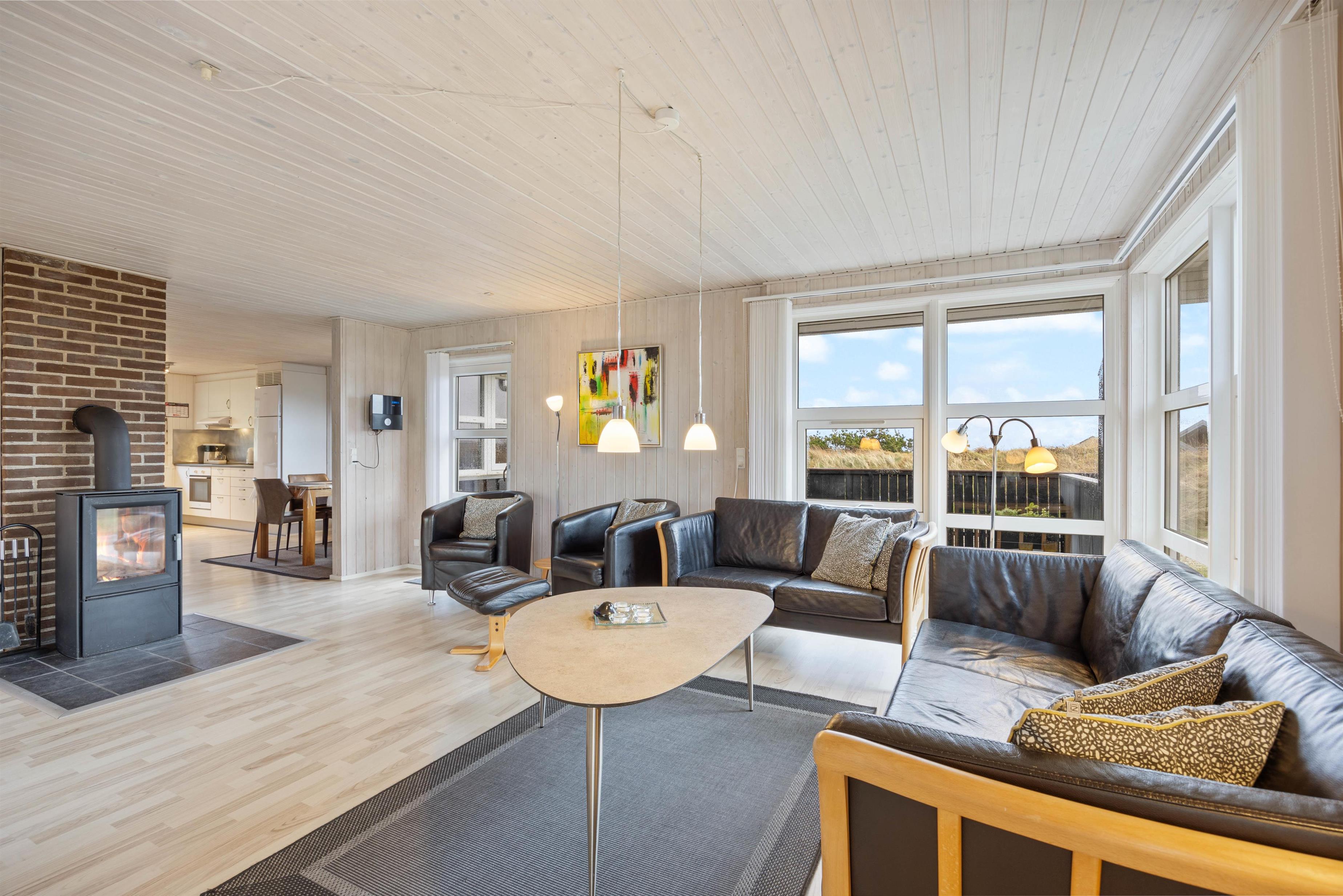 Den hyggelige stue har store vinduespartier, som inviterer både solen og naturen indenfor, så I hele tiden fornemmer den flotte natur og sommerhusområdet omkring jer. På de lidt køligere dage kan I derfor betragte den betagende natur, selv om I tager en afslapningsdag med sofahygge, familiespil og varm kakao foran den knitrende ild i brændeovnen.