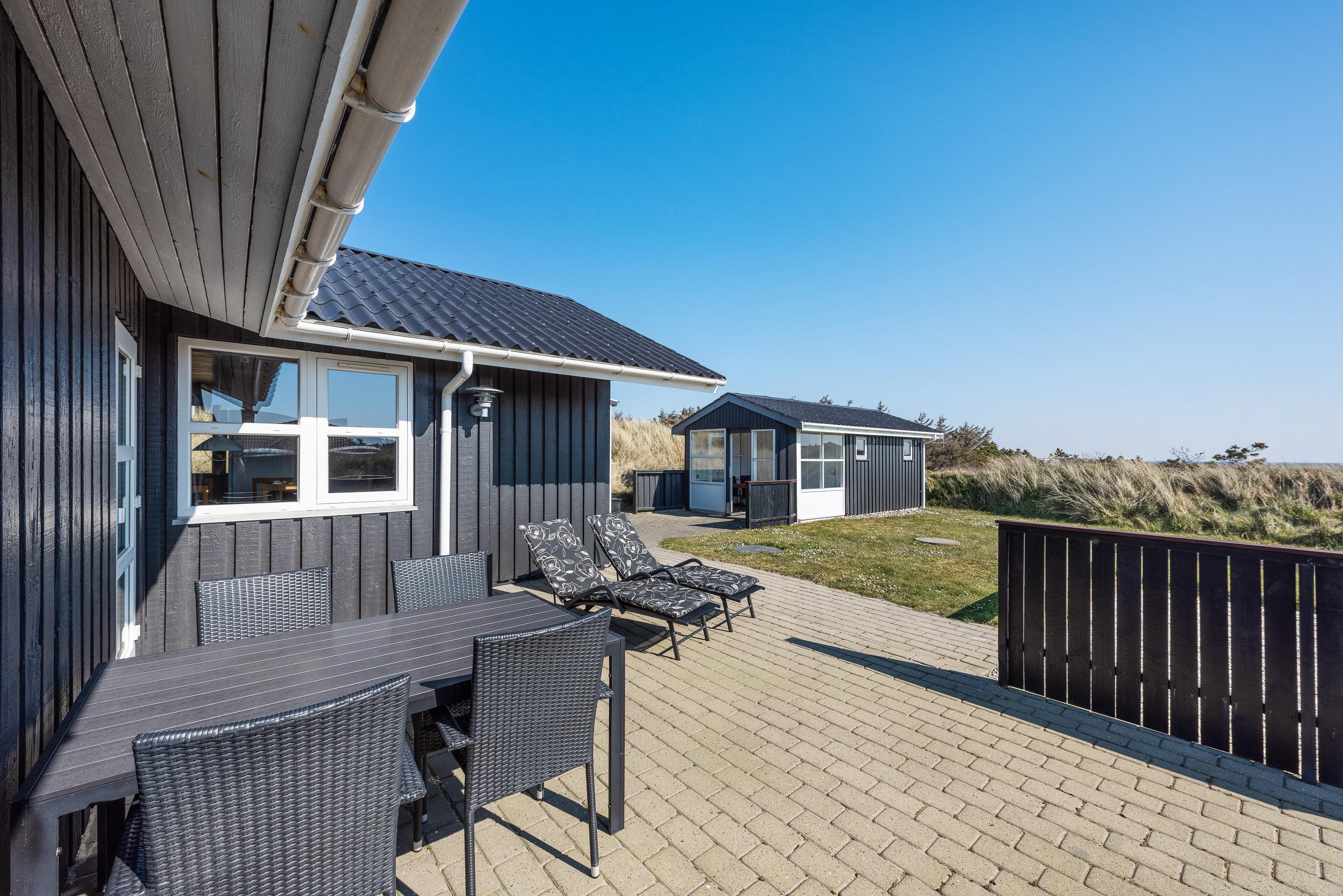 Nyd en veltilberedt grillmiddag på den sydvendte terrasse, mens solen går ned over klitterne, og himlen skifter farve fra orangerød til midnatsblå, med havets brusen i baggrunden.