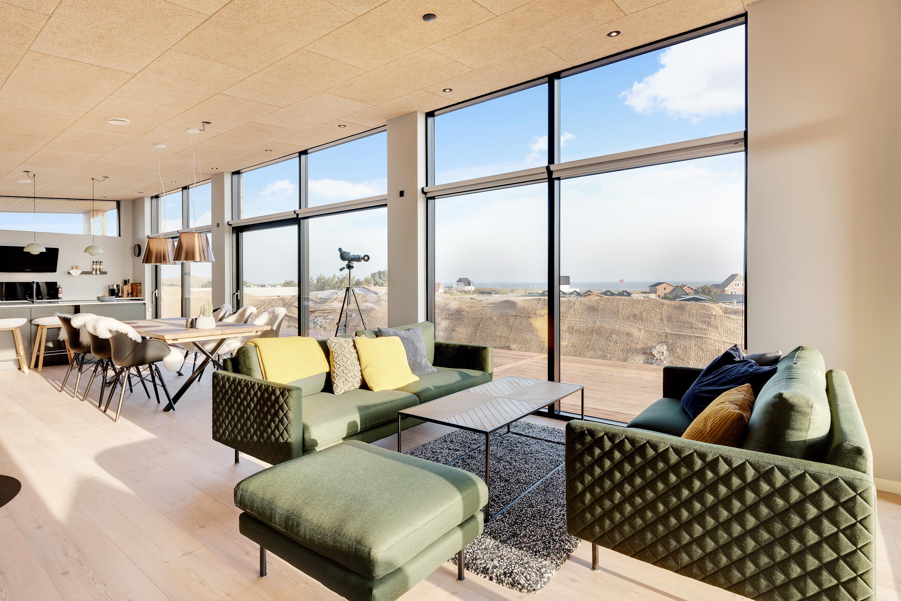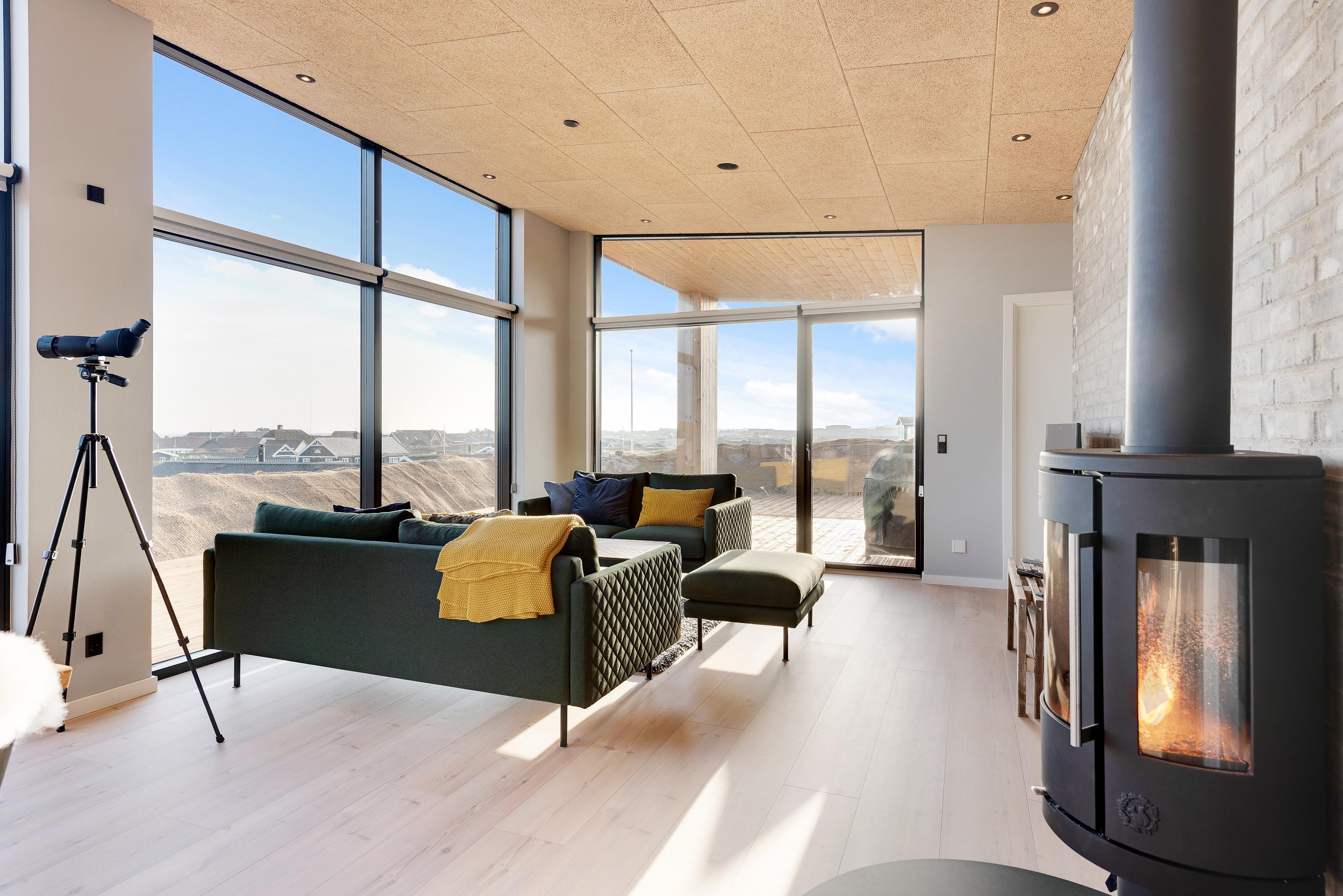 På de lidt køligere dage – eller efter en lang tur i klitterne, kan man nyde en god bog og en kop kaffe i sofahjørnet, foran den knitrende ild i brændeovnen, mens man nyder naturen indefra.