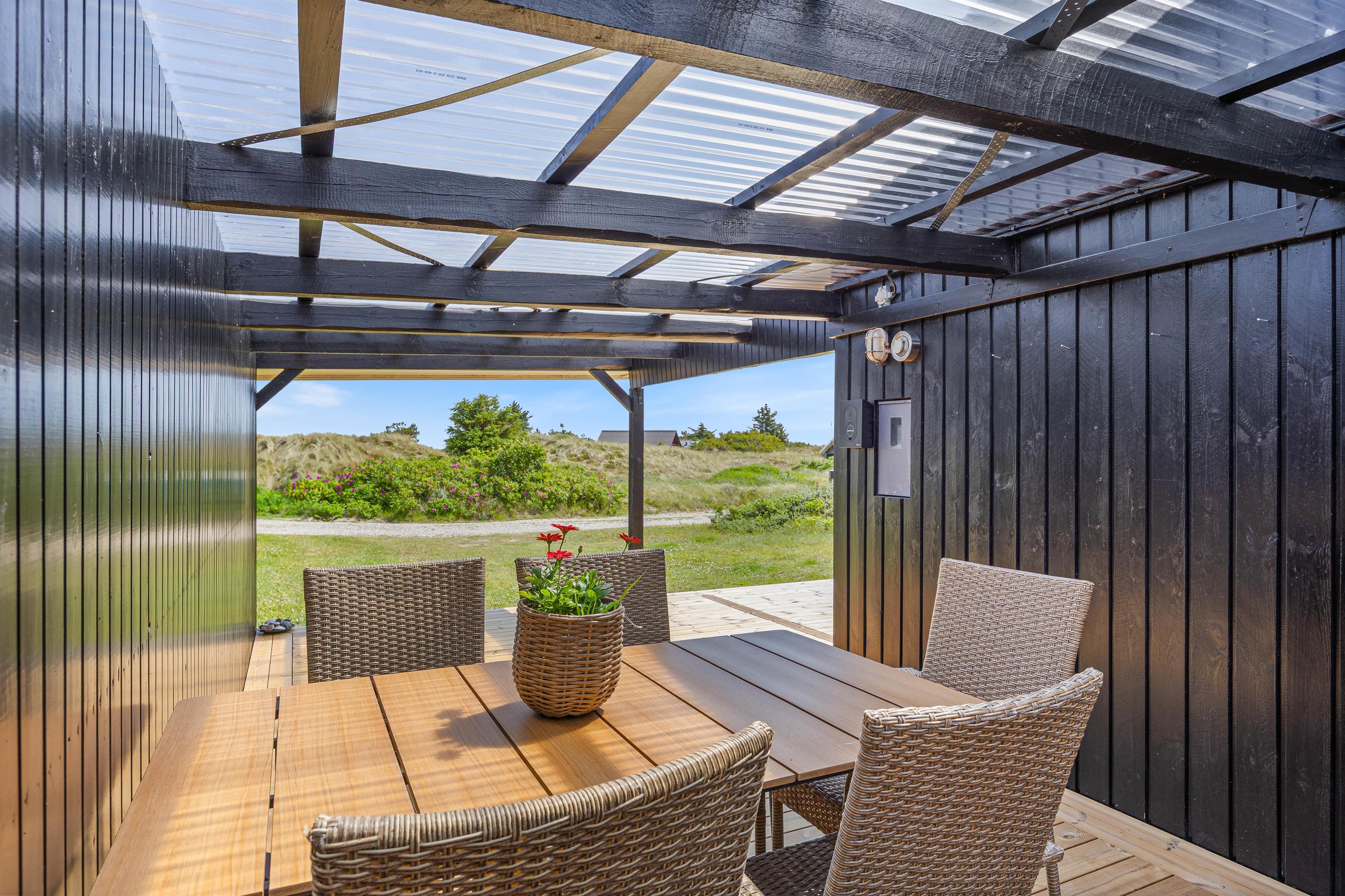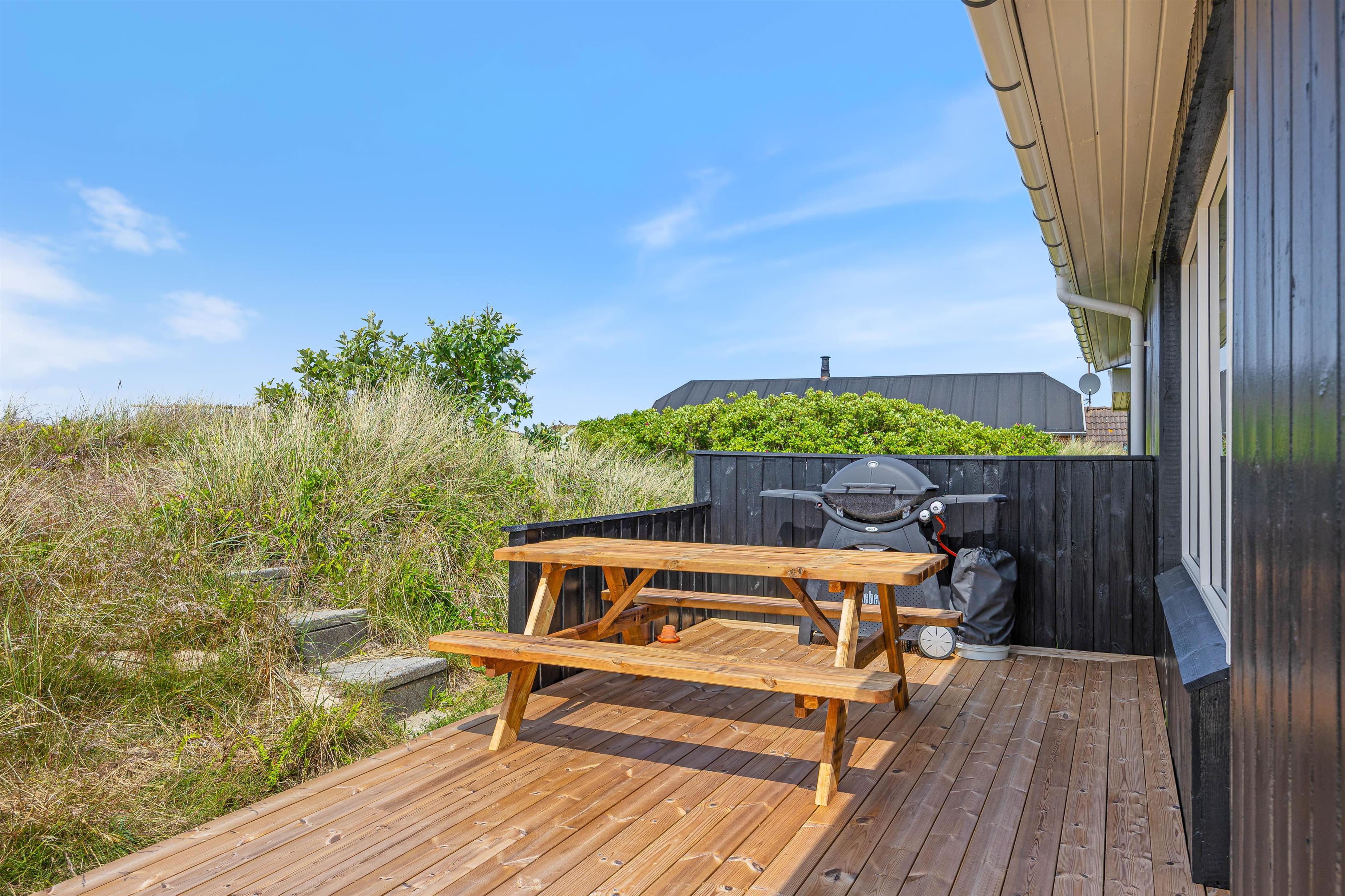 Udenfor finder I en dejlig afskærmet terrasse, som giver mulighed for at nyde solen i fred og ro. Den overdækkede del af terrassen er perfekt til de dage, hvor vejret er uforudsigeligt, men I stadig ønsker at tilbringe tid udendørs. Der er gode havemøbler og en grill på terrassen, så I kan slappe af og nyde udsigten eller et måltid under åben himmel.