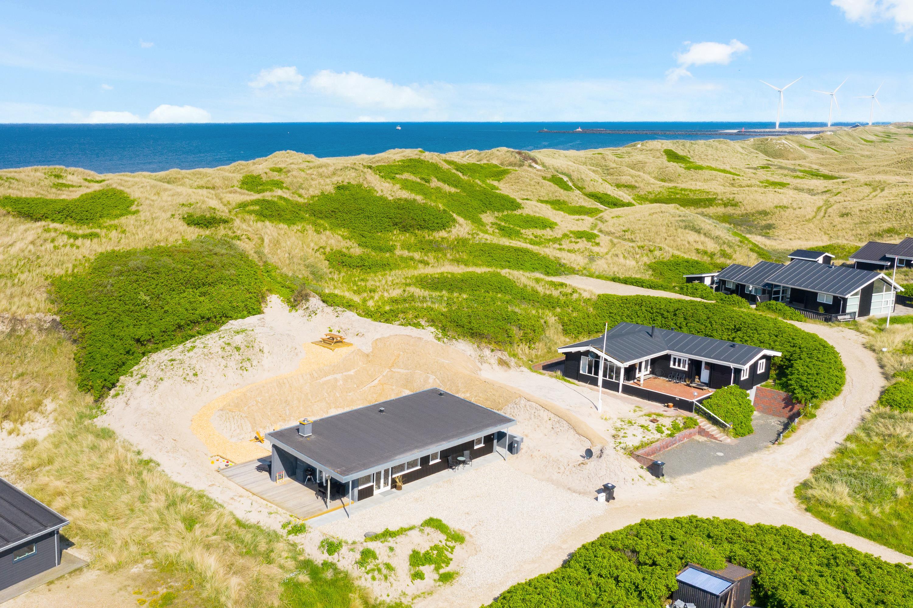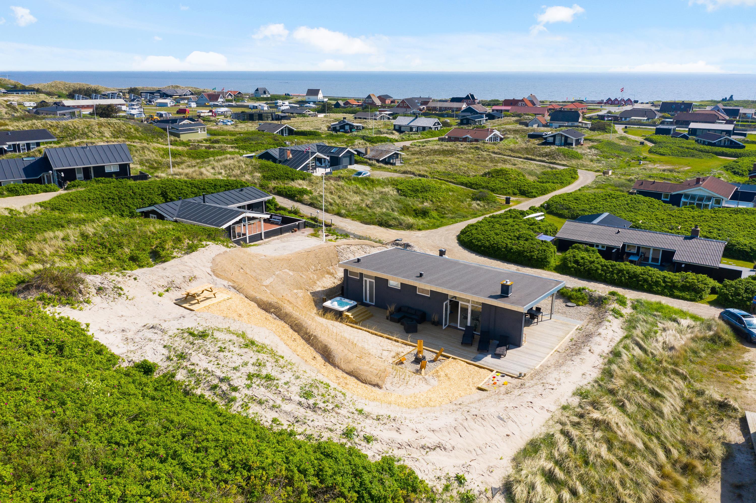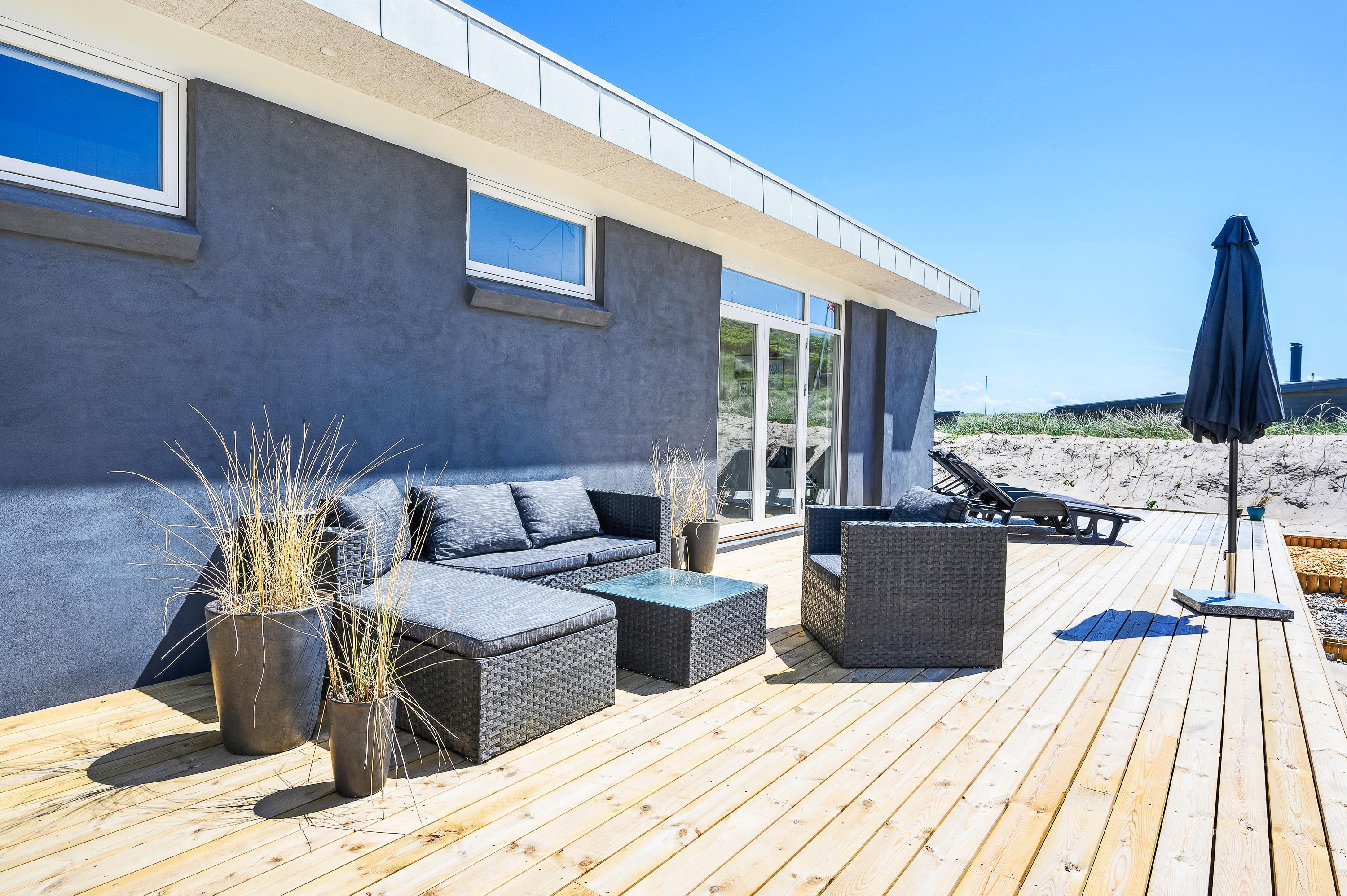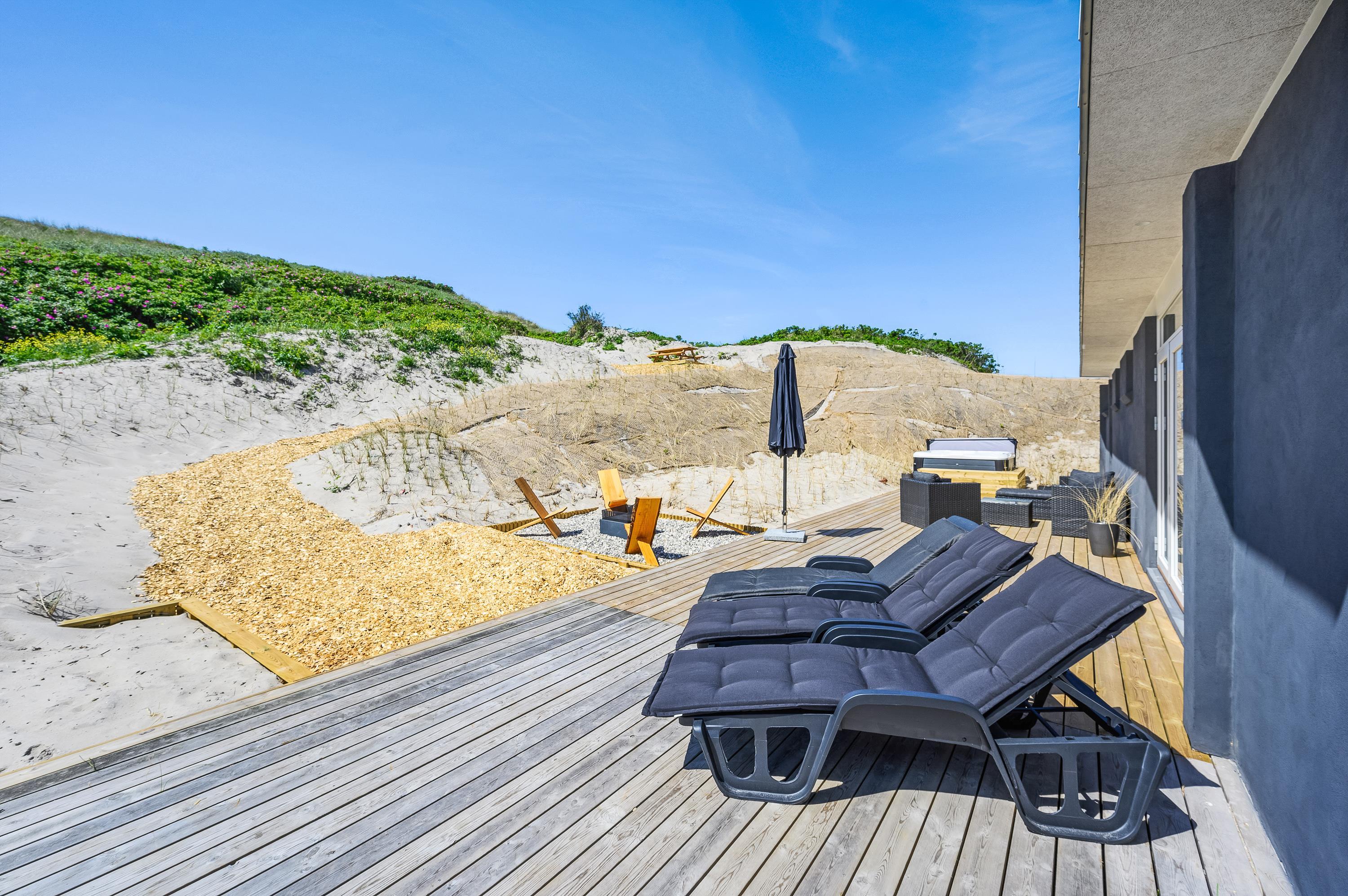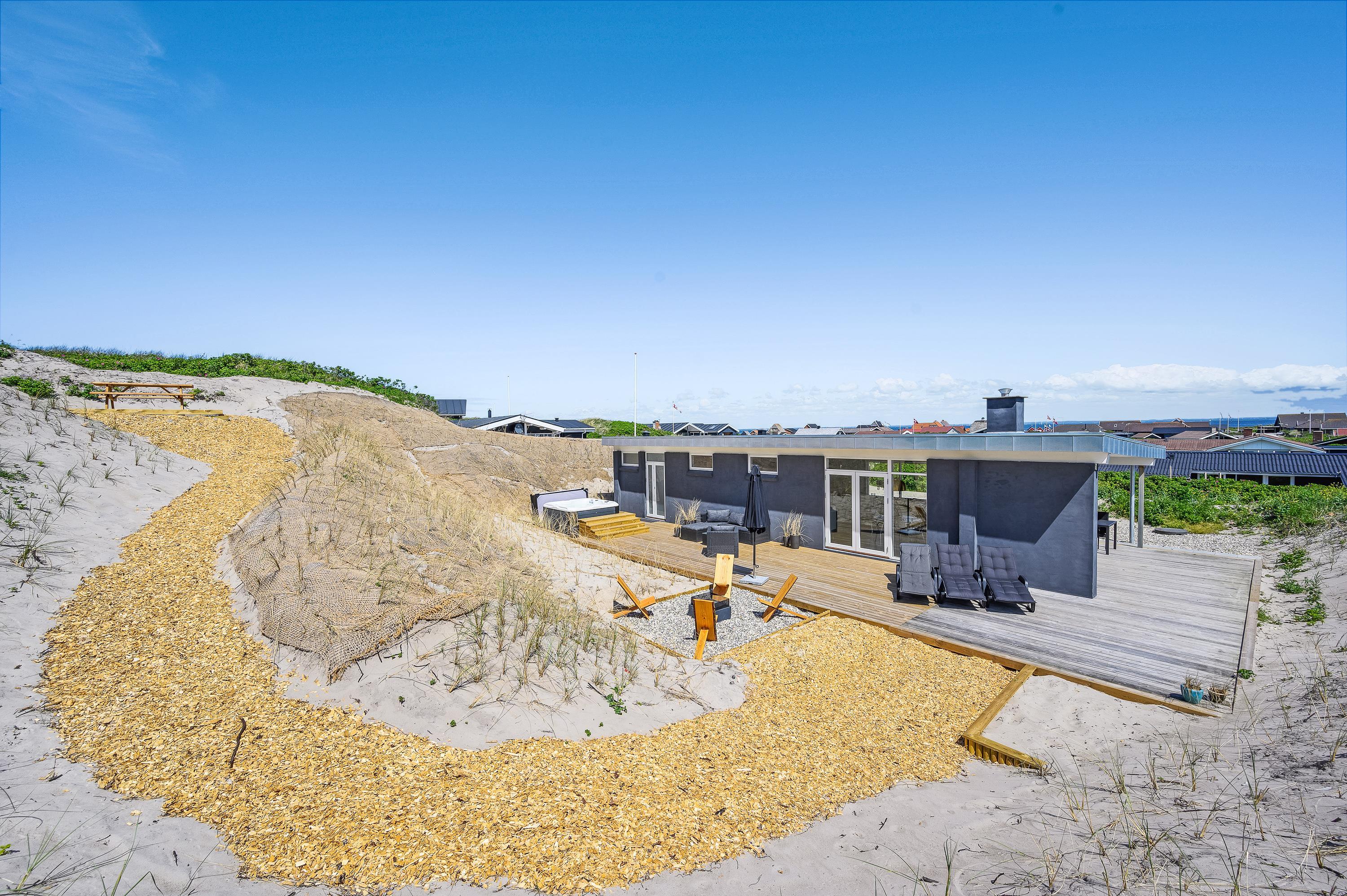 Med udgang fra stuen og husets badeværelse ligger den dejlige sydvestvendte træterrasse. Det lækre udendørs spabad, der er belejligt placeret ud for badeværelset, sætter prikken over i’et og indbyder til skønne wellnessoplevelser året rundt. Med feriehusets unikke placering på en naturgrund op til klitten er der lagt op til privatliv, og I kan ugeneret fylde sanserne med udsigt til smuk natur og havets brusen i baggrunden, mens bøffen steger på grillen. Skulle lyden af havet virke tiltrækkende, skal I bare et smut på 50 meter op over klitten, og så er I på stranden. Her kan I nyde de smukke solnedgange året rundt.