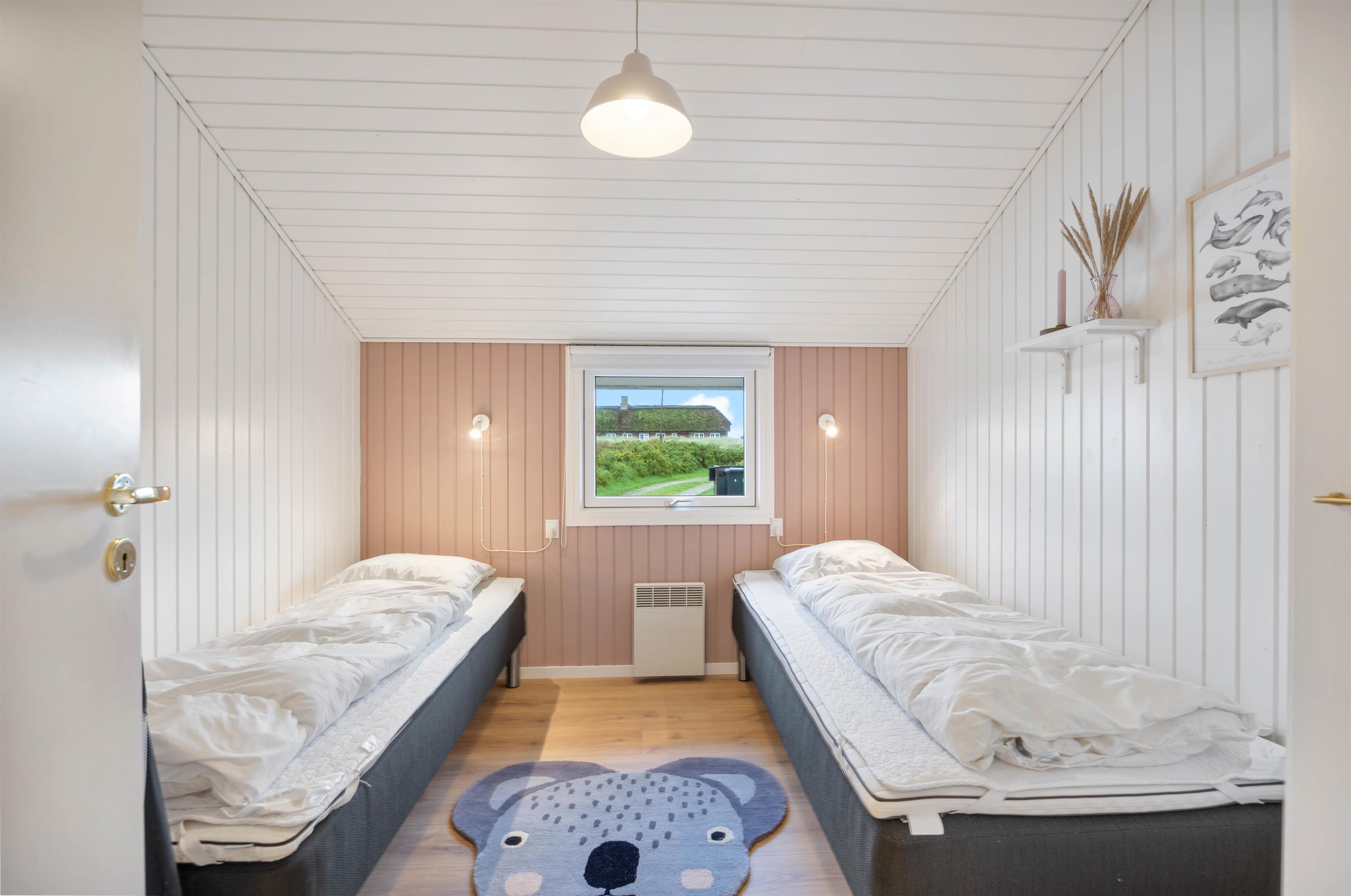 Sommerhusets 6 sovepladser fordeler sig på i alt 3 soveværelser, som heraf er indrettet med 2 dobbeltsenge og 2 enkeltsenge. Værelserne fremstår både lyse og rolige i indretningen, og derfor vil I helt sikkert kunne nyde en afslappende nats søvn. Sommerhuset har et badeværelse, hvoraf der både er gulvvarme og en sauna, som sørger for at I kan holde varmen på en kold vinterdag.