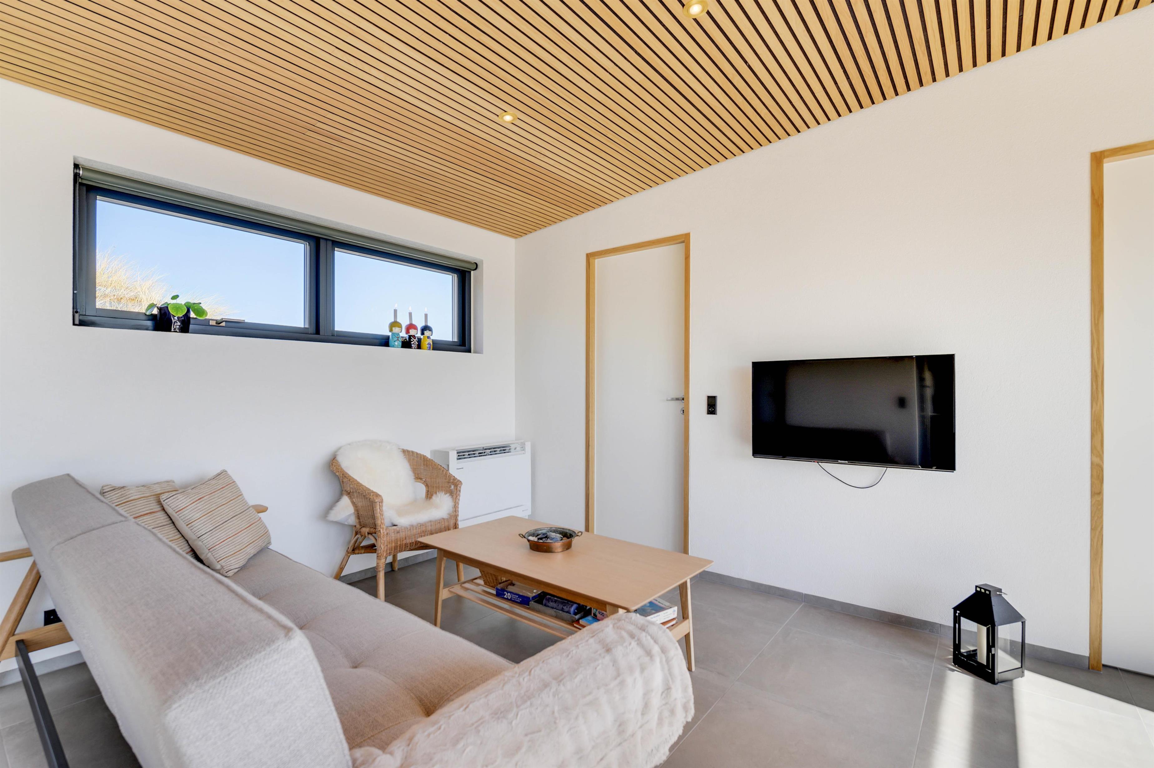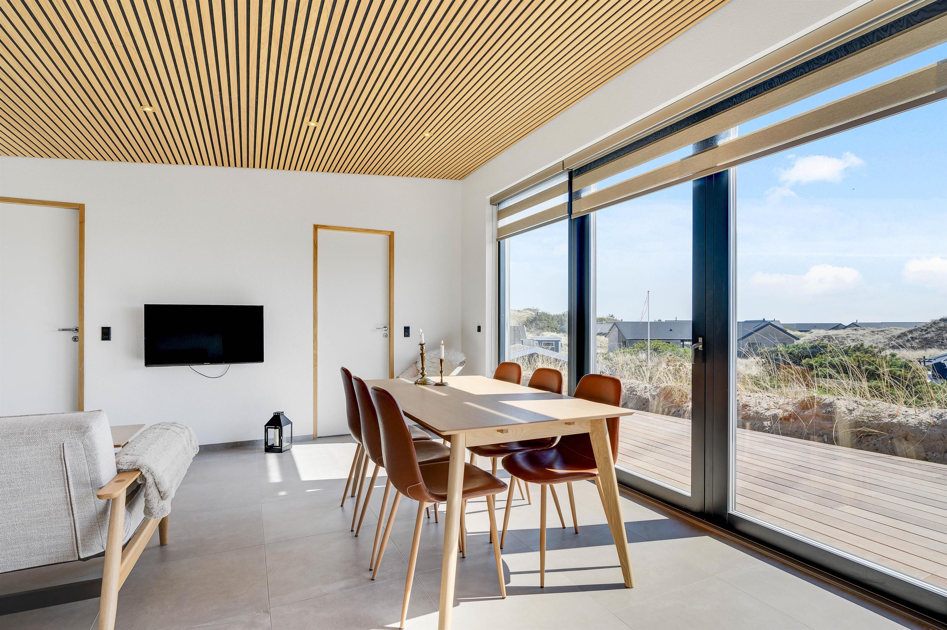Sommerhuset kendetegner sig ved sin moderne og stilrene indretning. Fra entréen er der indgang til det dejlige køkkenalrum, hvor de flotte trælofter og gulvklinker, der går igennem hele ferieboligen, danner rammen for hyggeligt samvær. Det store vinduesparti til sydøstvendt terrasse giver et smukt lysindfald, og udsigten kan nydes såvel inde som ude. Den praktiske varmepumpe sørger for en behagelig temperatur året rundt.