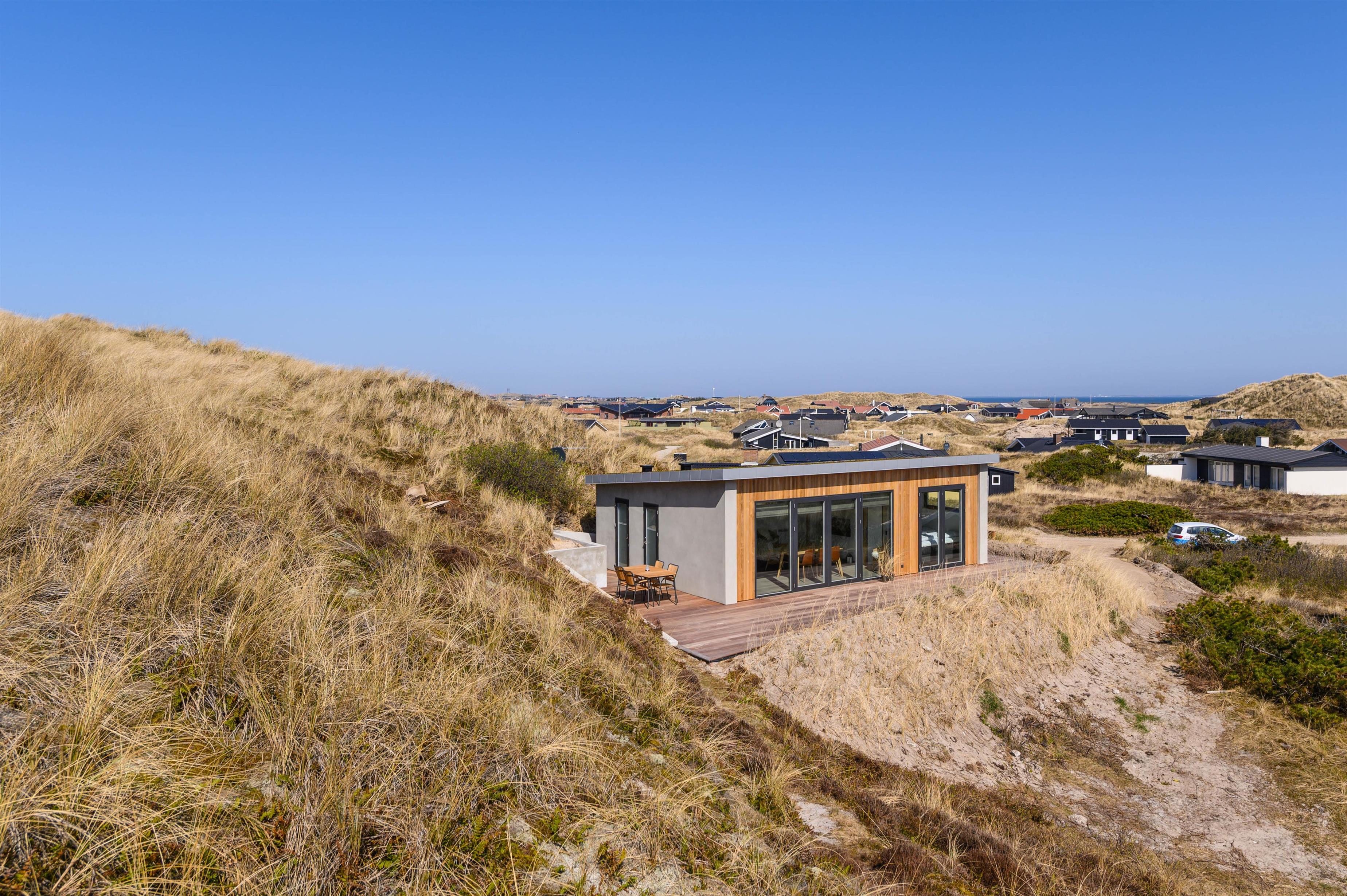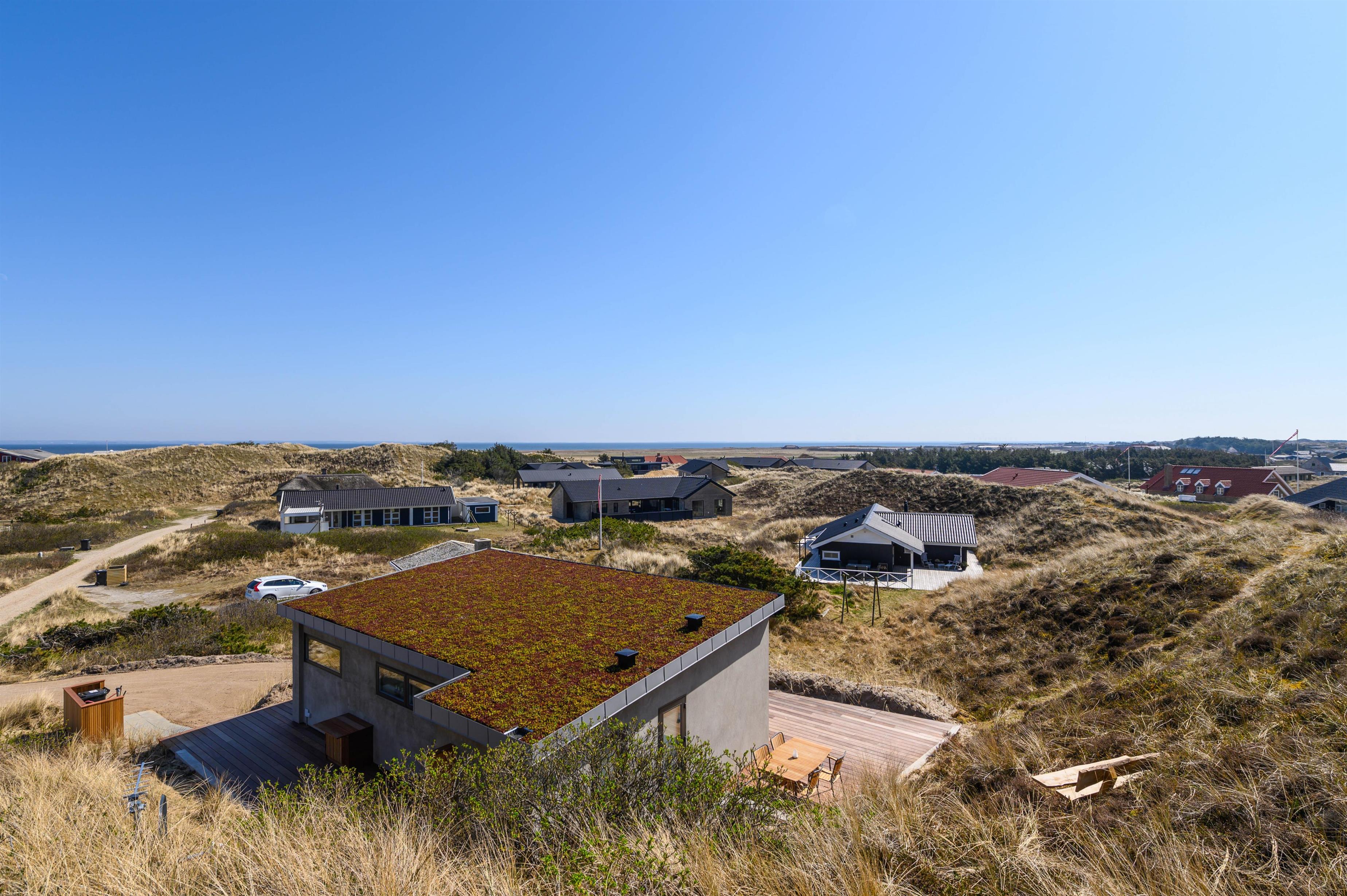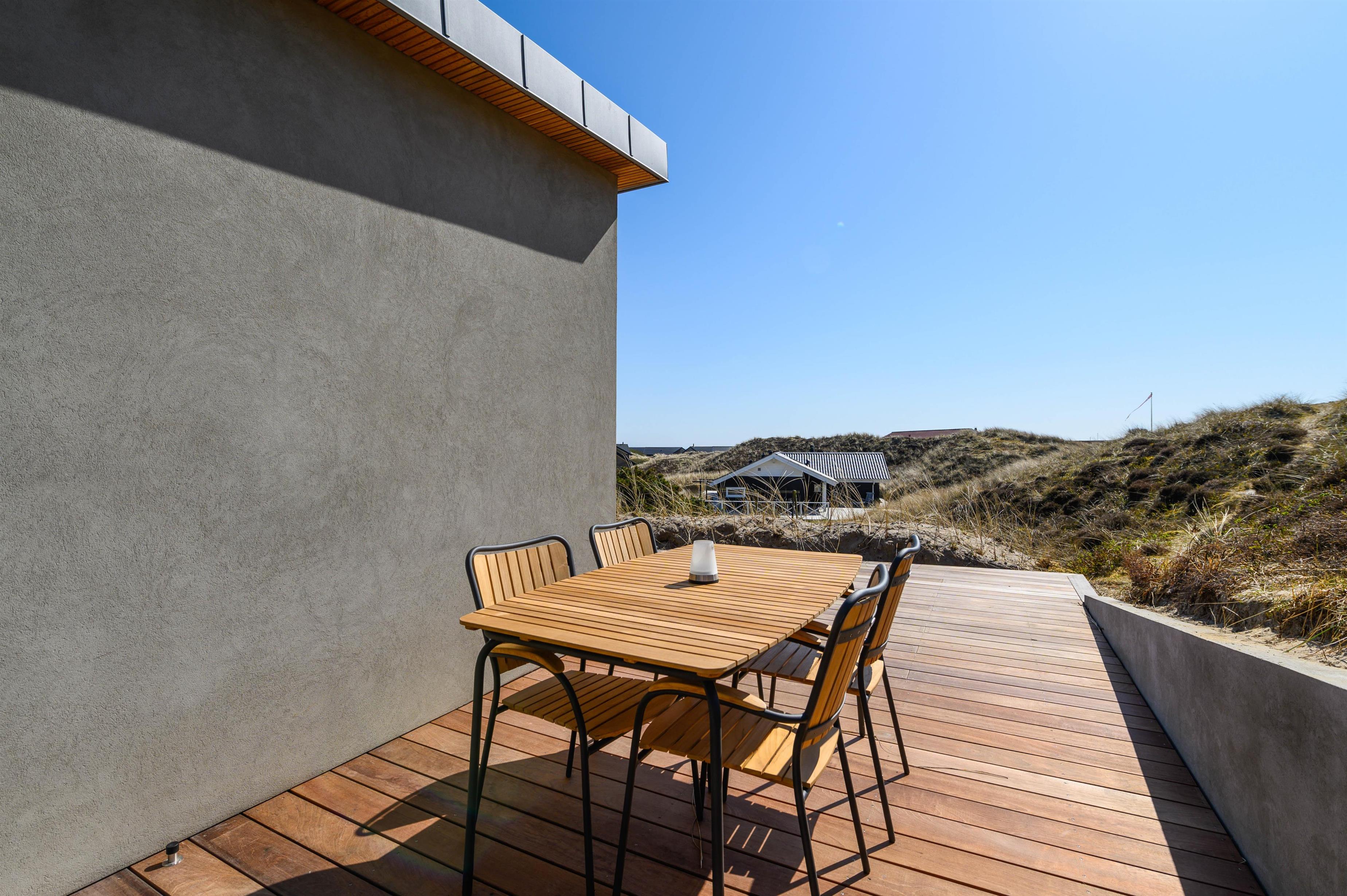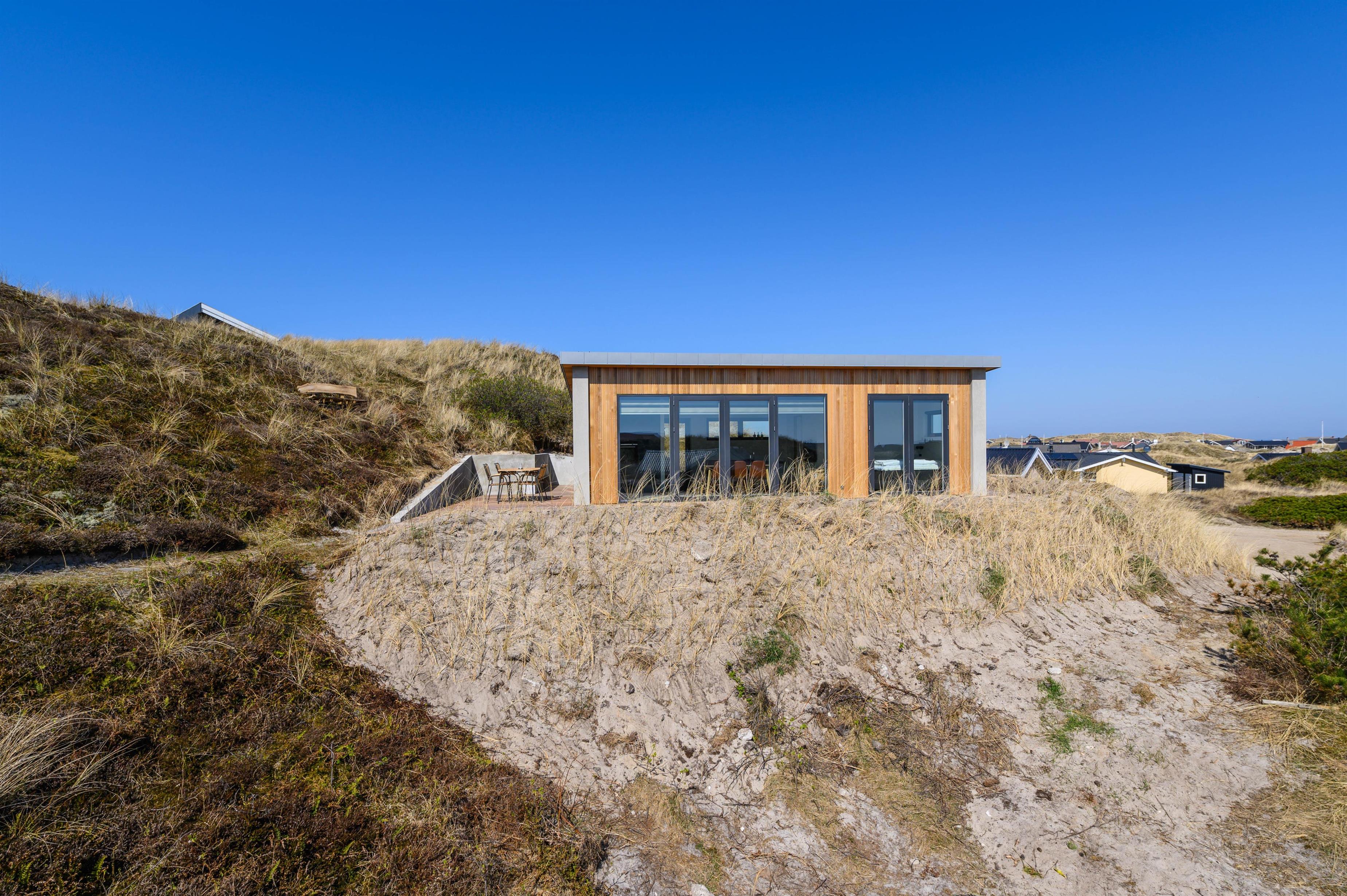 Sommerhuset er placeret på en højtliggende naturgrund, hvor der fra den sydøstvendte terrasse er en fantastisk udsigt over klitlandskabet til Ringkøbing Fjord. Herfra kan I nyde de smukke solopgange til morgenkaffen og slappe af resten dag, hvis turen ikke går til Vesterhavet, der blot ligger et stenkast fra feriehuset. Skulle det være tiltrængt efter en dag ved stranden, er der fra april til november også mulighed for et udendørs brusebad.