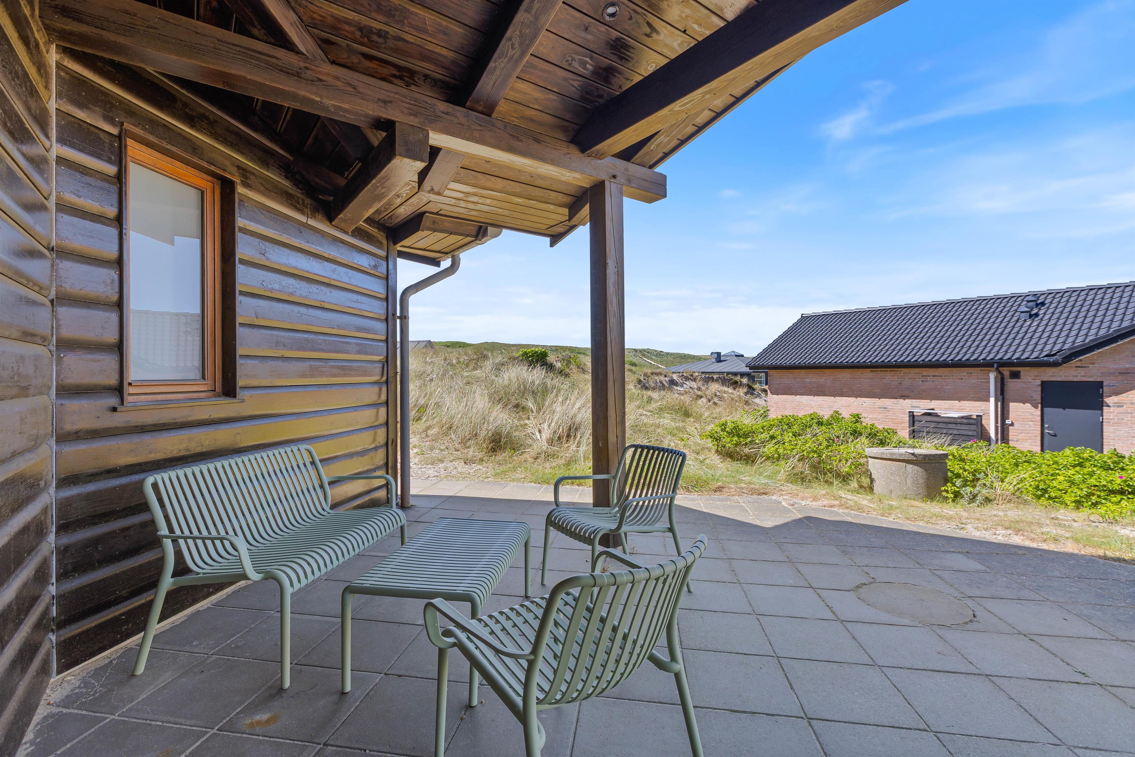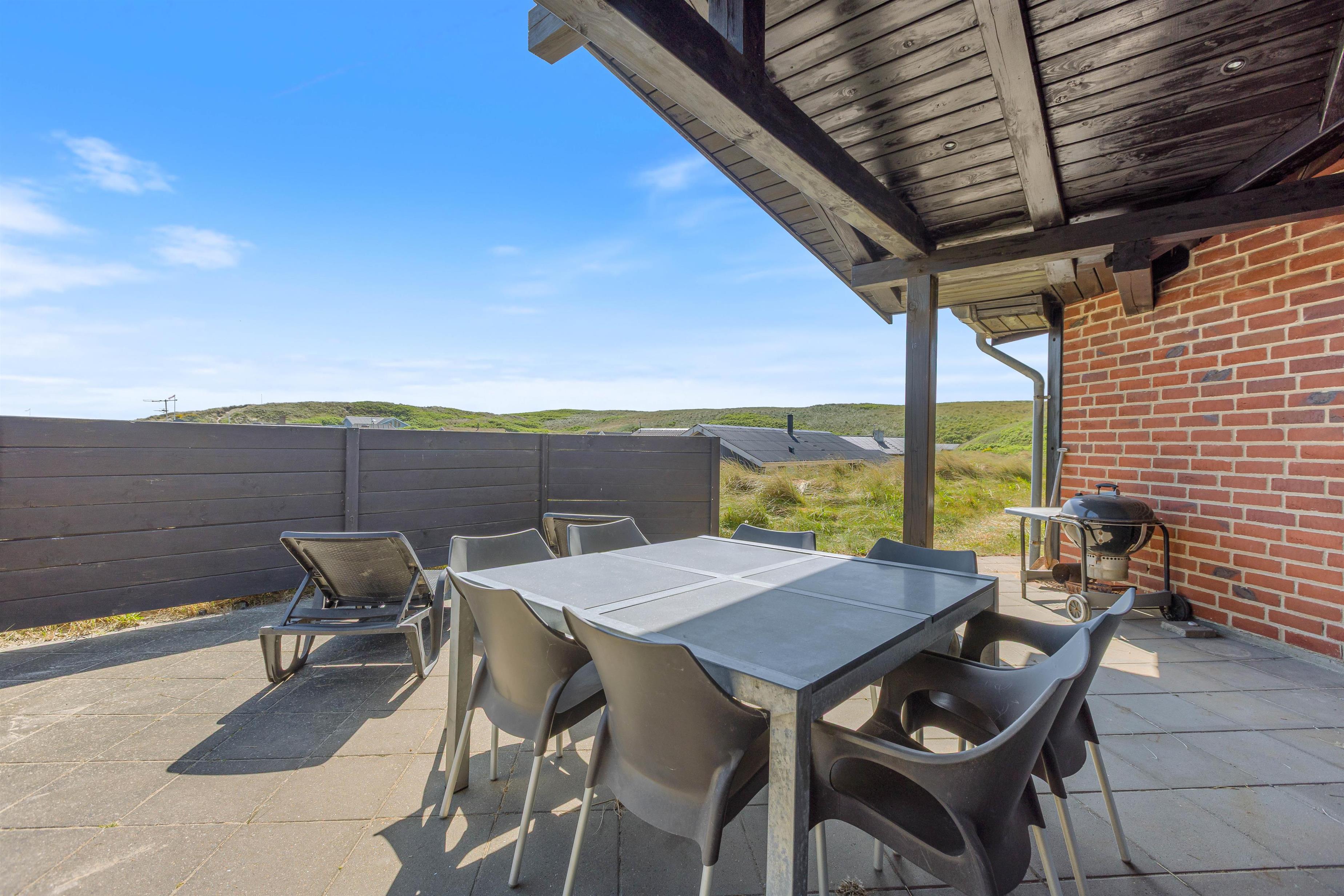Fra stuen har I adgang til den skønne delvist afskærmede træterrasse. Her inviteres til hyggelige solskinstimer på terrassen. Slik sol på terrassen eller kom hjem til en lækker frokost med grillpølser efter mange timers sjov på stranden – her kan I trække jer tilbage og sidde i skyggen under den overdækkede del eller parasollen.