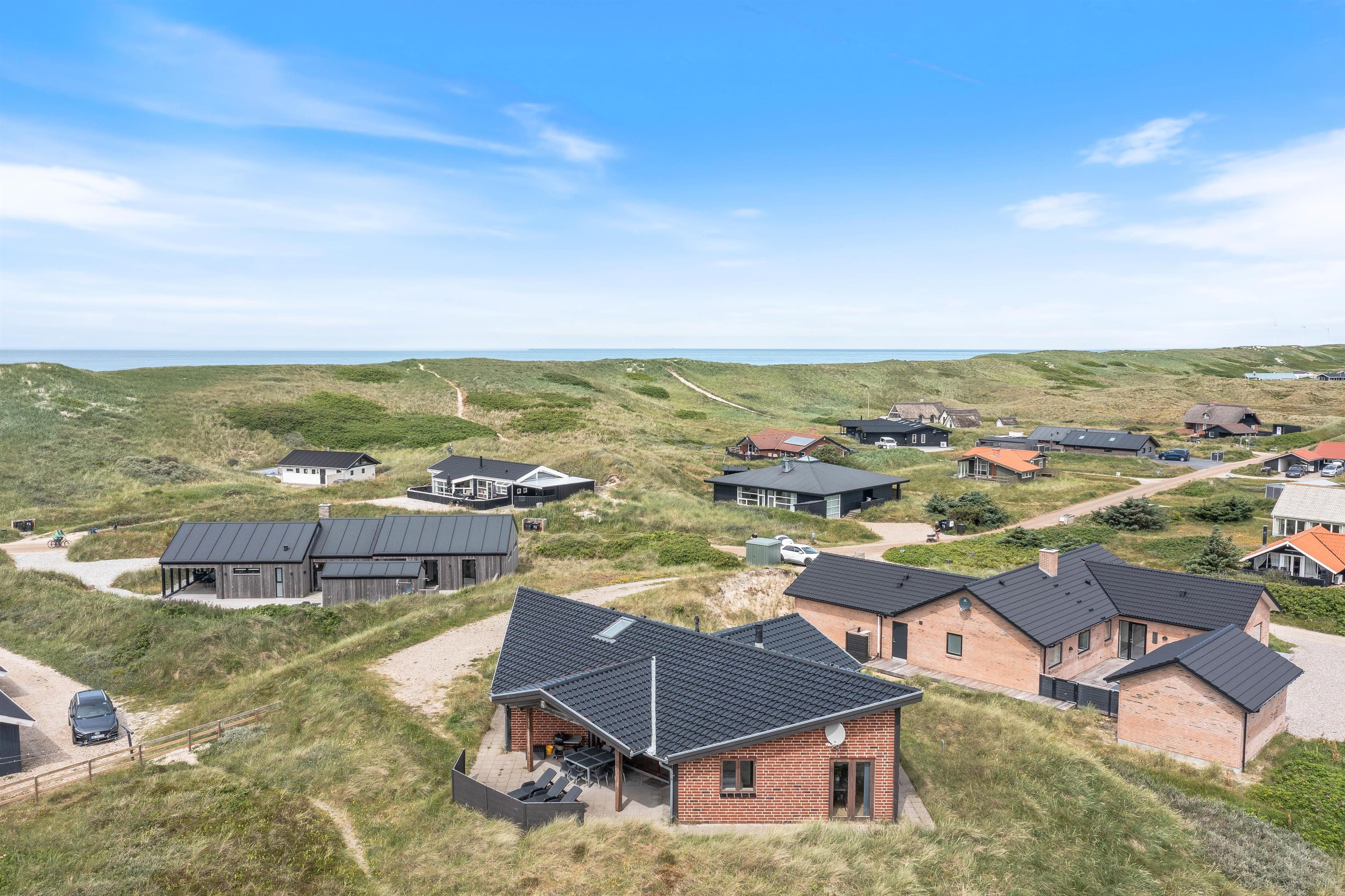 På en skøn, kuperet klitgrund ligger dette helt utroligt flotte og anderledes feriehus, bygget på førsteklassesmaterialer. Fra huset har du en fantastisk udsigt til fjord og klitter, og hele vejen rundt om huset løber en stor terrasse, som er åben såvel som overdækket.