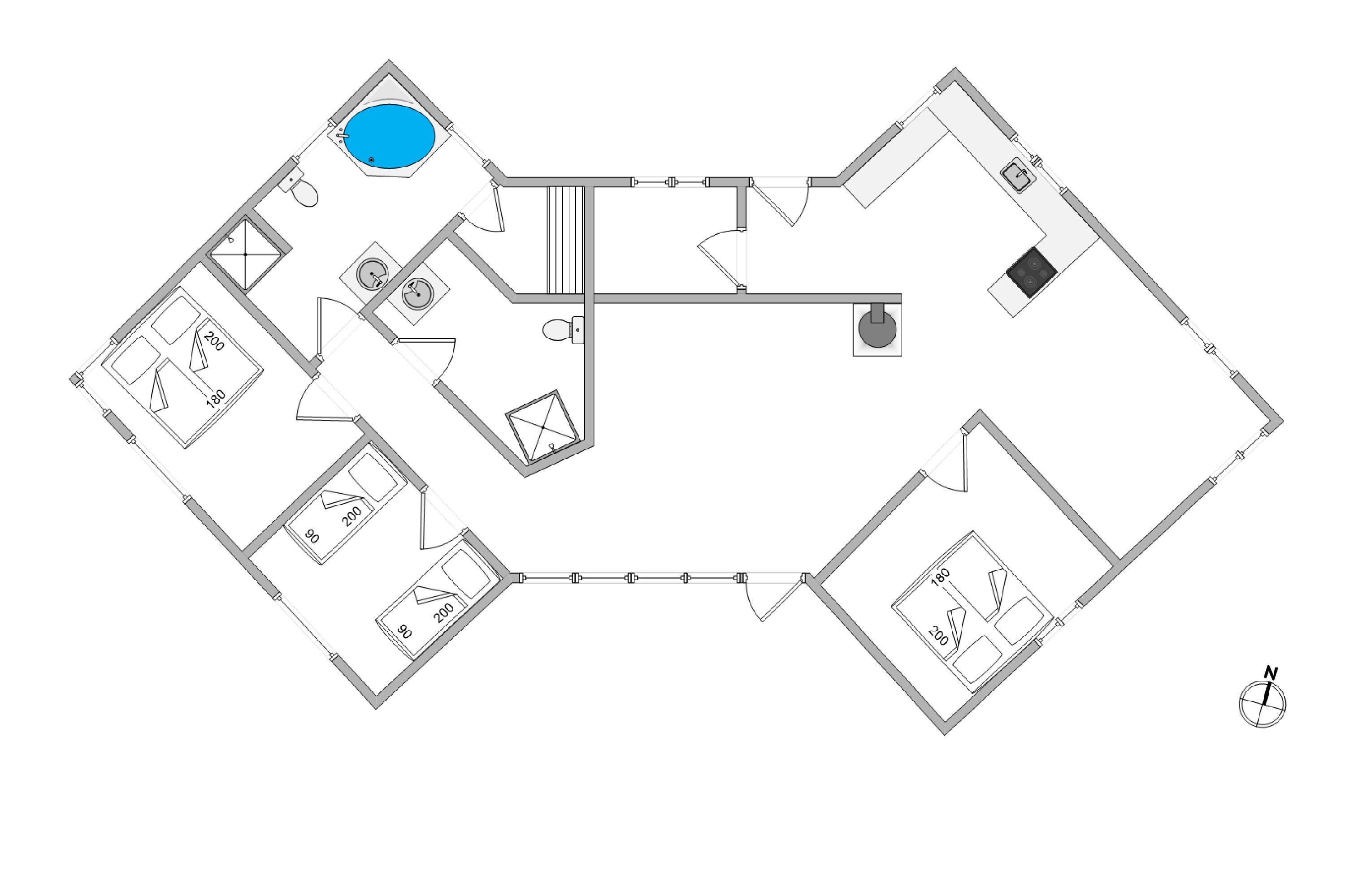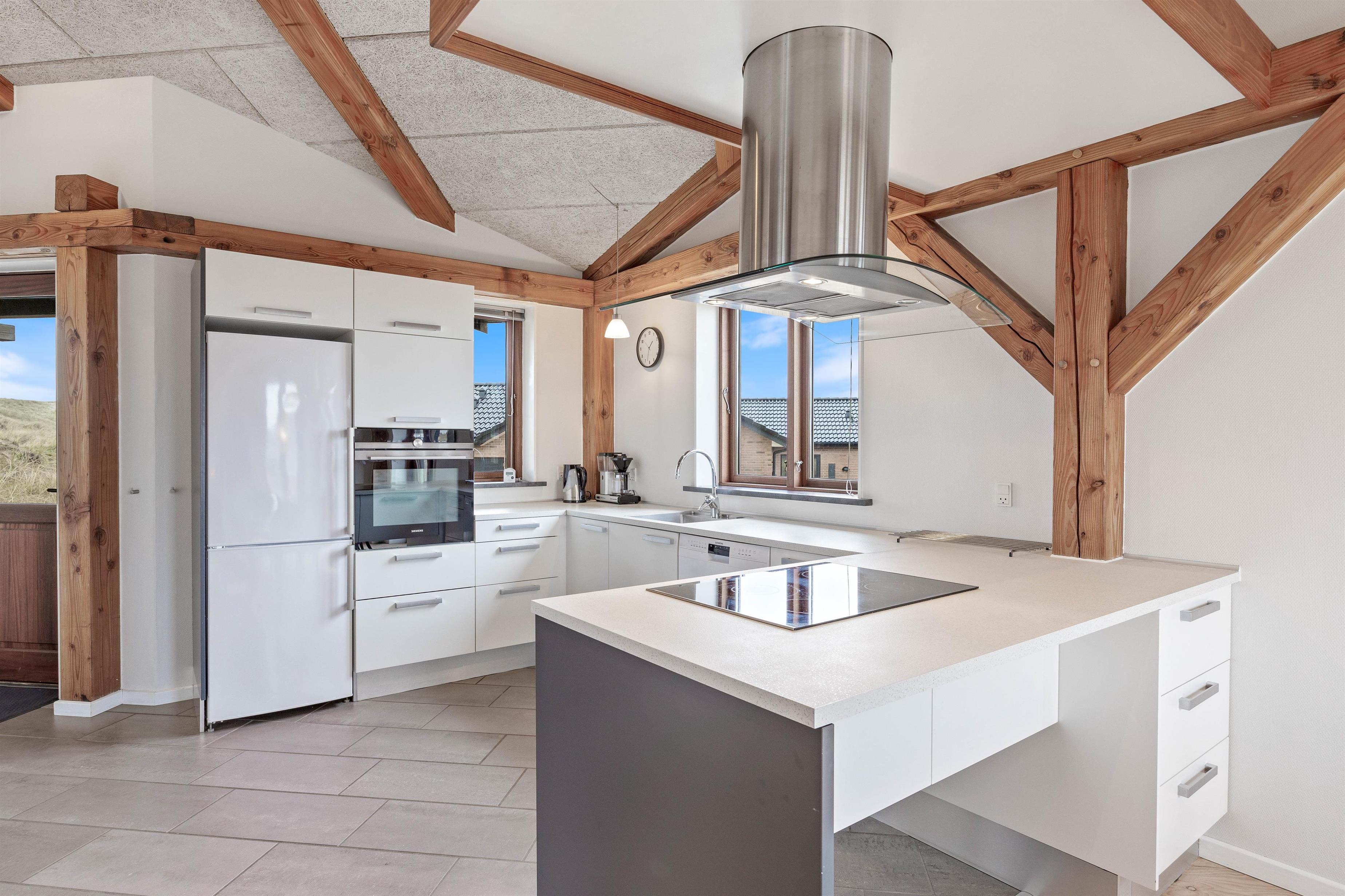 Inde i huset er der heller ikke sparet på detaljerne. De flotte vinkler, kombineret med fritlagte bjælker skaber varme og en hyggelige stemning. Hjerterummet er den store stue i midten. Her er der god plads til at samles med familie og venner, mens ilden knitrer fra brændeovnen. Fra stuen er der adgang til hemsen, som er perfekt til lidt større børn, der gerne vil have deres egne “hule” – på ét af de to badeværelser finder I desuden sauna og spa, så I har mulighed for at komme helt ned i gear.