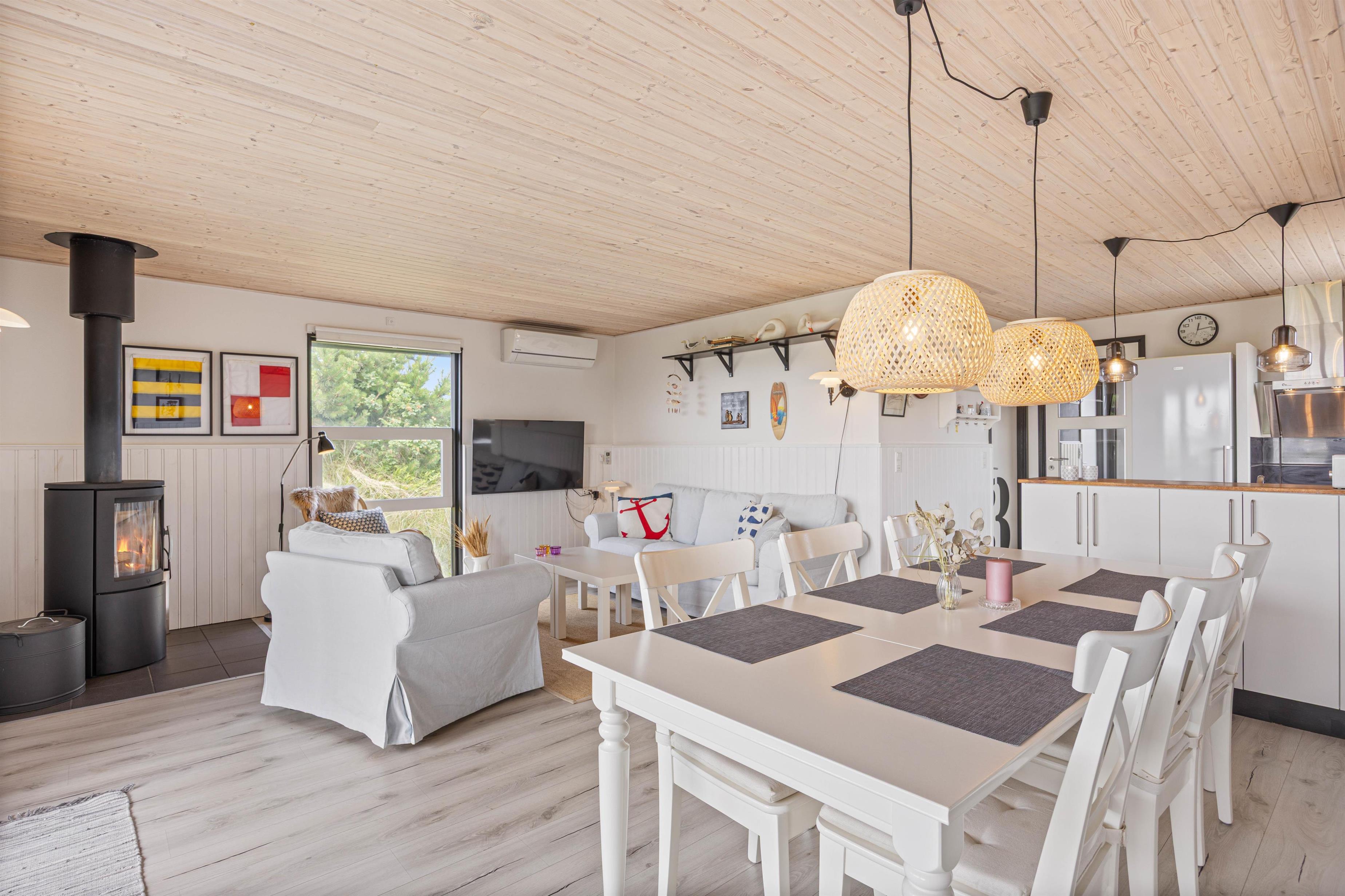 Inde i sommerhuset finder I en lys og indbydende stue med en brændeovn, der skaber en hyggelig atmosfære på de kølige aftener. Brændeovnen giver ikke blot varme men også hygge. Stuen er åben og rummelig med store vinduer, der giver en fantastisk udsigt over den omkringliggende naturgrund.