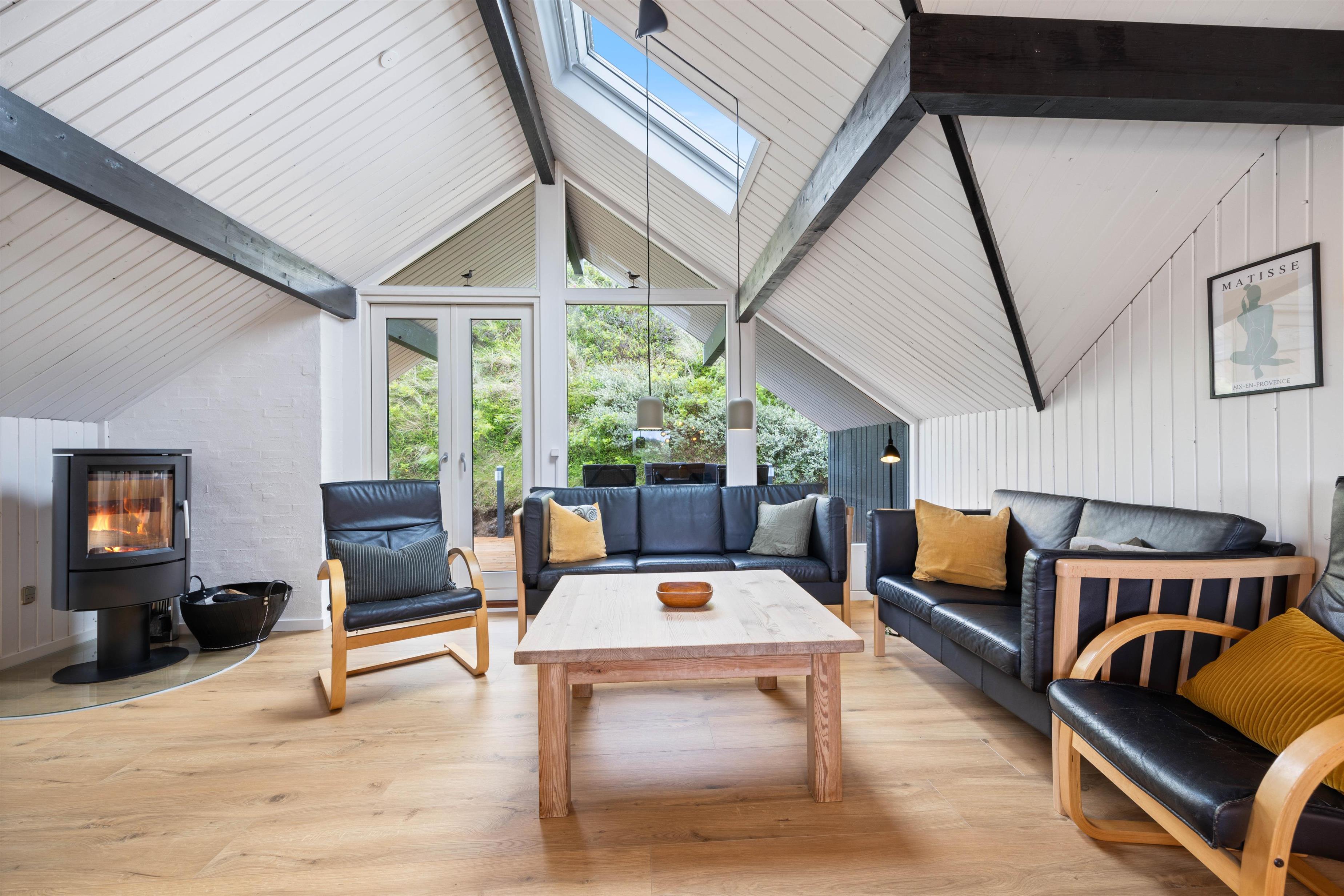 Tingodden 170 er et superdejligt feriehus, hvor man hurtigt føler sig hjemme og godt tilpas. Feriehuset er lyst og smagfuldt indrettet i neutrale nuancer. Samlingspunktet er det rummelige opholdsrum, der forener stue og køkken. Her kan I hygge jer sammen, spille brætspil, se fjernsyn eller bare slænge jer i sofaen med en god bog. Masser af naturligt lys strømmer ind i det åbne opholdsrum gennem ovenlysvinduerne. I køkkenet bliver madlavningen til en leg. Lav et dejligt måltid, som samler familien omkring spisebordet. På de køligere aftener kan I tænde op i den dejlige brændeovn, som spreder varme og glæde.