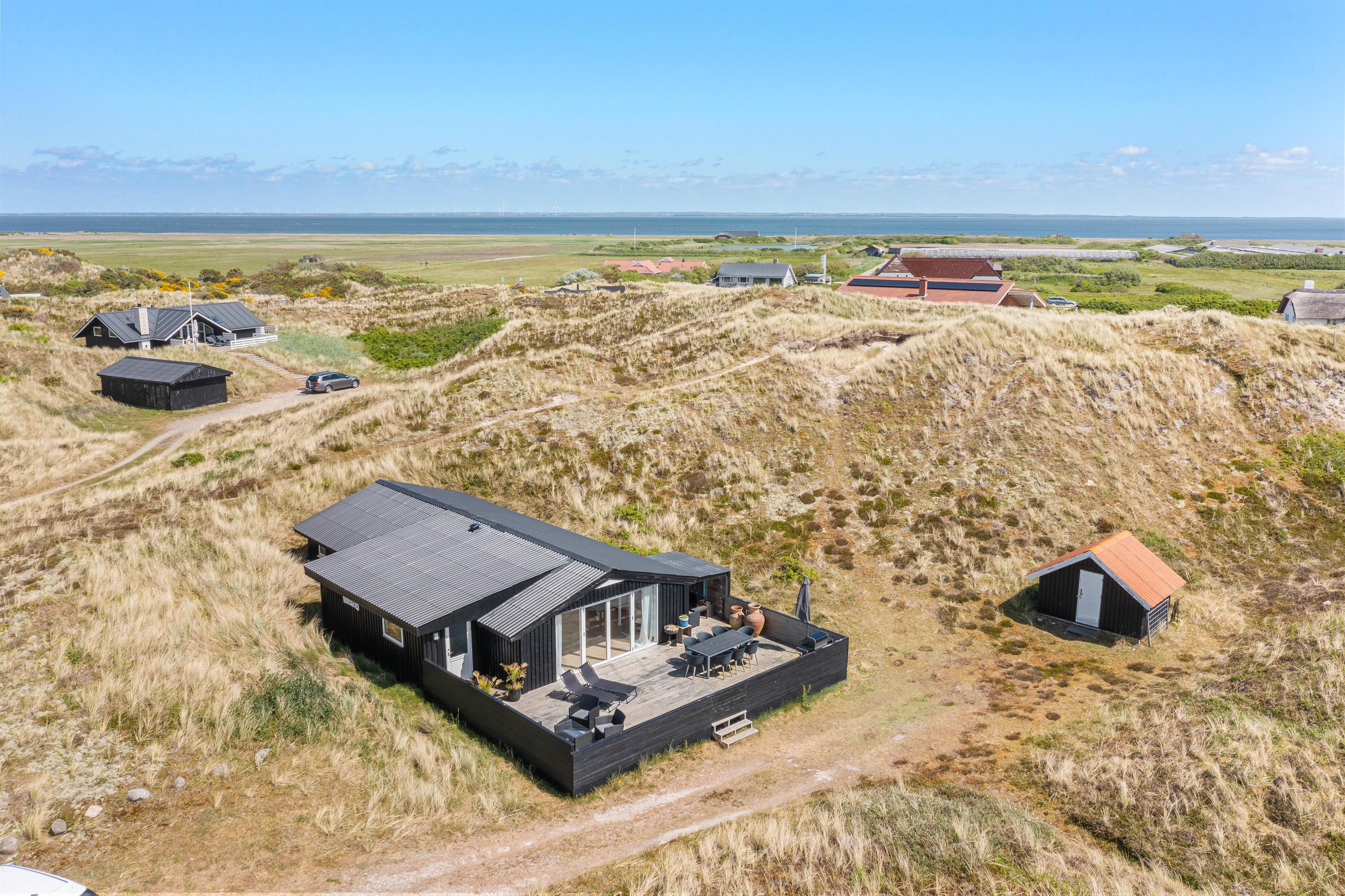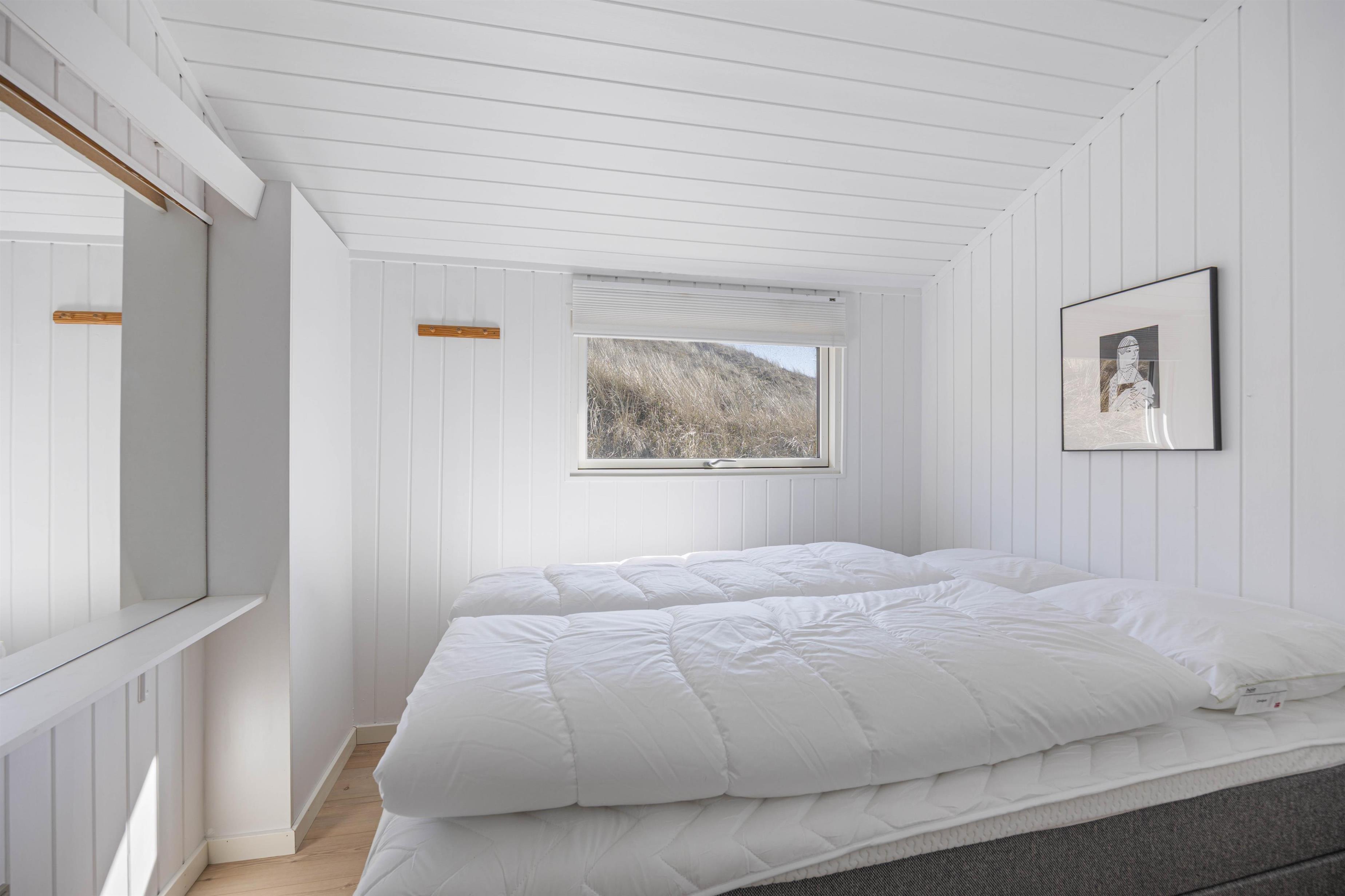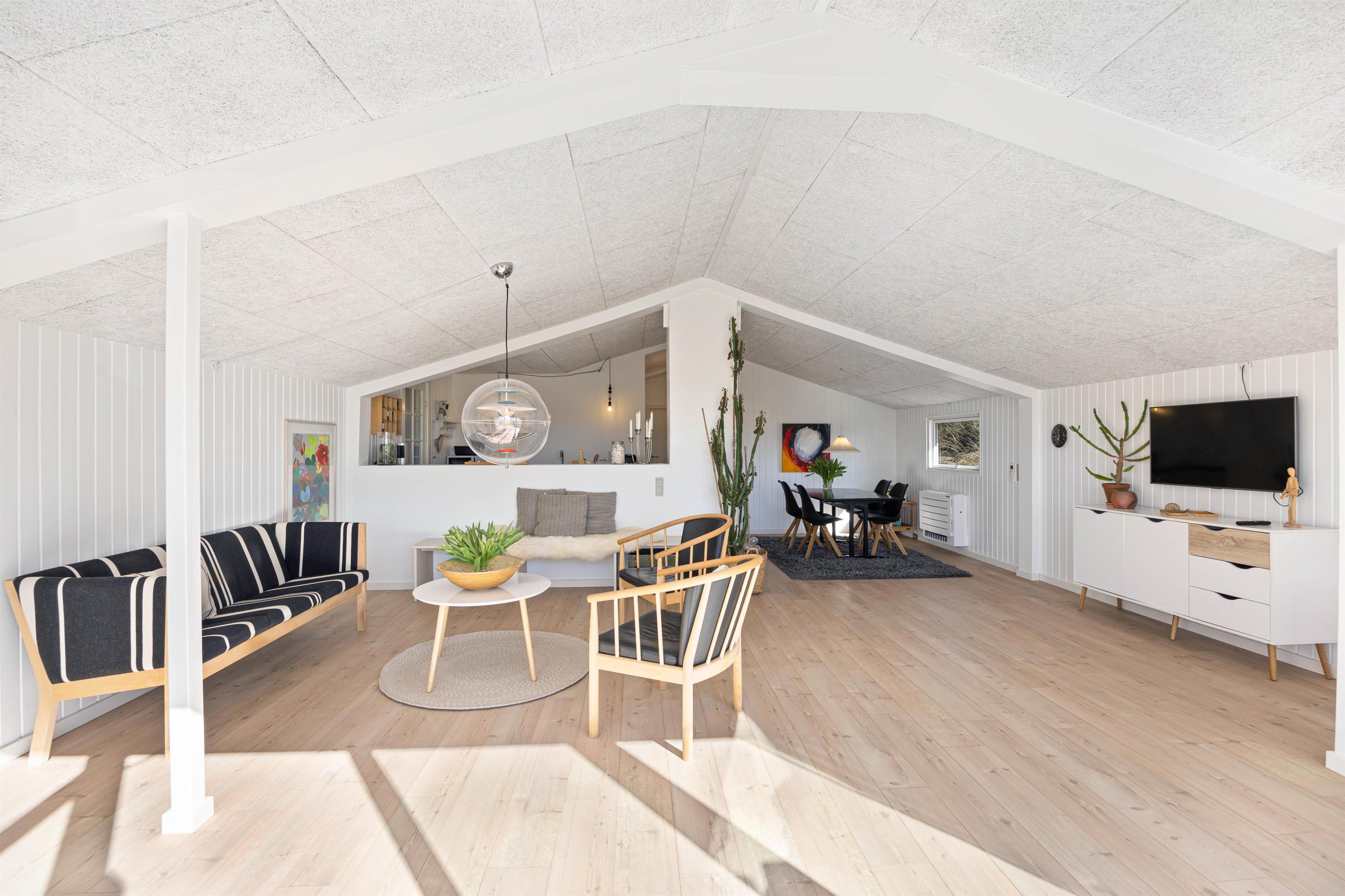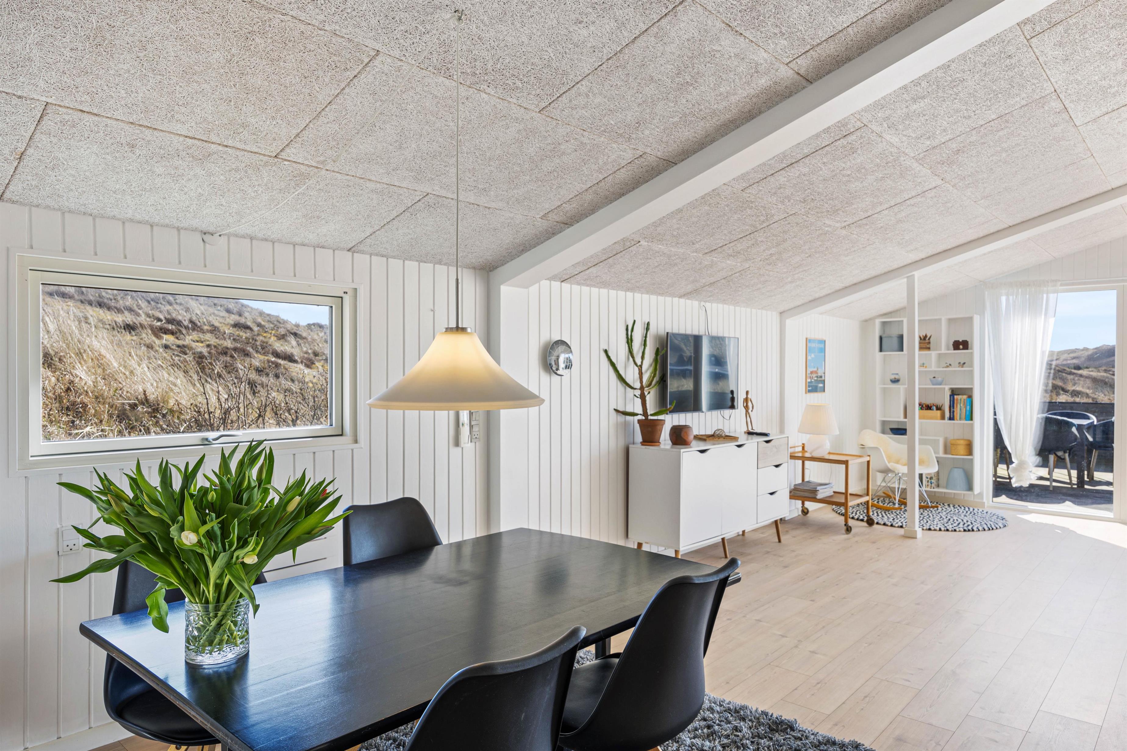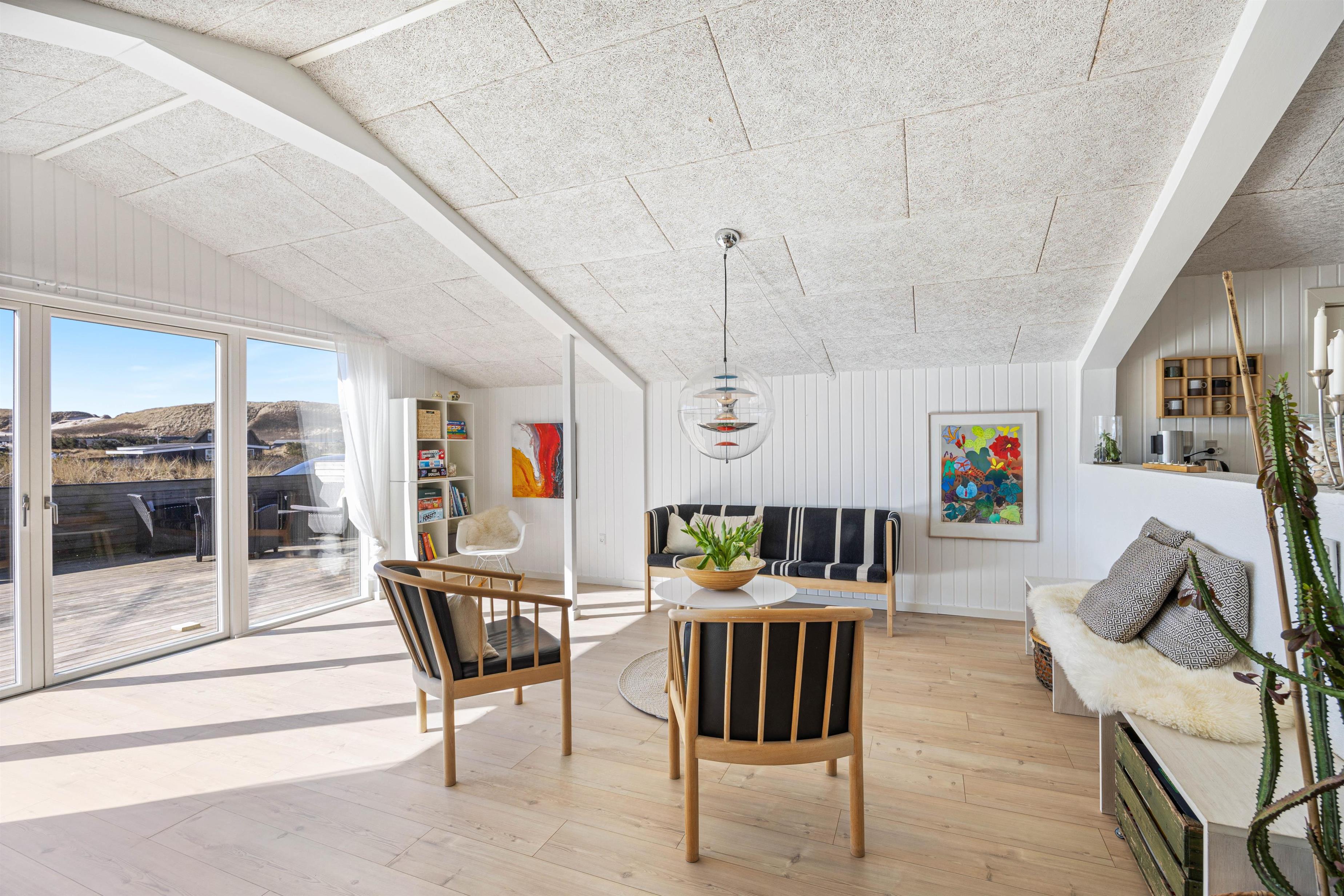 Sommerhuset er indrettet med hyggelige og lyse træpaneler, der skaber en indbydende og dejlig atmosfære. Den rummelige stue er sommerhusets samlingspunkt, hvor I kan nyde den fantastiske udsigt over klitterne eller se en god film på tv’et. Varmepumpen i køkken-alrummet sikrer en behagelig inde temperatur året rundt.