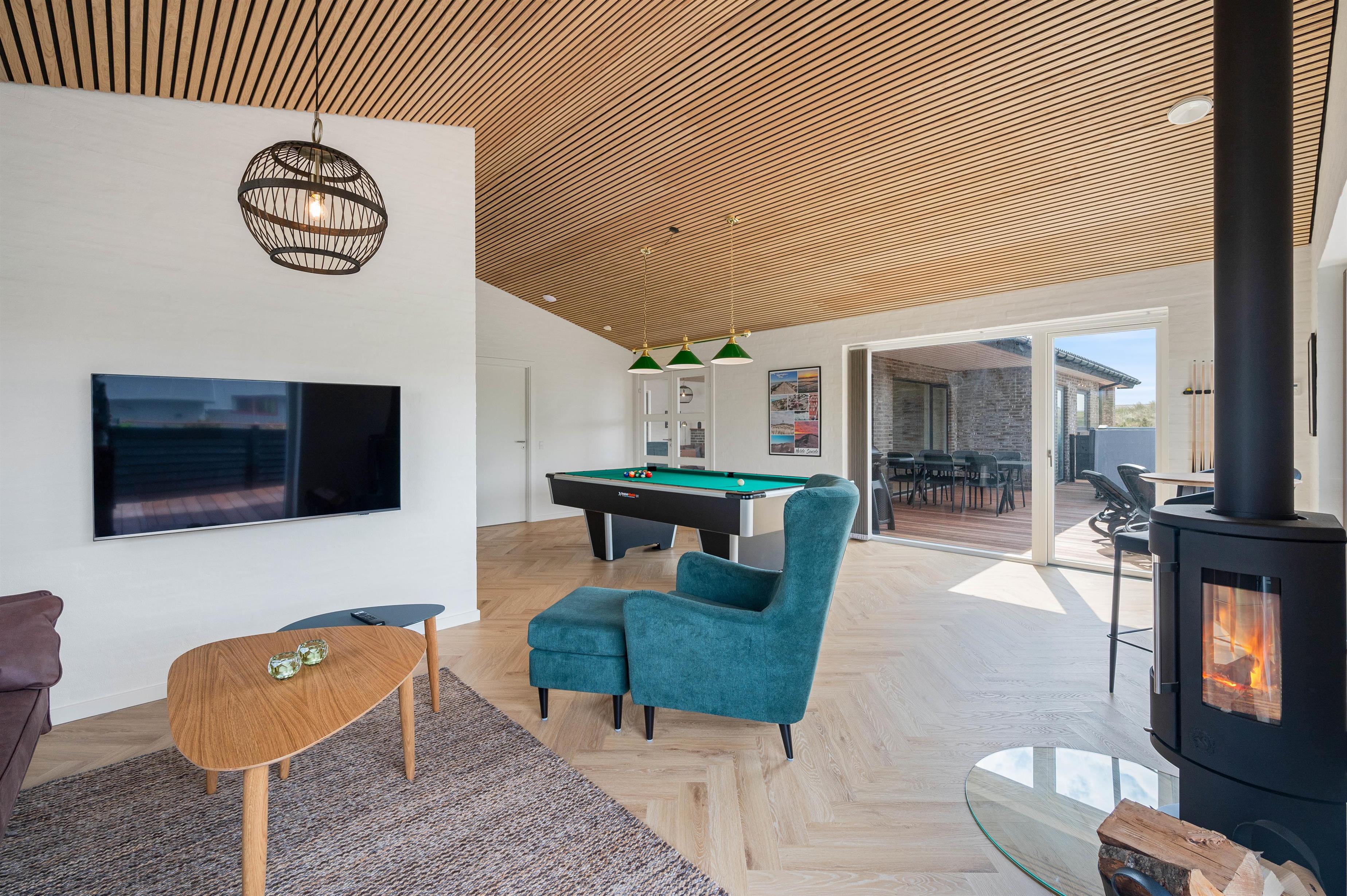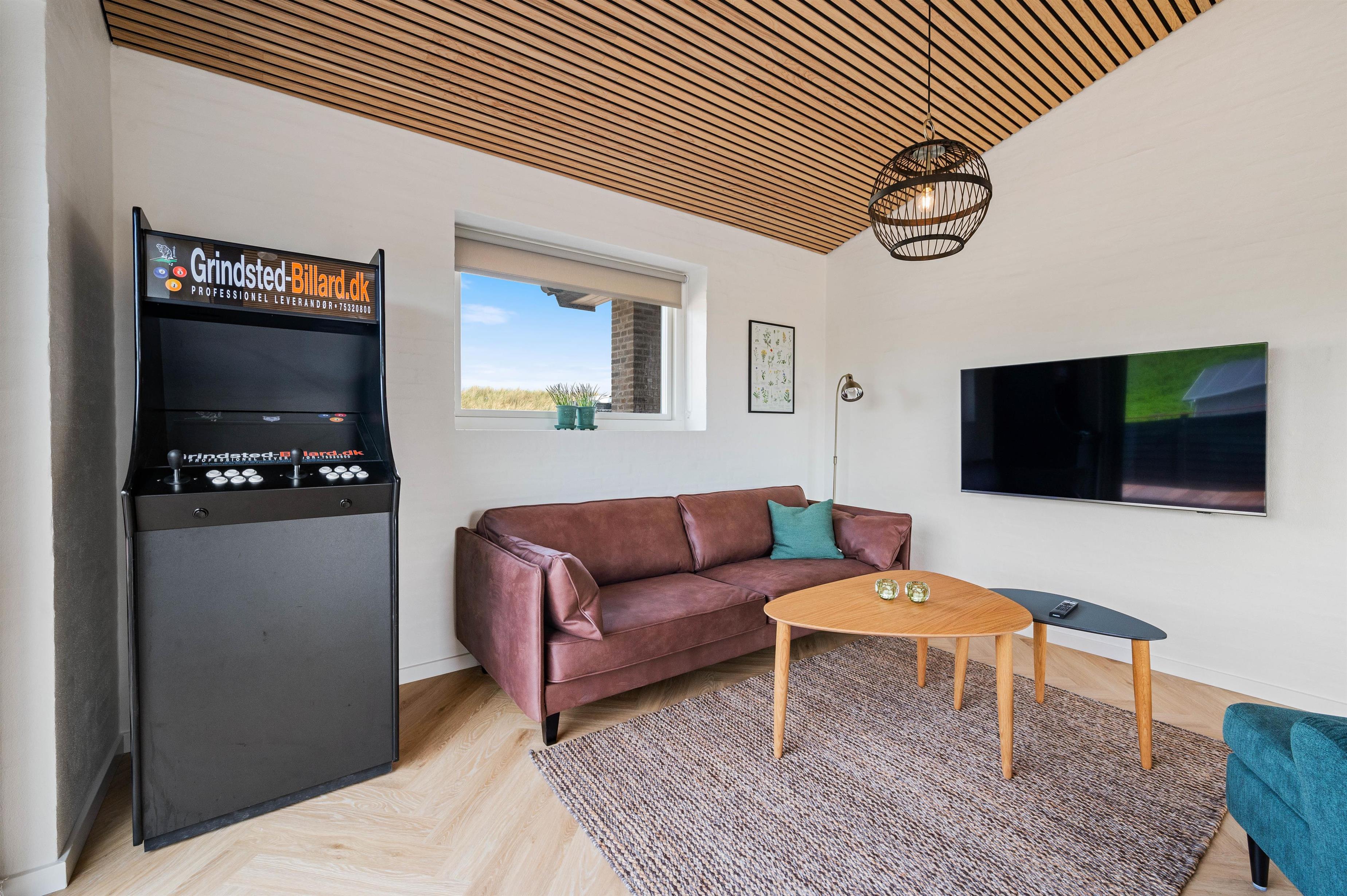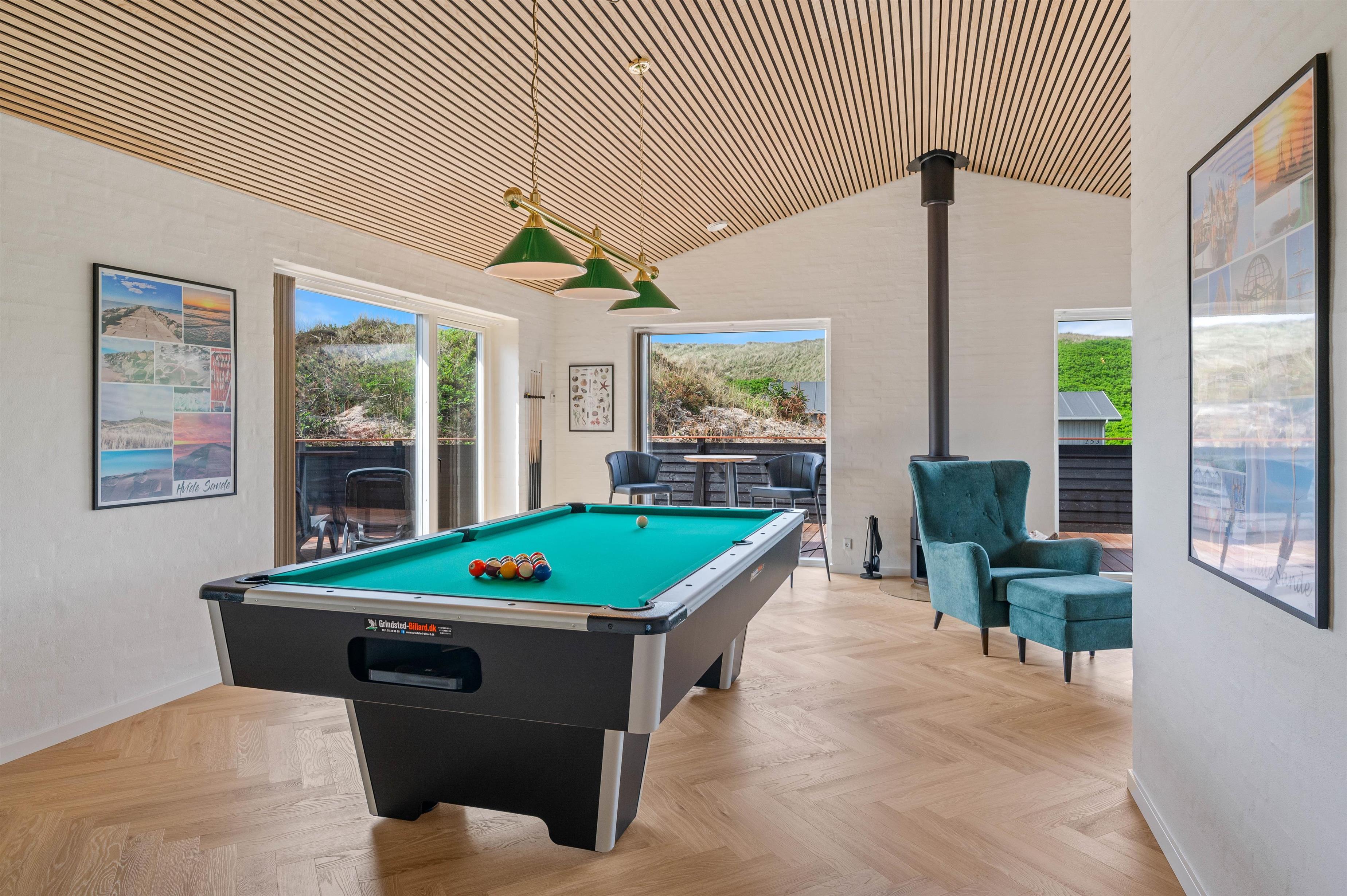 Når I træder ind i dette moderne sommerhus på 180 m2, bliver I mødt af en dejlig atmosfære med plads til både afslapning og leg. Hvis du har brug for at trække dig tilbage og komme helt ned i gear, kan du nyde den dejlige varme i saunaen eller slappe af i stuen, hvor der er brændeovn og danske tv-kanaler. Hvis du derimod er til aktivitet, kan du opholde dig i aktivitetsrummet, hvor der er plads til et spil billard.