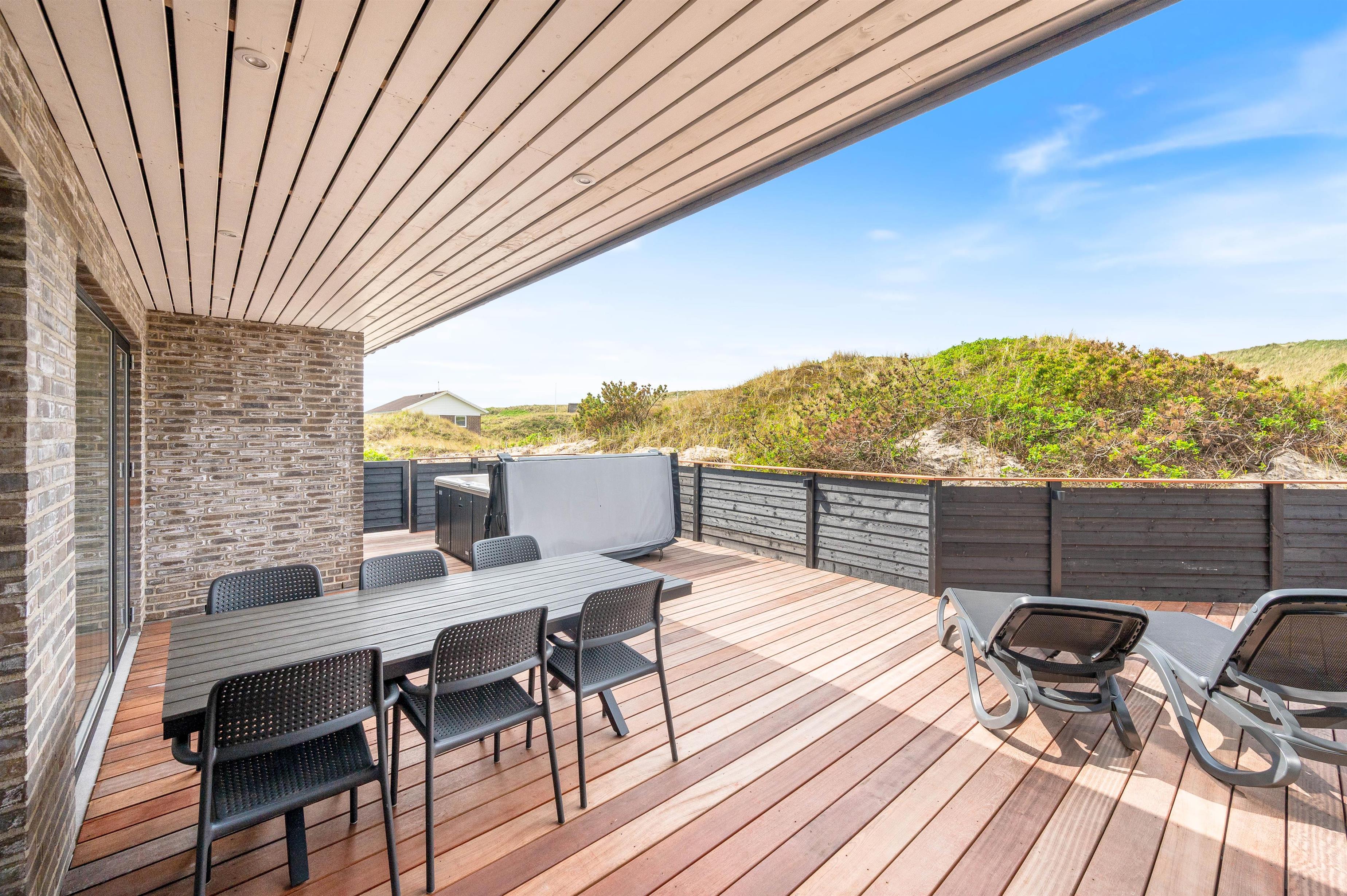 Udendørs er der plads til at nyde familien i fred og ro, da sommerhusets skønne terrasse både er lukket og delvist overdækket. Du kan sætte dig godt til rette, mens hunden kan gå frit rundt på den lukkede terrasse. Efter en dejlig dag kan du lave en lækker middag på gasgrillen, hvorefter du kan sætte dig i udespaen og slappe af og nyde den dejlige vesterhavsluft.