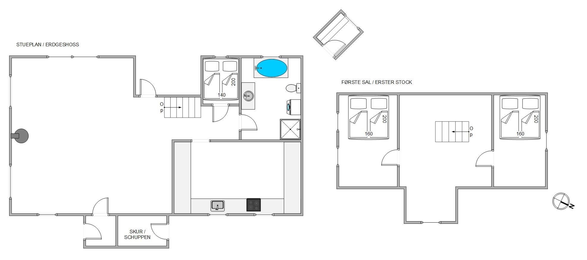 De 3 soveværelser er fordelt med 2 på 1. sal og 1 i stueplan. På 1. sal er der bjælker i loftet og her er en stor opholdsstue midt i rummet.
