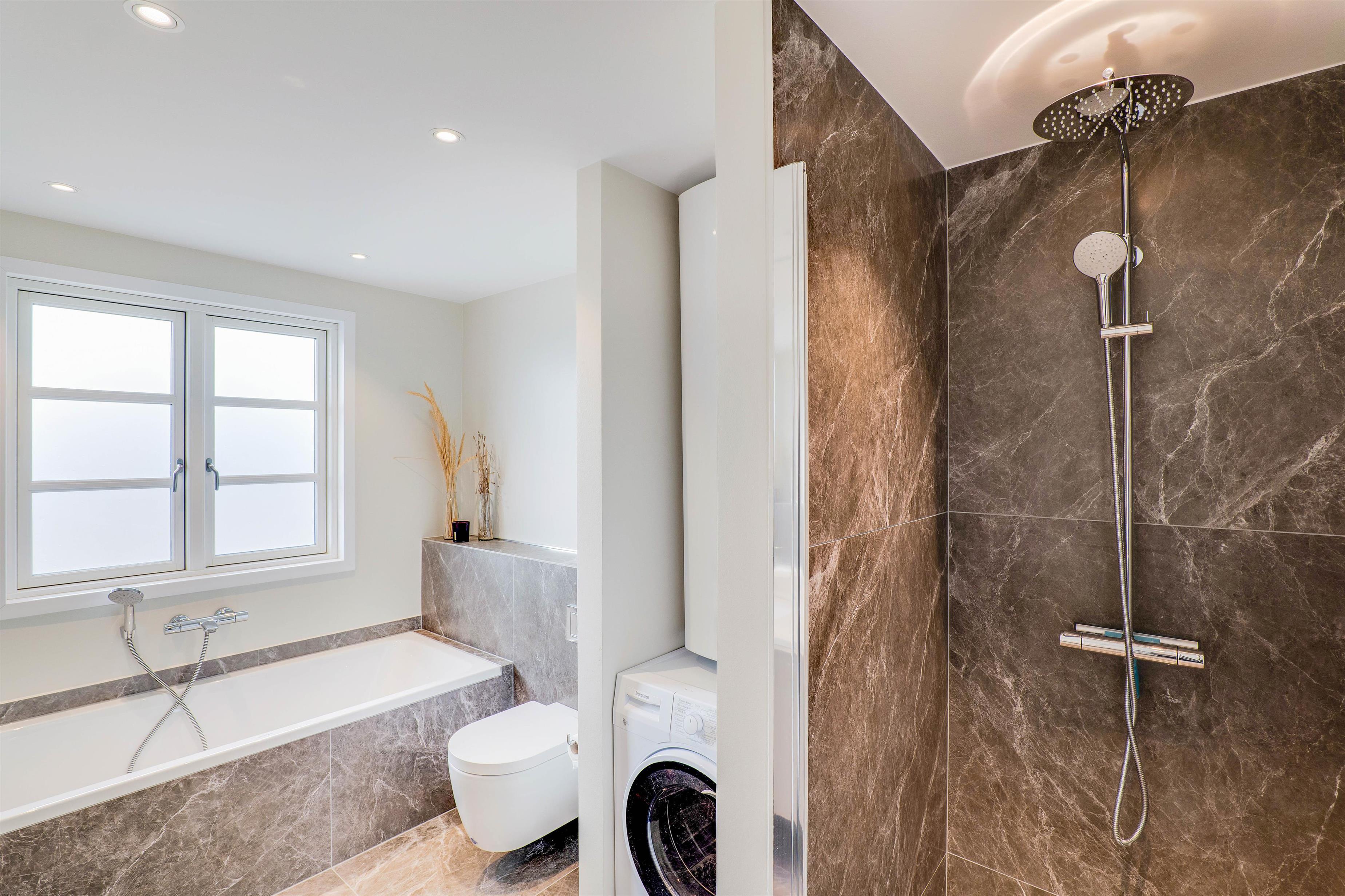 På feriehusets lyse badeværelse, er der ligeledes et badekar. Her på badeværelset er vaskemaskinen også placeret. I skal ikke tænke på at børnene leger for meget udenfor i sandkassen, eller på den store grund, som hører med til huset. I kan vaske tøjet inden I tager hjem og undgå den store vasketøjsdynge, når I kommer hjem.