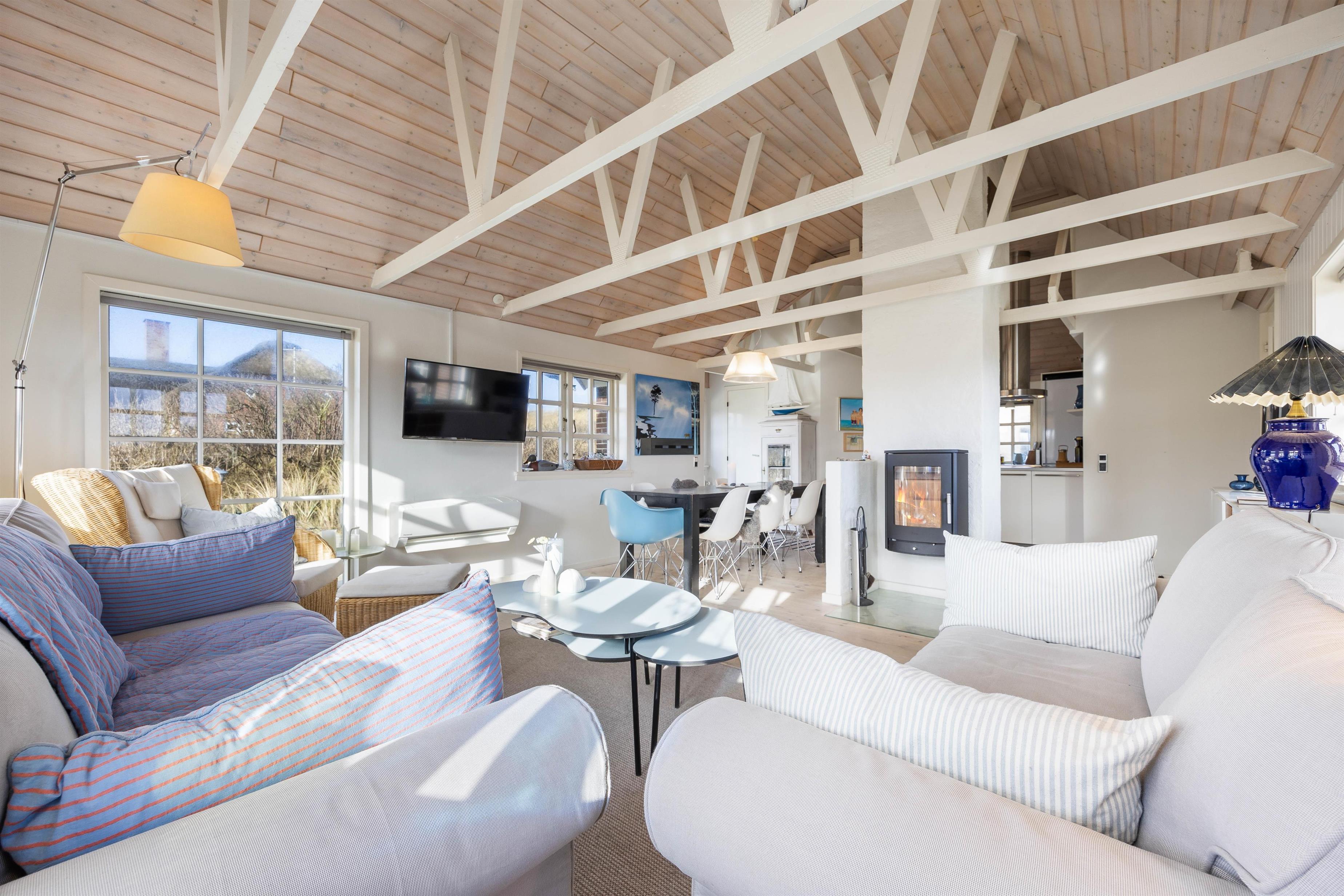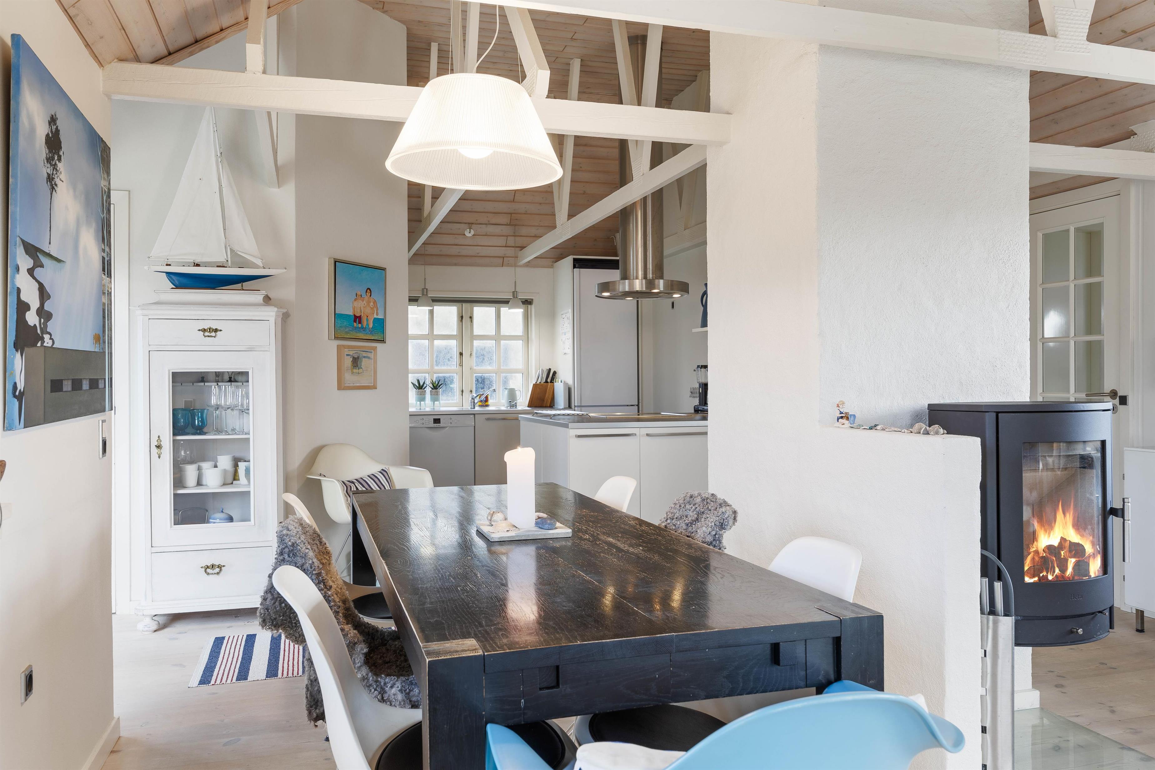 Når I træder ind i dette hyggelige sommerhus, bliver I med det samme mødt af en dejlig atmosfære. De flotte hvide træbjælker er i sammenspil med træloftet med til at skabe en dejlig atmosfære i sommerhuset. Den dejlige atmosfære lægger op til afslapning i sofaen foran brændeovnen. Brændeovnen sørger for, at I har en dejlig temperatur i sommerhuset. Der er også en varmepumpe I sommerhuset, som I kan bruge til at holde den dejlige temperatur.