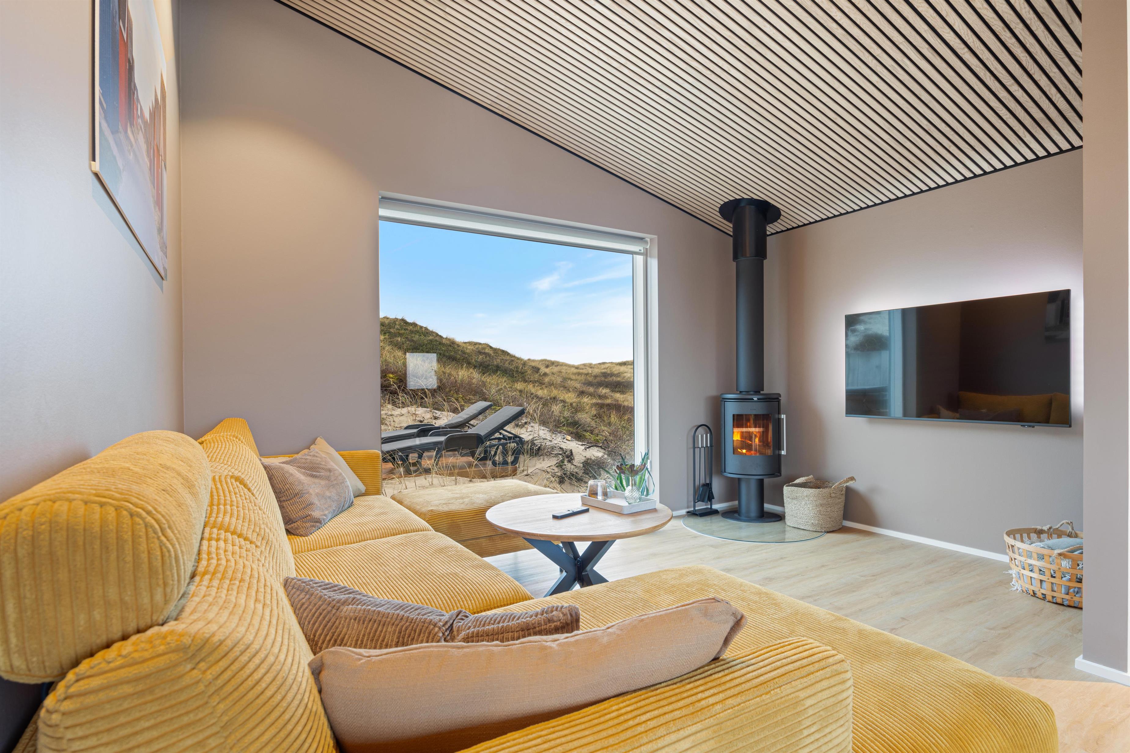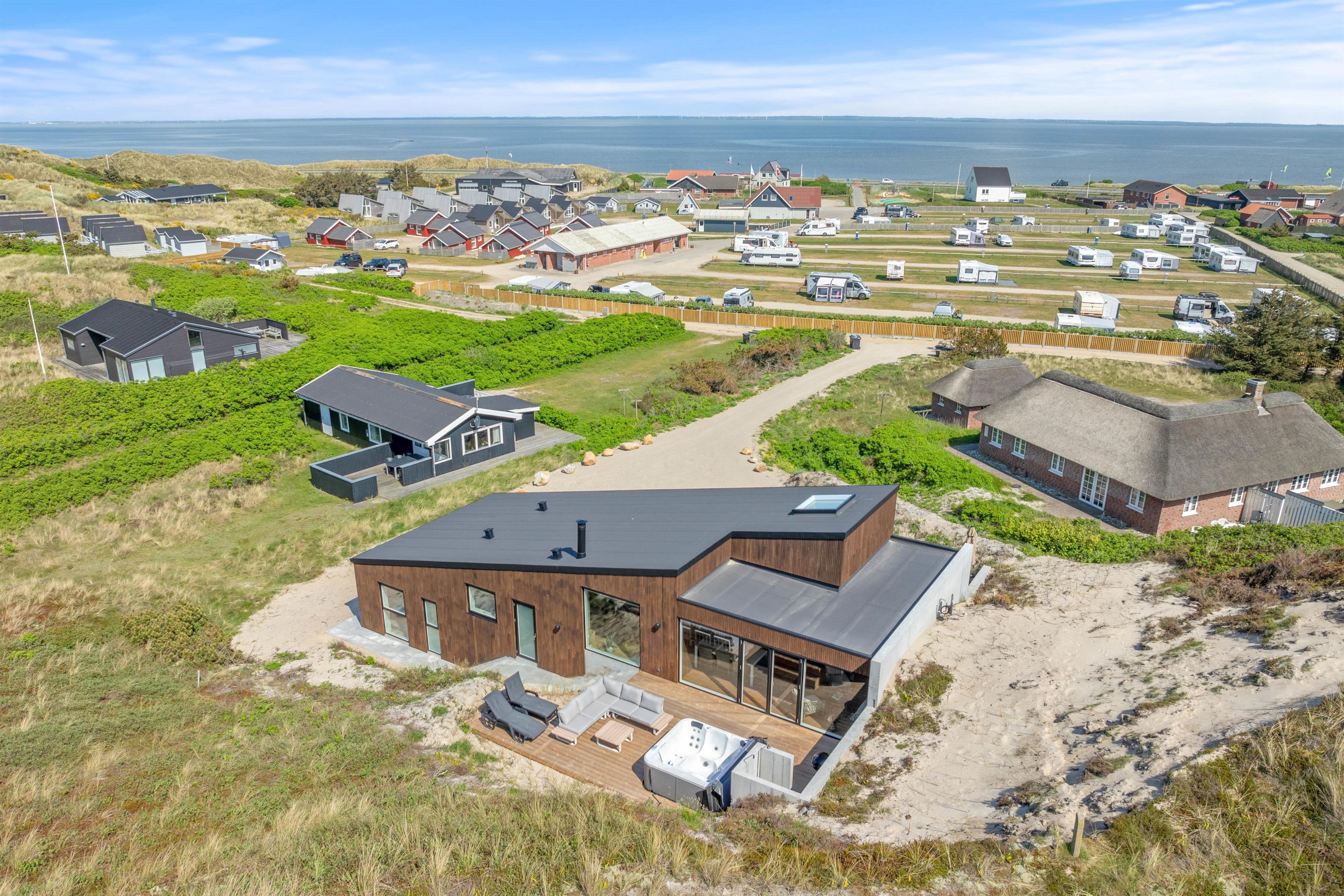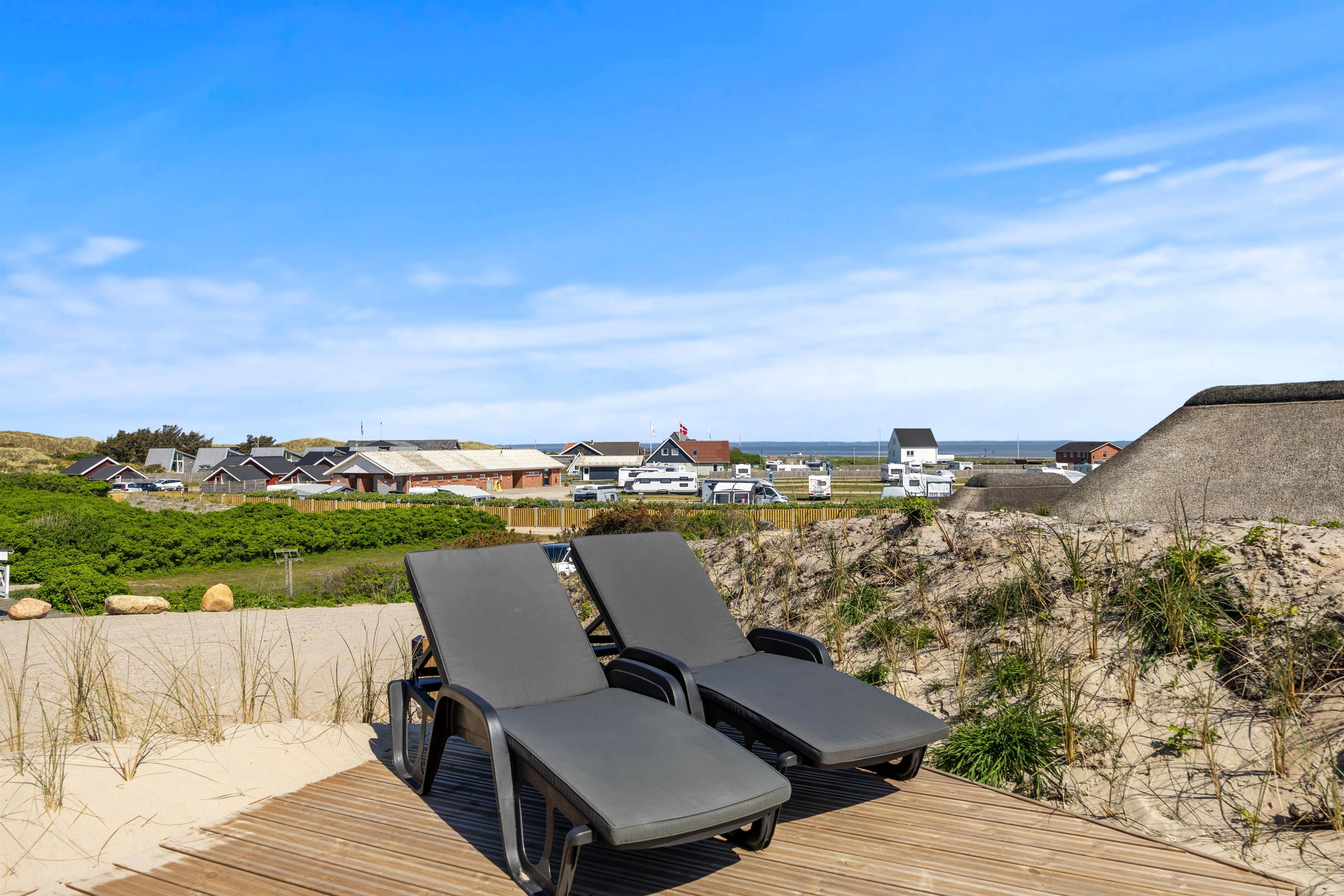 Dette 5-stjernede sommerhus i 1. klitrække på Karen Brands Vej 106 byder på en uforglemmelig ferieoplevelse med udespa og brændeovn. Sommerhuset er bygget ind i klitten i forskudte plan, der giver en fantastisk panoramaudsigt mod øst over Ringkøbing Fjord og panoramaudsigt til uberørte klitter mod vest.