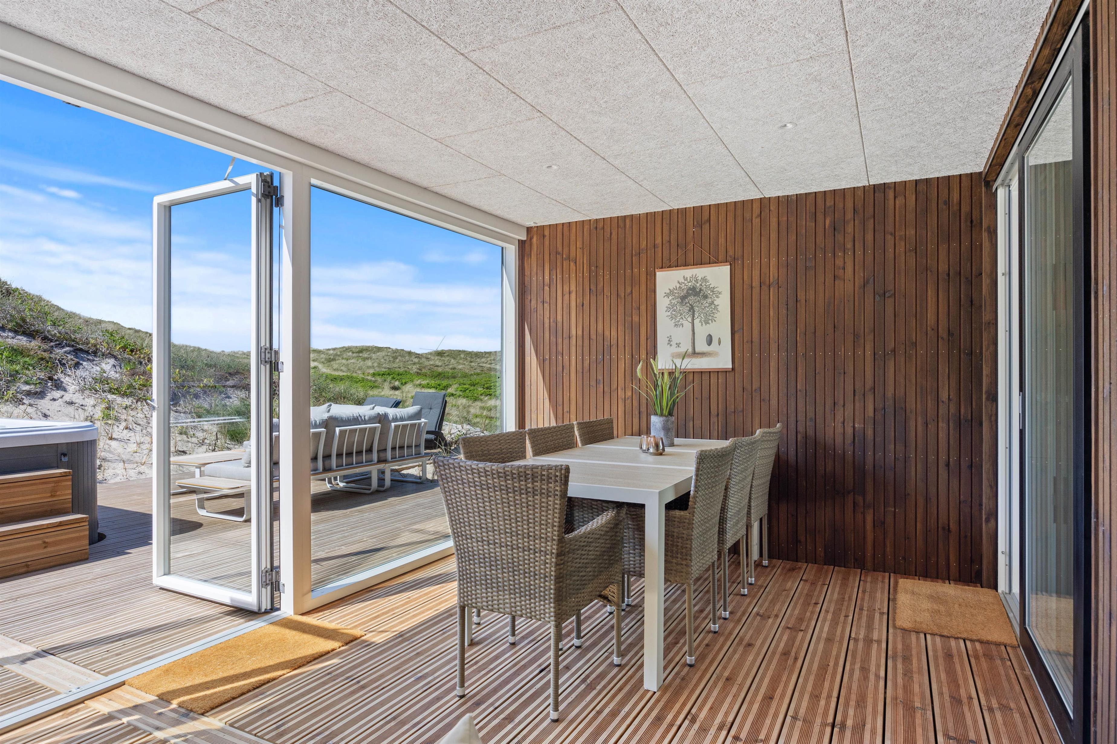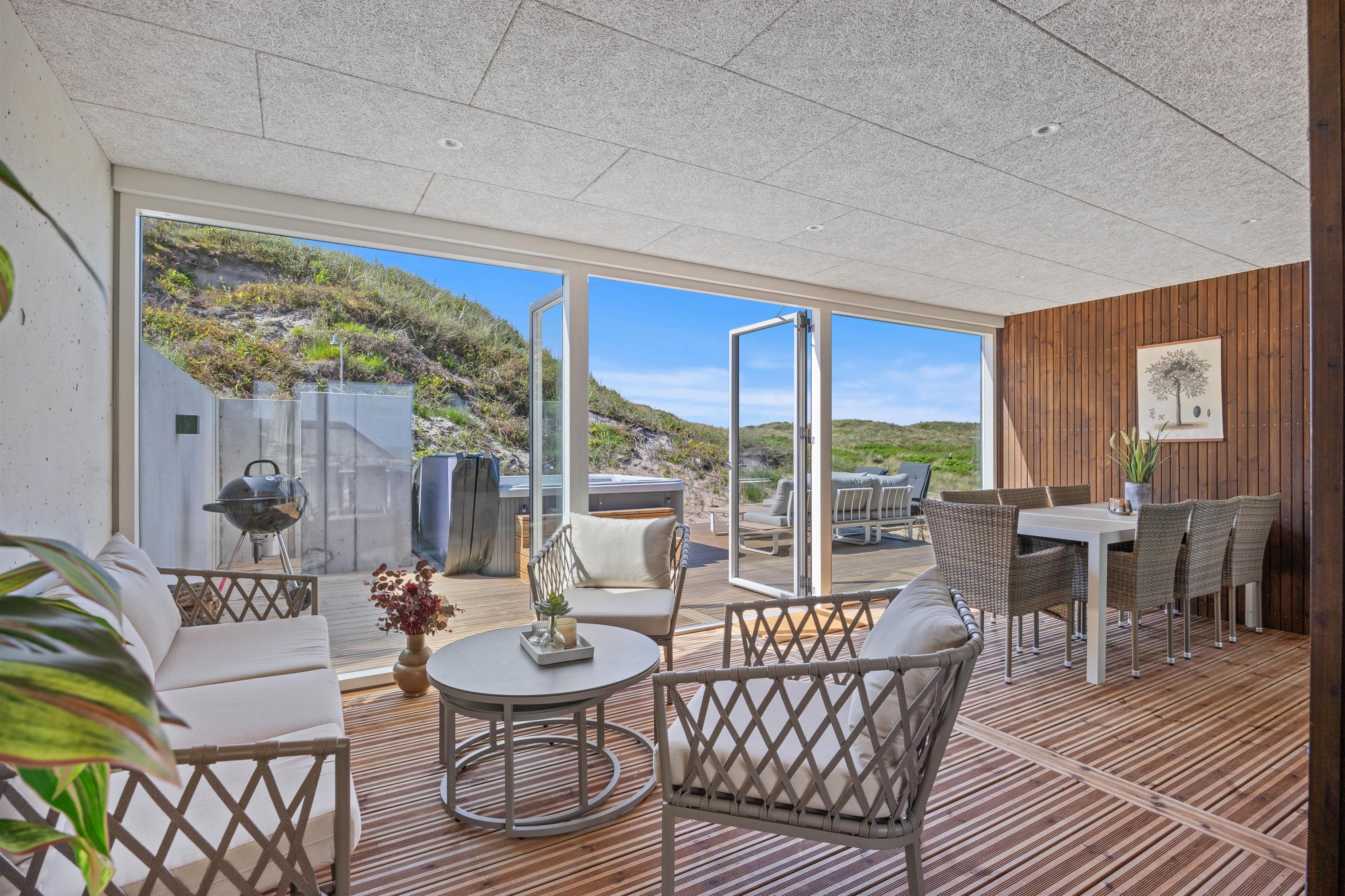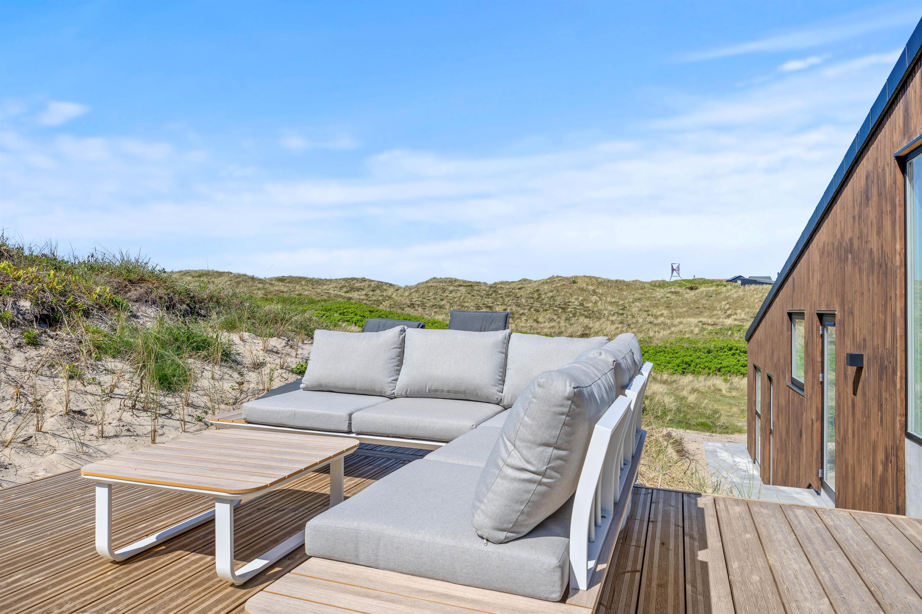 Udendørs er der tænkt på alle detaljer for at sikre en dejlig ferieoplevelse. Sommerhuset ligger på en smuk klitgrund, hvor I kan slappe af på den skønne afskærmede eller i den overdækkede og lukkede terrasse, som forbinder inde og ude – perfekt til at nyde den friske havluft, uanset vejr og vind.