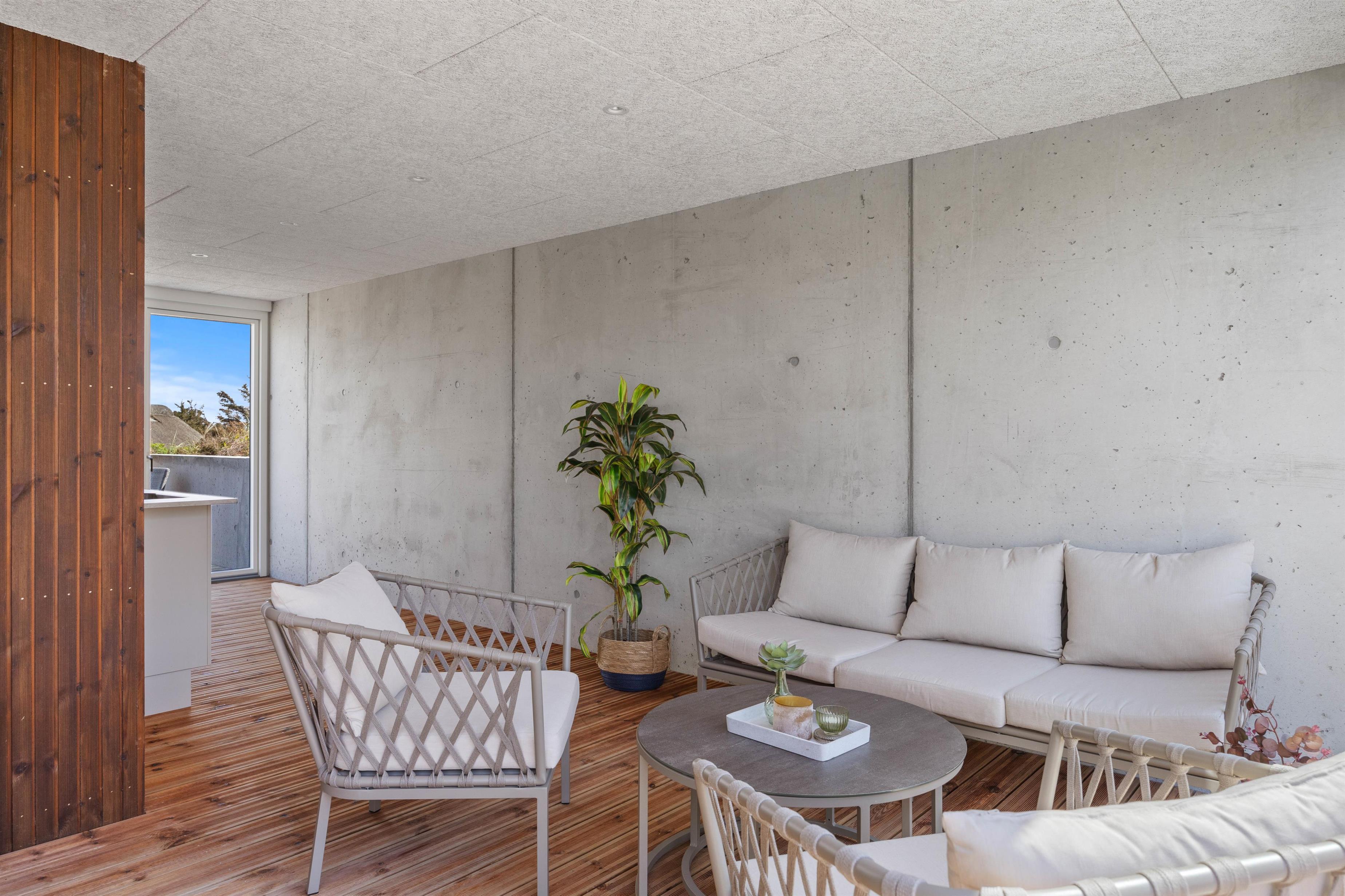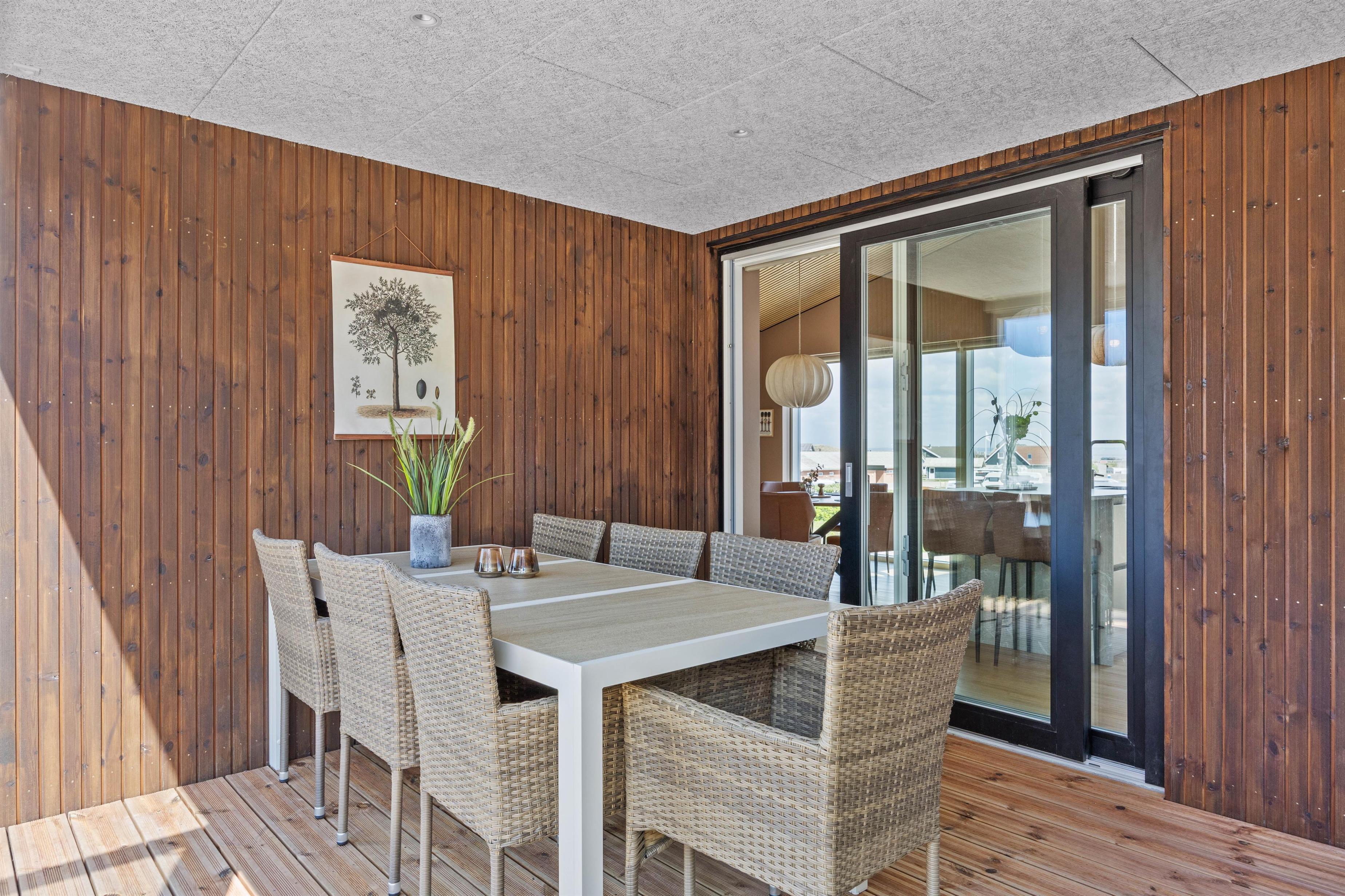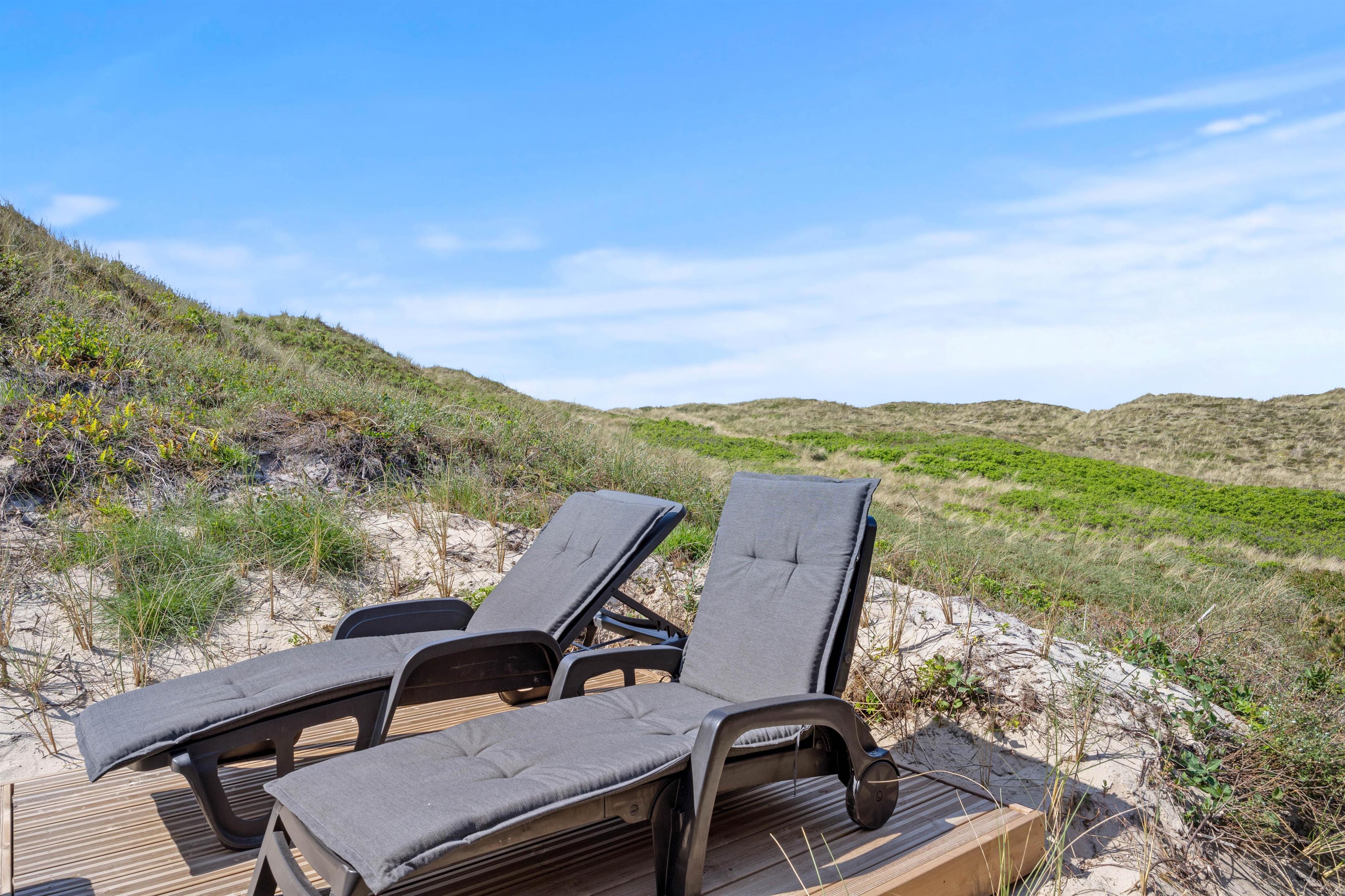 Udendørs er der tænkt på alle detaljer for at sikre en dejlig ferieoplevelse. Sommerhuset ligger på en smuk klitgrund, hvor I kan slappe af på den skønne afskærmede eller i den overdækkede og lukkede terrasse, som forbinder inde og ude – perfekt til at nyde den friske havluft, uanset vejr og vind.