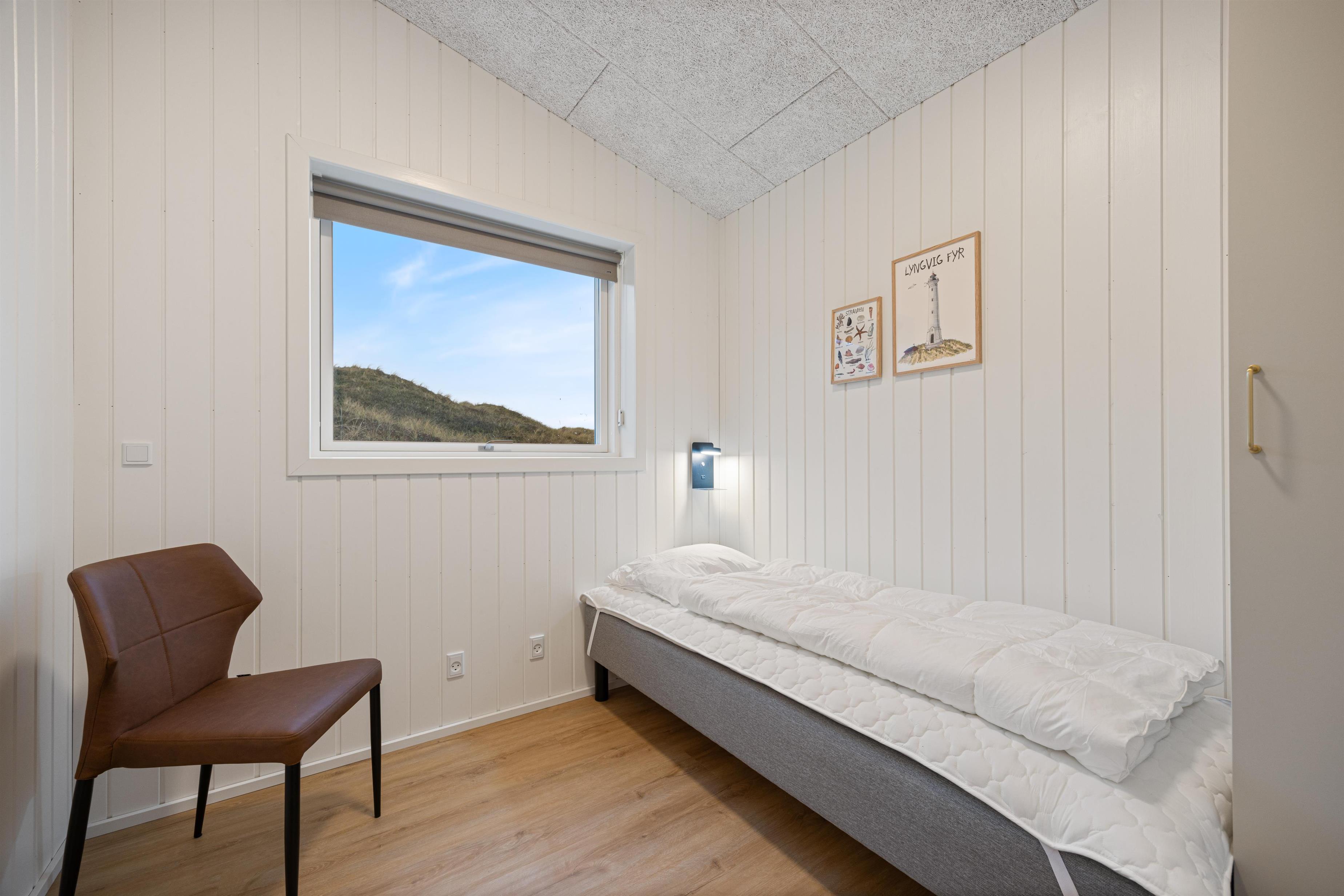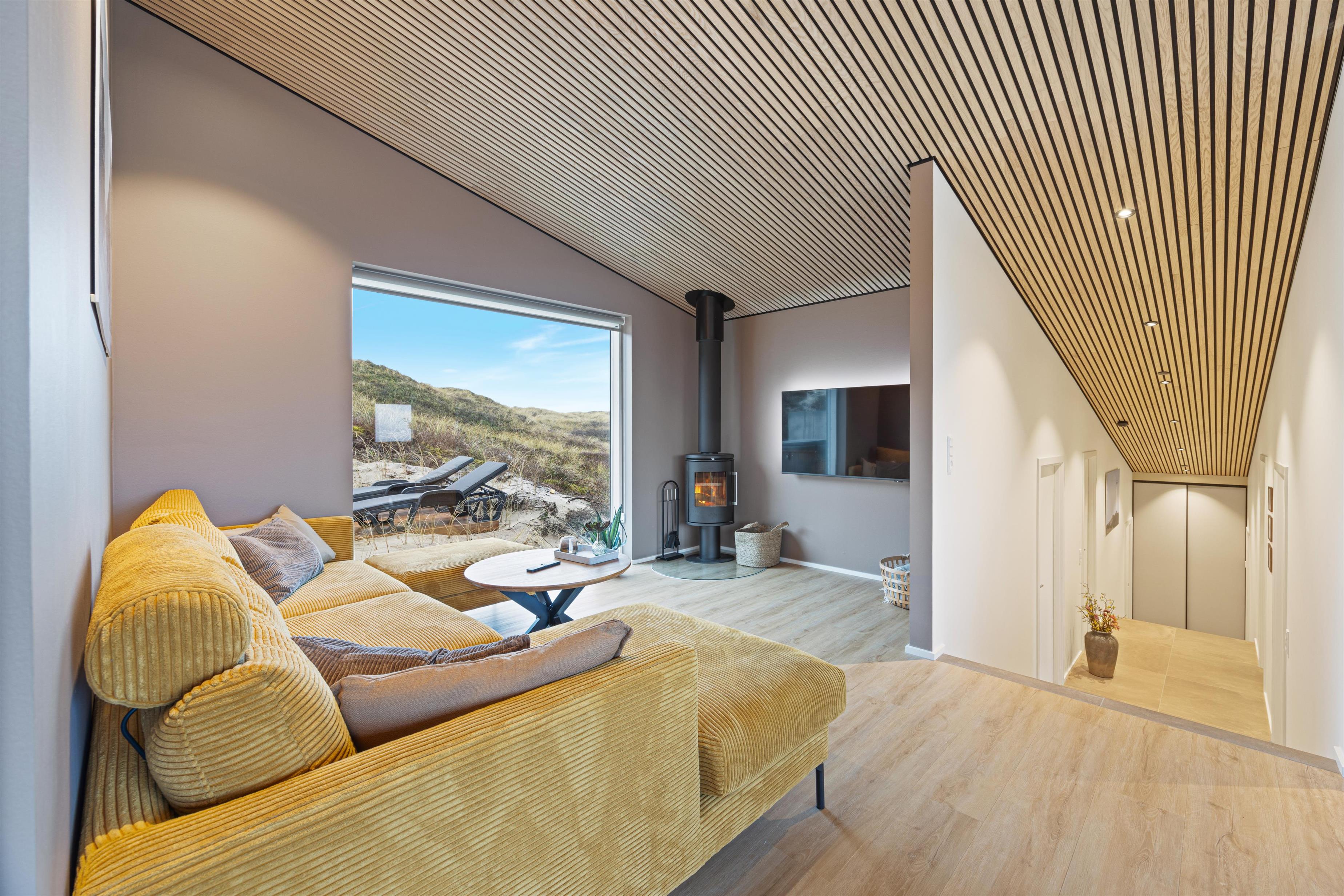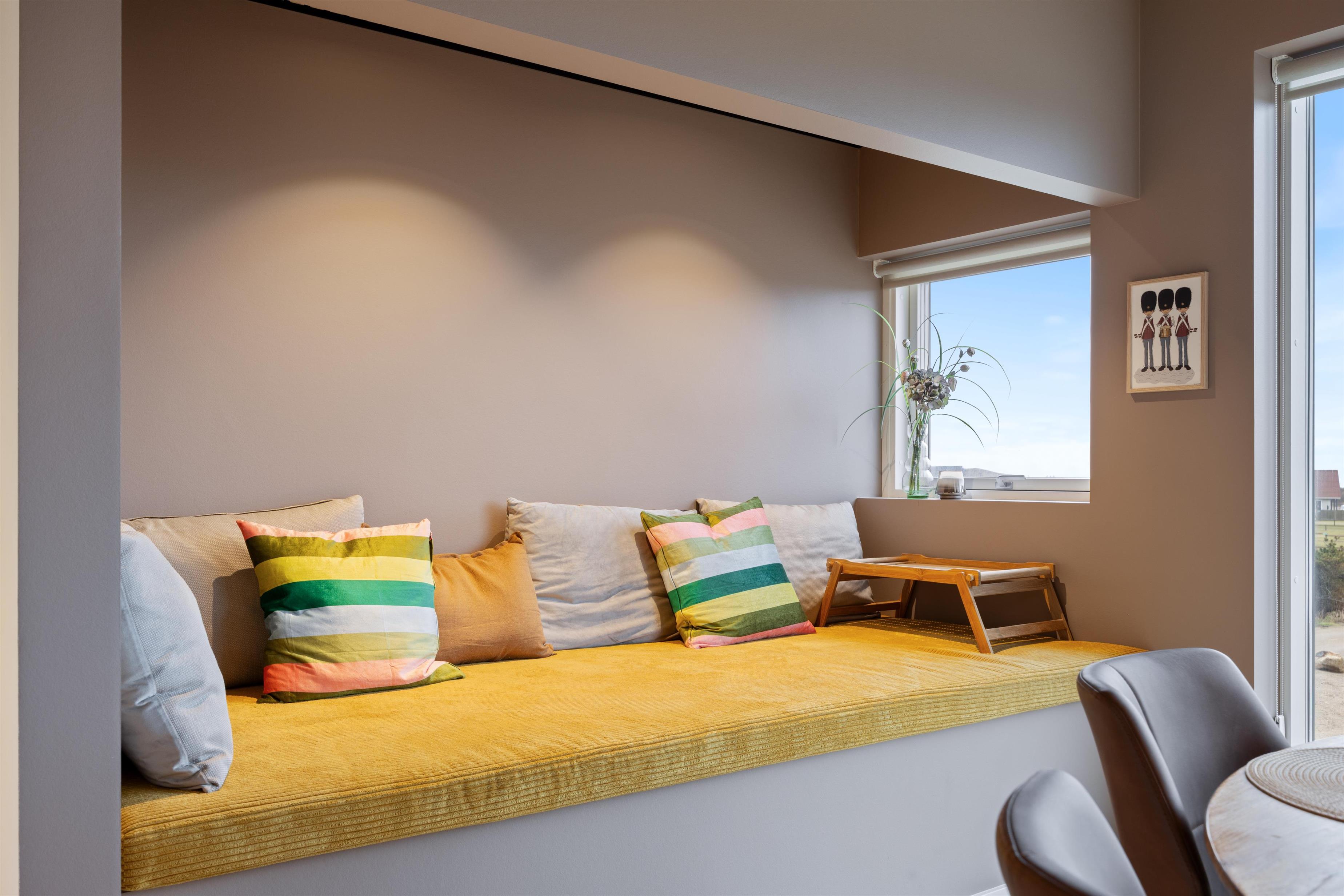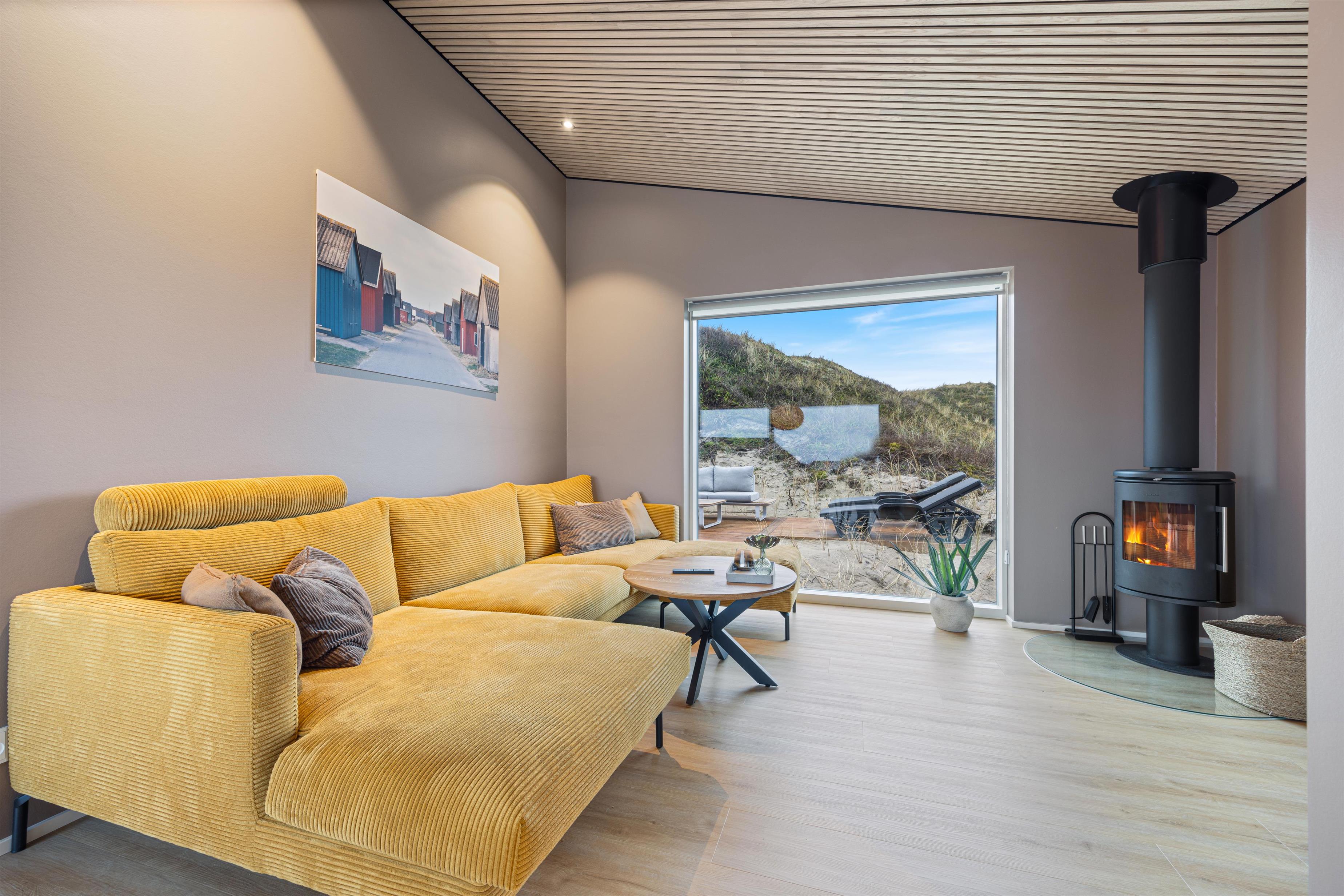 Sommerhuset er indrettet med 4 lyse soveværelser, hvoraf to af dem har eget badeværelse – ideelt til de voksne. I stuen kan I slappe af i de komfortable sofaer, nyde udsigten gennem de store panoramavinduer eller tage en lur i den hyggelige alkove. Den tilhørende brændeovn spreder varme og hygge på de køligere dage.