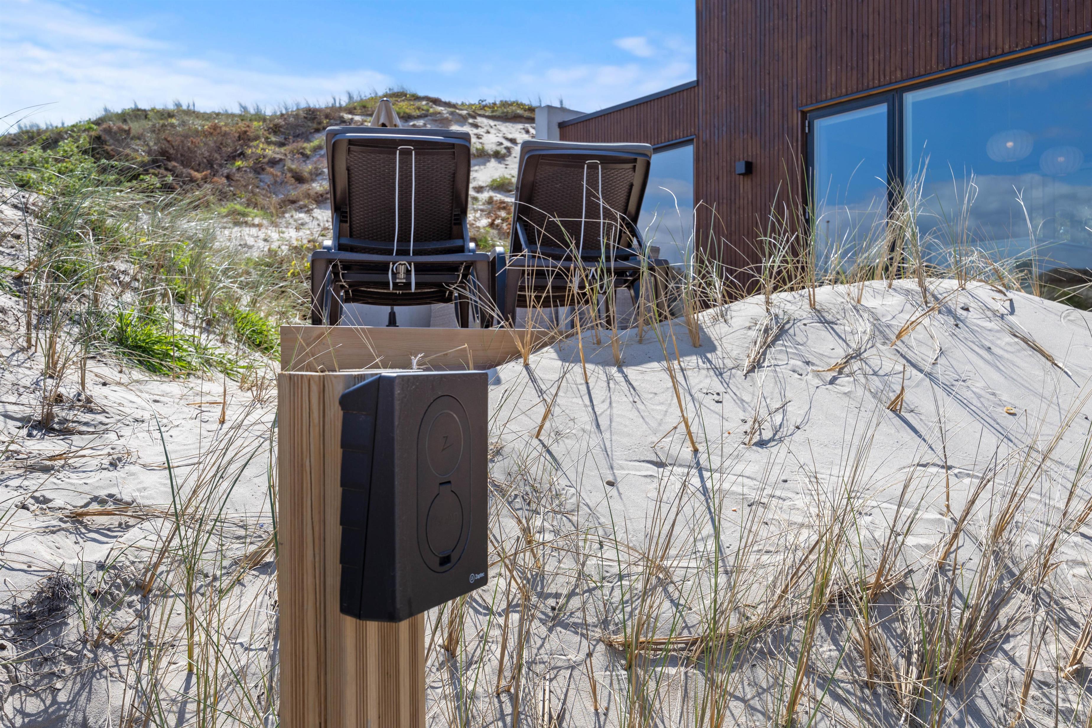 Udenfor finder I også et ladestik til el-bil, så hvis I kører i en el-bil, er der mulighed for at lade direkte ved sommerhuset.