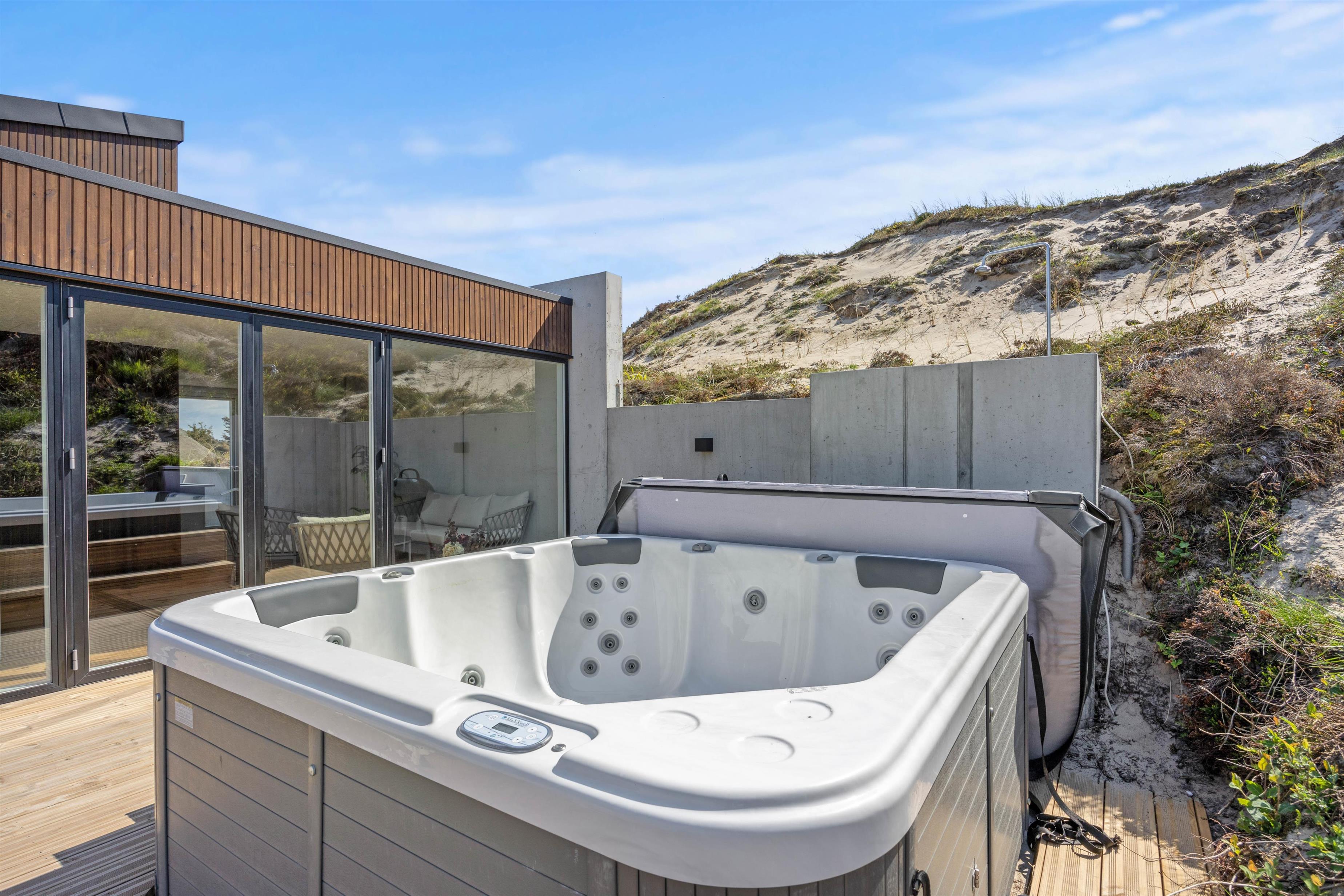 På den afskærmede terrasse finder I en udespa, hvor I kan slappe af efter en dag fyldt med aktiviteter. Der er ligeledes en udebruser til jer, der elsker at skylle sig af udendørs efter en tur i havet. Vær opmærksom på, at udebruseren kun er tilgængelig fra april til november.
