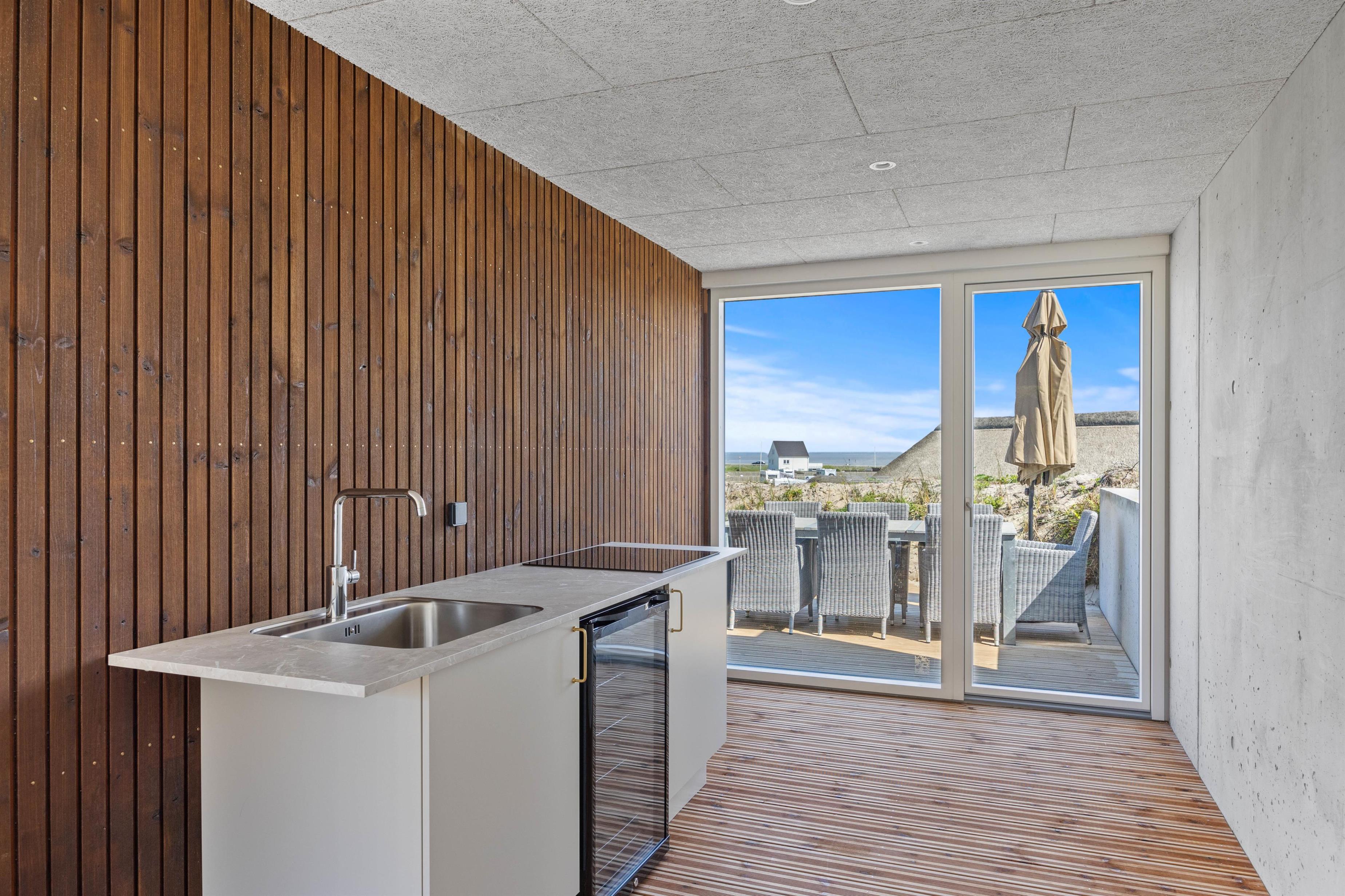 Den overdækkede terrasse byder på et udekøkken, der er udstyret med både vinkøler og kogeplader – perfekt til at tilberede lækre måltider udendørs. Der er naturligvis også en grill til hyggelige grillaftener med familien.