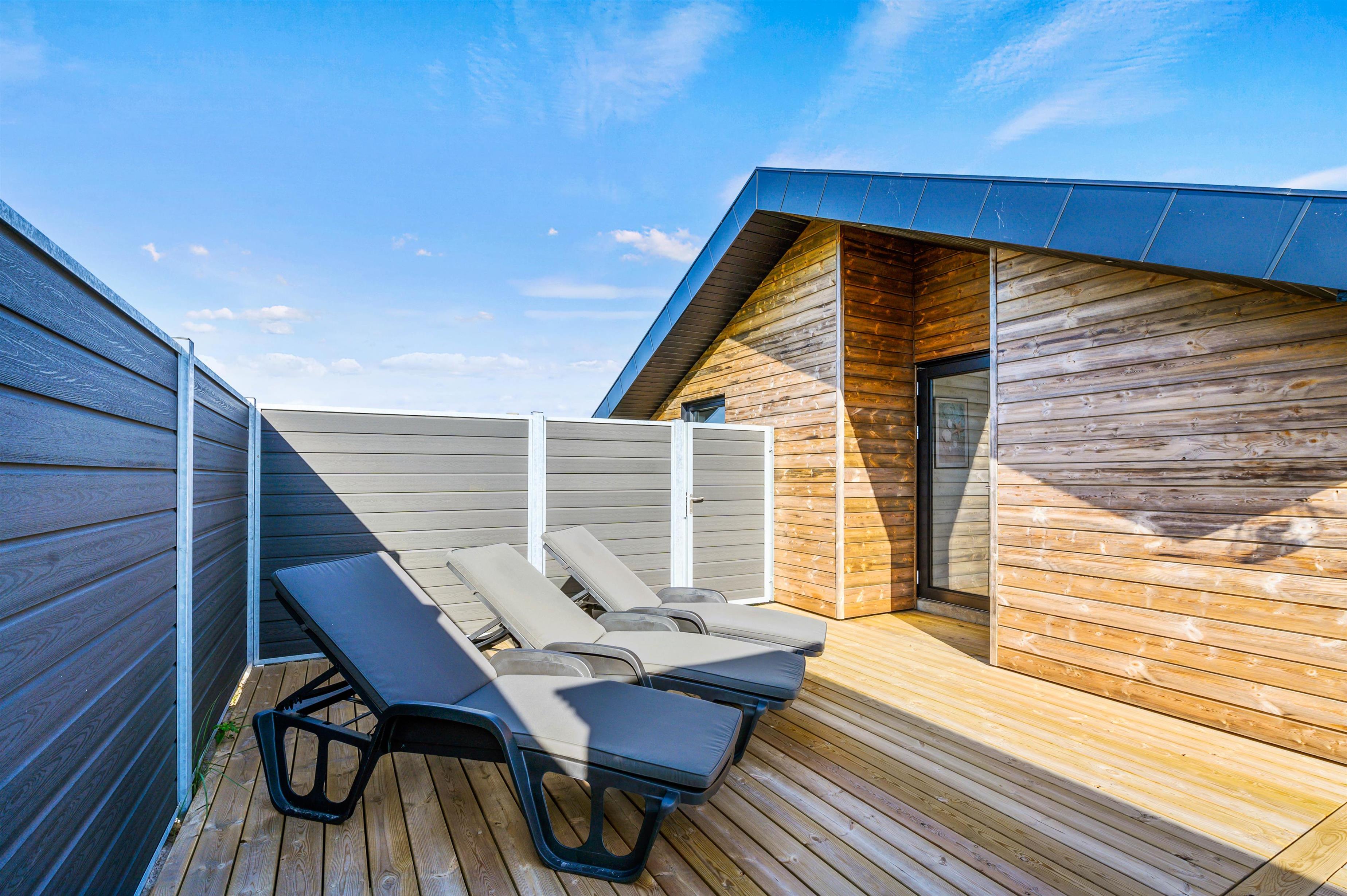 Terrassen er lukket samt delvist overdækket og afskærmet, så I kan sidde i læ for vinden, og hundene kan gå frit rundt. Desuden er der på terrassen en udebruser, dog opvarmes vandet til bruseren af vejret, og vandtemperaturen afhænger derfor af vejrforholdene. Udebruseren er derfor også kun tilgængelig fra april til november.