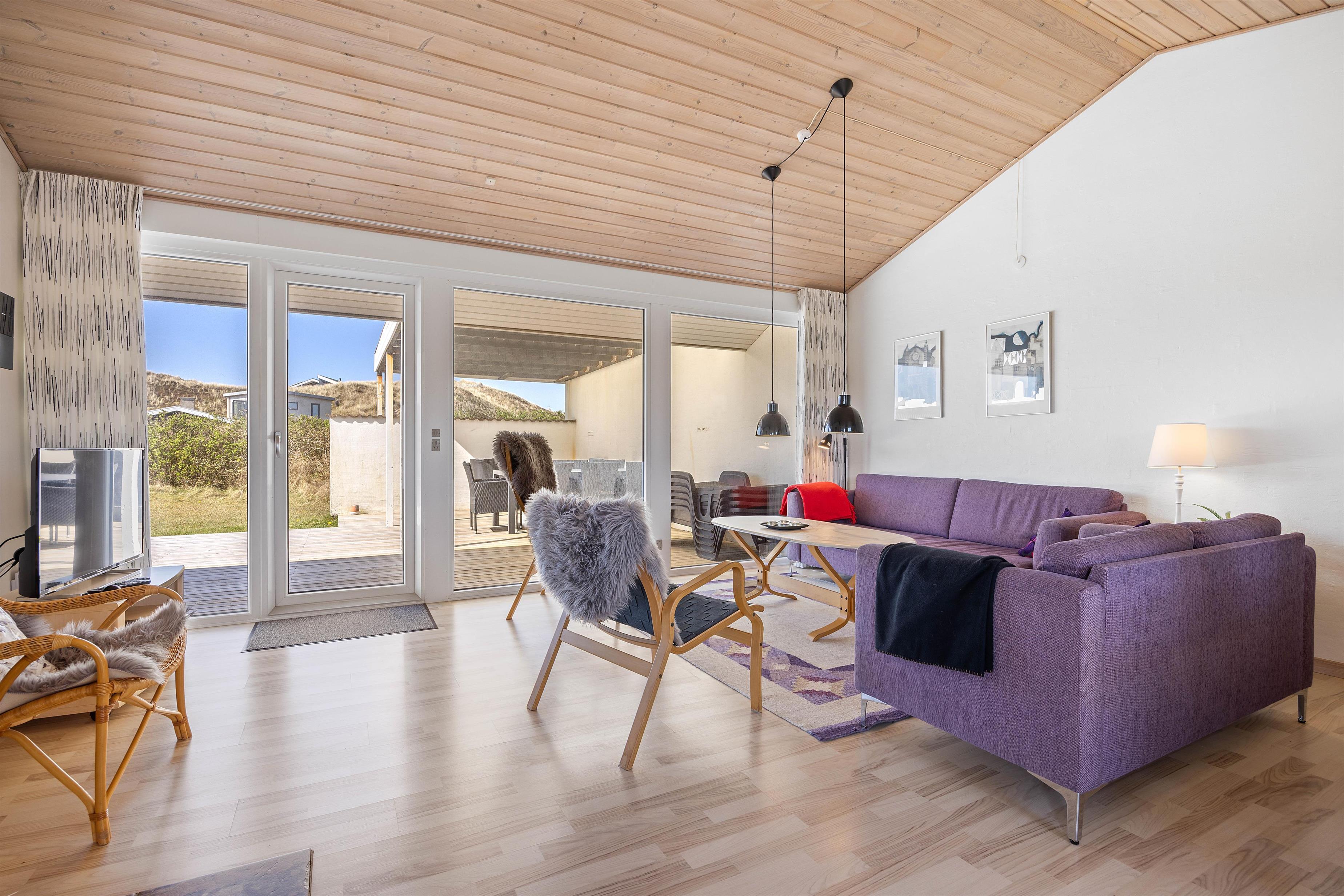 Det dejlige feriehus er både lyst og imødekommende indrettet. Her er der masser af hjerterum til at være sammen med venner og familie. Opholdsstuen er husets hjerte. Herfra kan I sidde og nyde udsigten til klitlandskabet udenfor. På varme sommerdage kan døren til terrassen åbnes, og på den måde skabes en direkte forbindelse mellem husets inde- og uderum og på den måde vokser huset i kvadratmeter. Spisebordet er også placeret i opholdsrummet. Det betyder, at selvom børnene ikke sidder ved bordet under hele måltidet, så har I stadig en følelse af at være sammen.