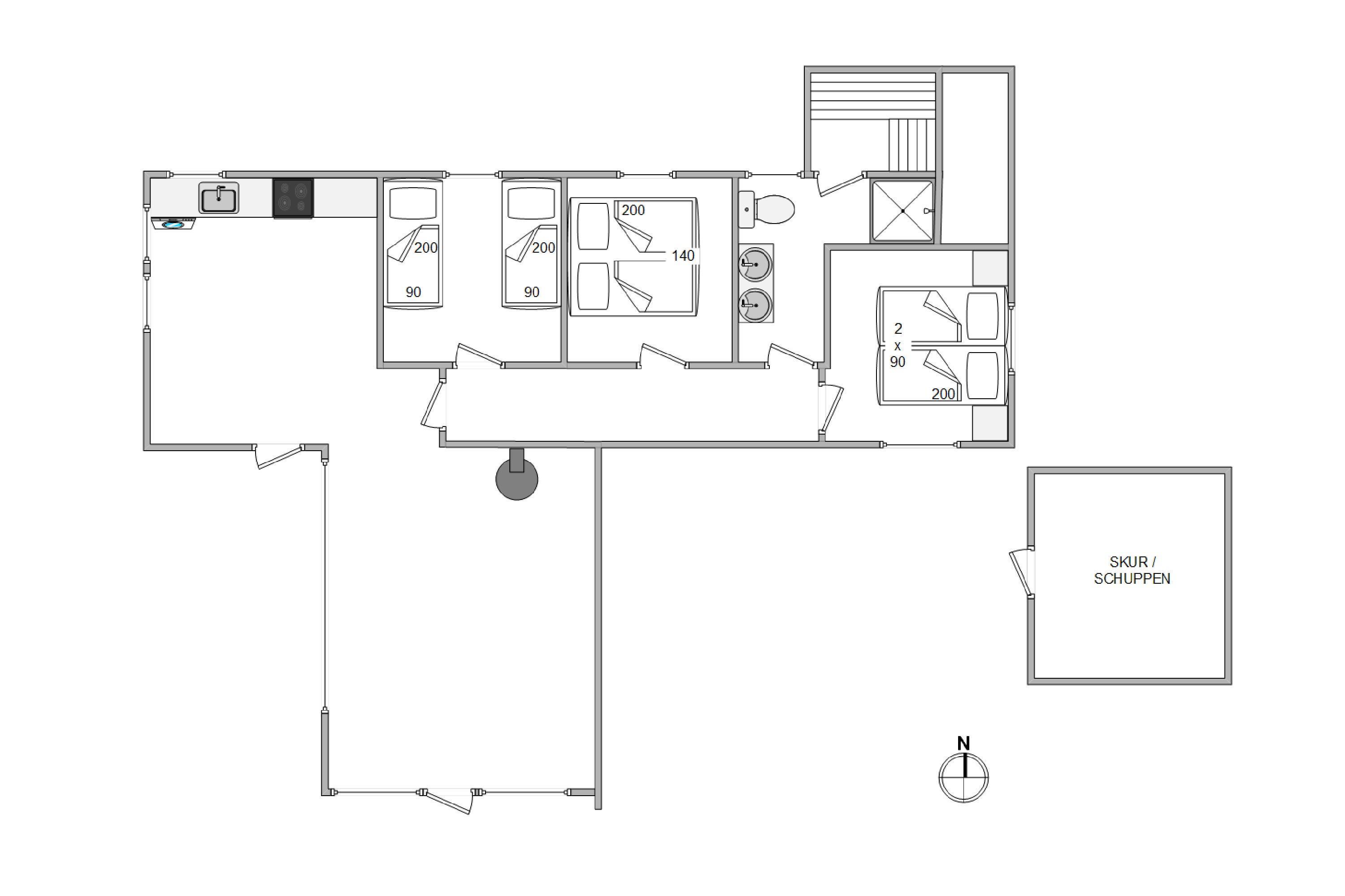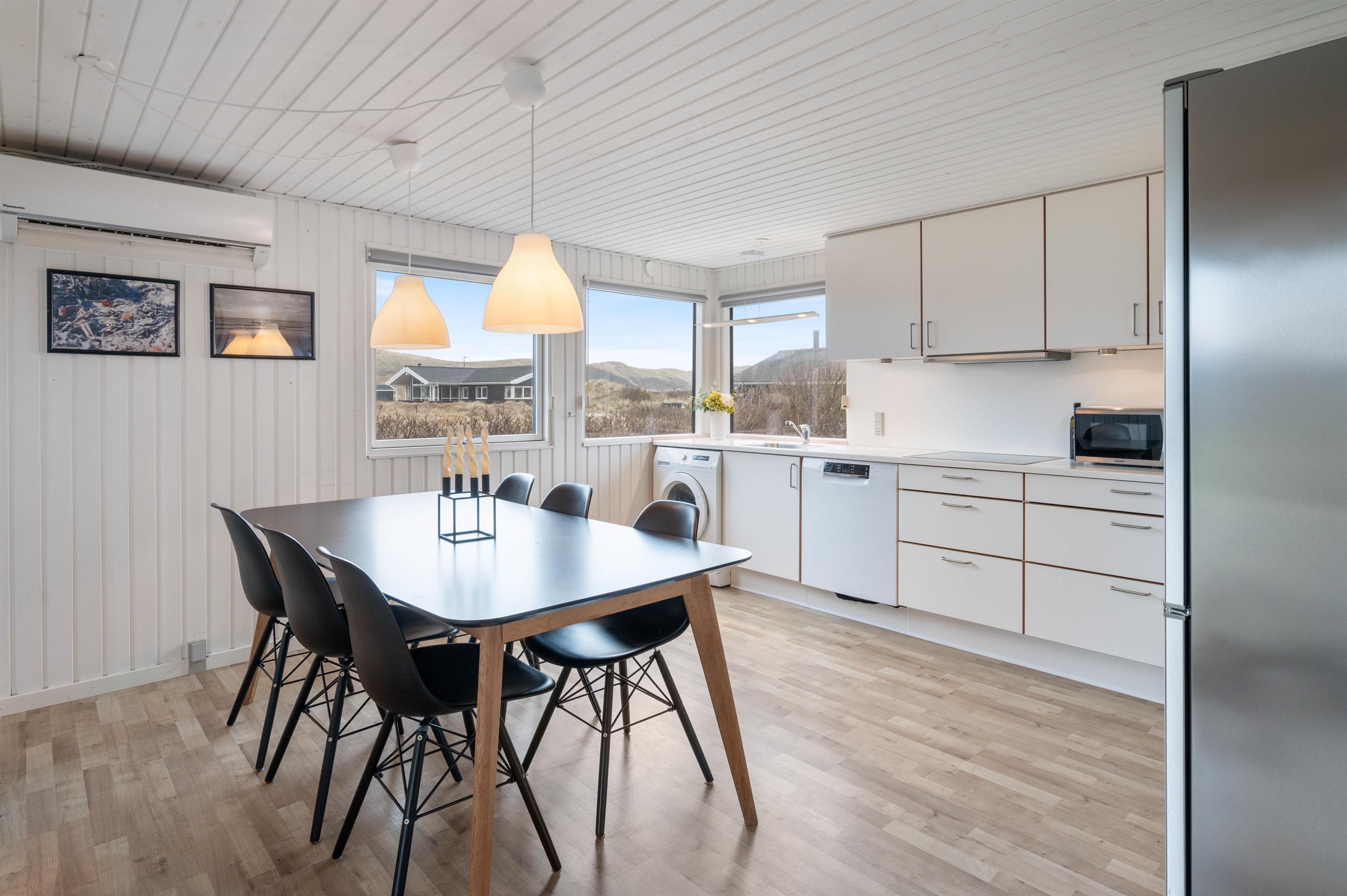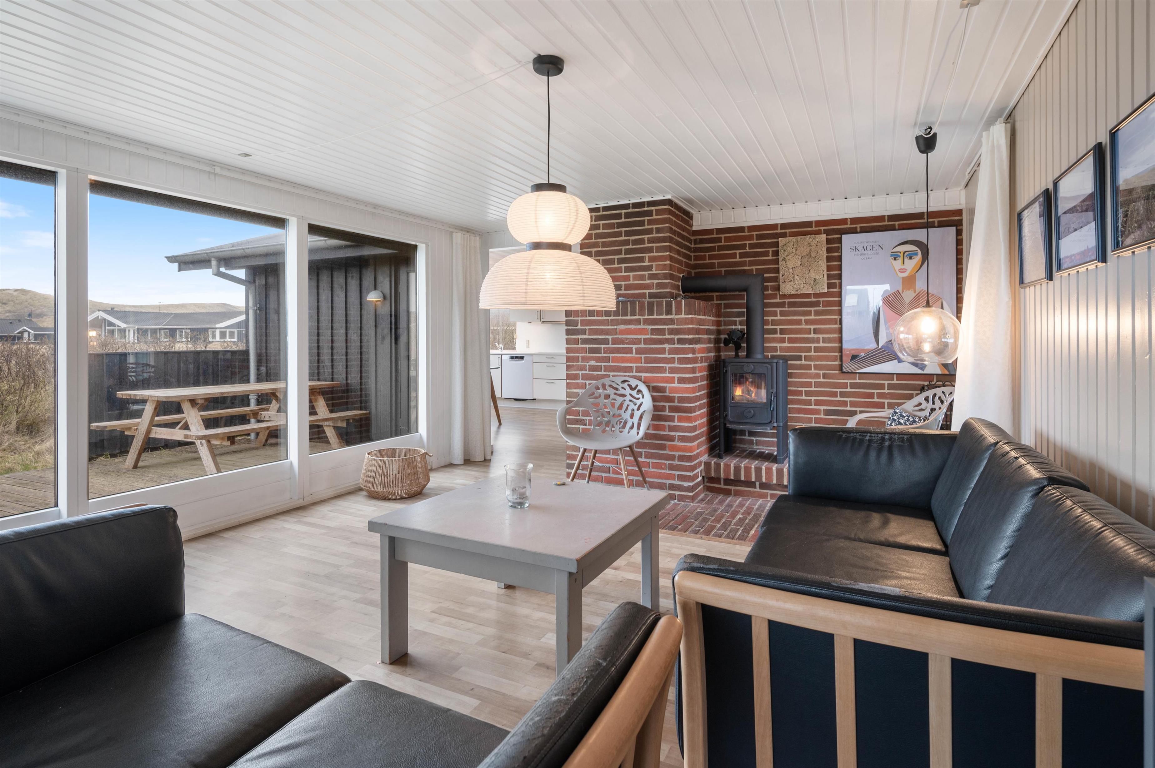 Her får I ekstra komfort: I det hyggelige sofahjørne står brændeovnen klar til at varme jer på de kolde feriedage, og fra badeværelset har I adgang til en skøn sauna, hvor I kan tanke ny energi efter en oplevelsesrig feriedag.