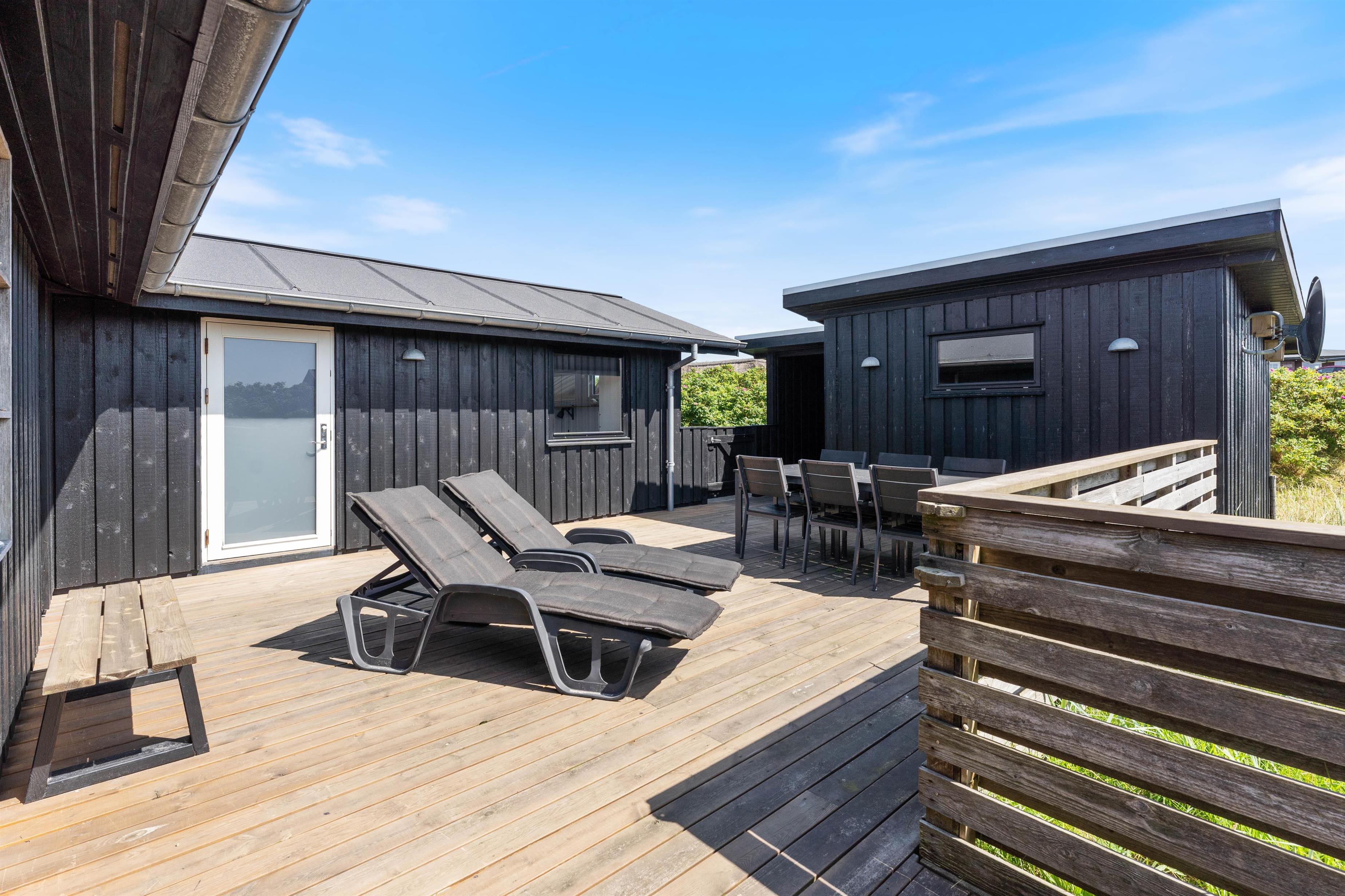 Terrassen er lukket af, og I kan roligt lade både børnene og hunden lege frit uden at skulle holde opsyn. I sommersolen kan I nyde varmen fra liggestolene med en kold drink i hånden, og på de lune aftener kan I tænde op i grillen og forkæle jer selv og hinanden med et ekstra godt feriemåltid.