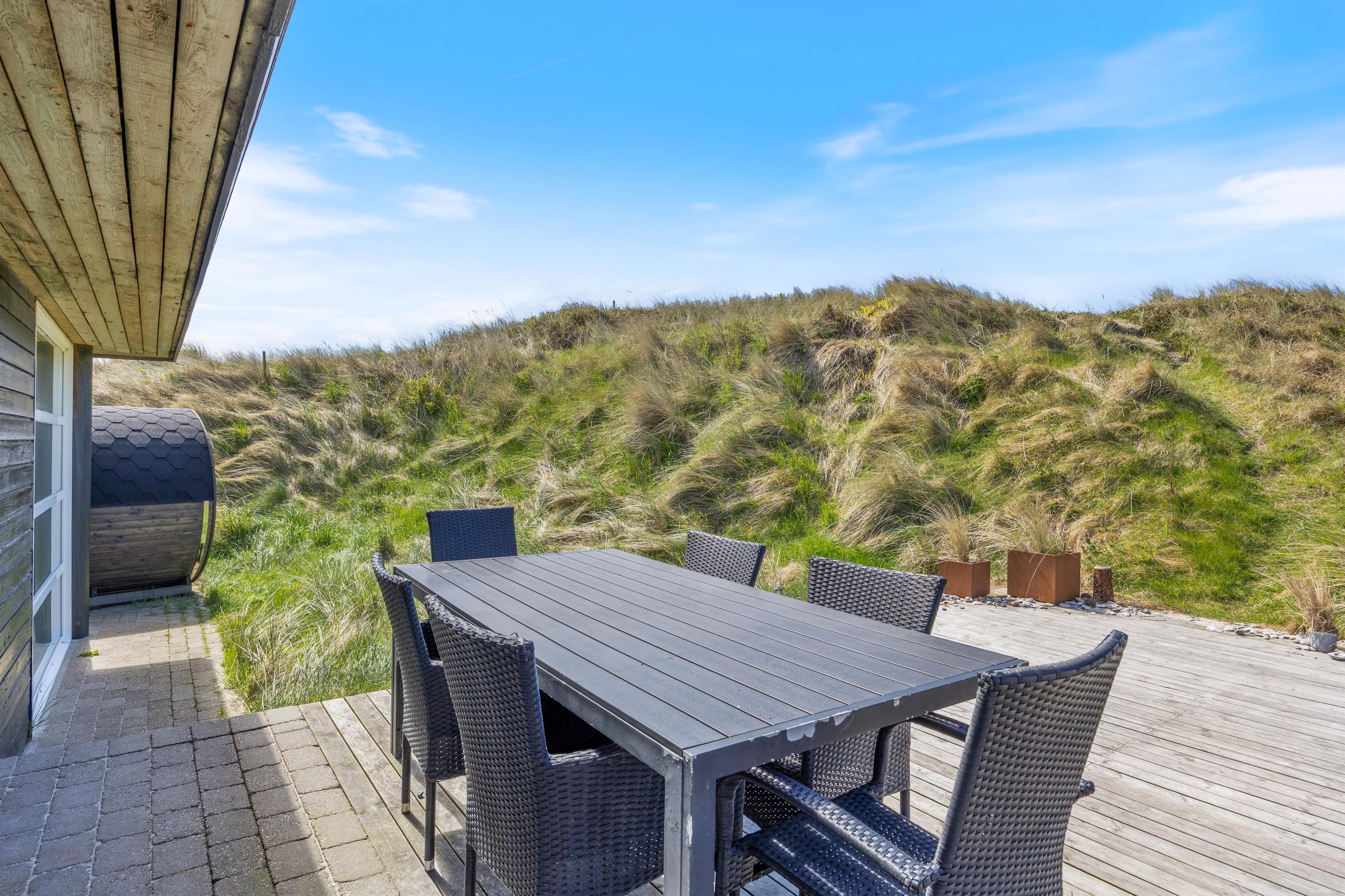 Rundt om huset er der gode terrasser, hvorfra det er muligt at grille eller bare at sidde ude og nyde solen samt læ fra den nærtliggende klit. Når I trænger til at komme helt ned i gear, kan I sætte jer ned i spaen og nyde den skønne vesterhavsluft.
