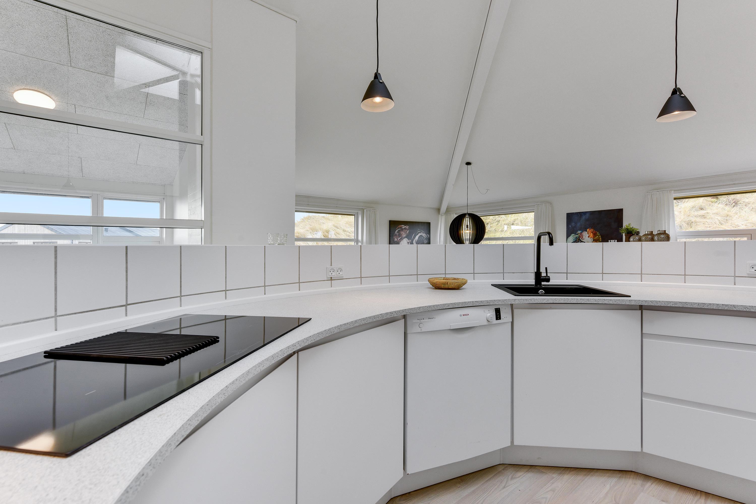Sommerhuset er bygget i en enkel og flot arkitektur, som passer godt ind i klitlandskabet, og de store vinduer sørger for at trække landskabet med helt ind i stuen og det forskudte køkken- og spiseområde. Omkring et godt måltid med lokal råvarer, kan I tilbringe mange timer sammen.