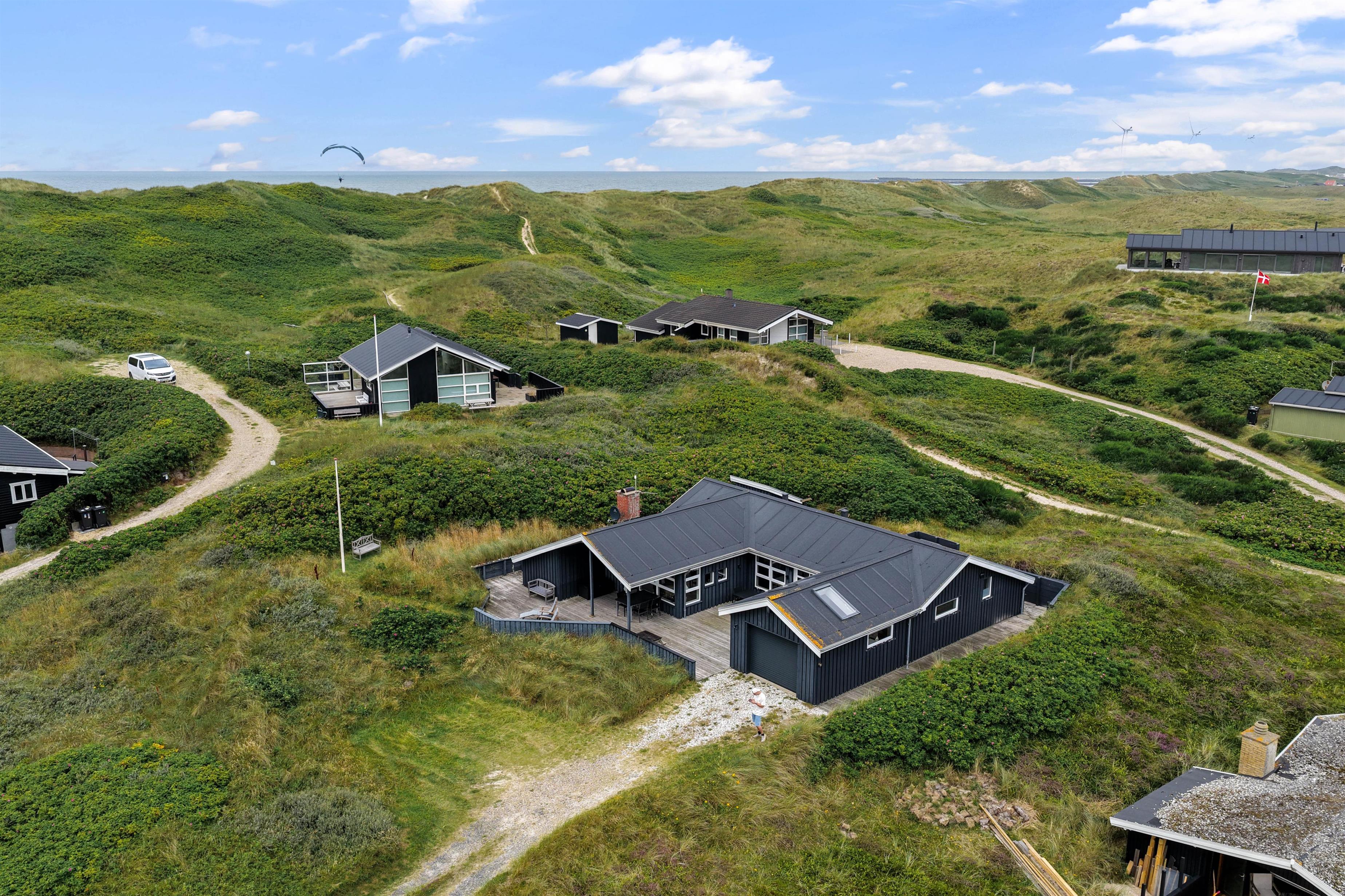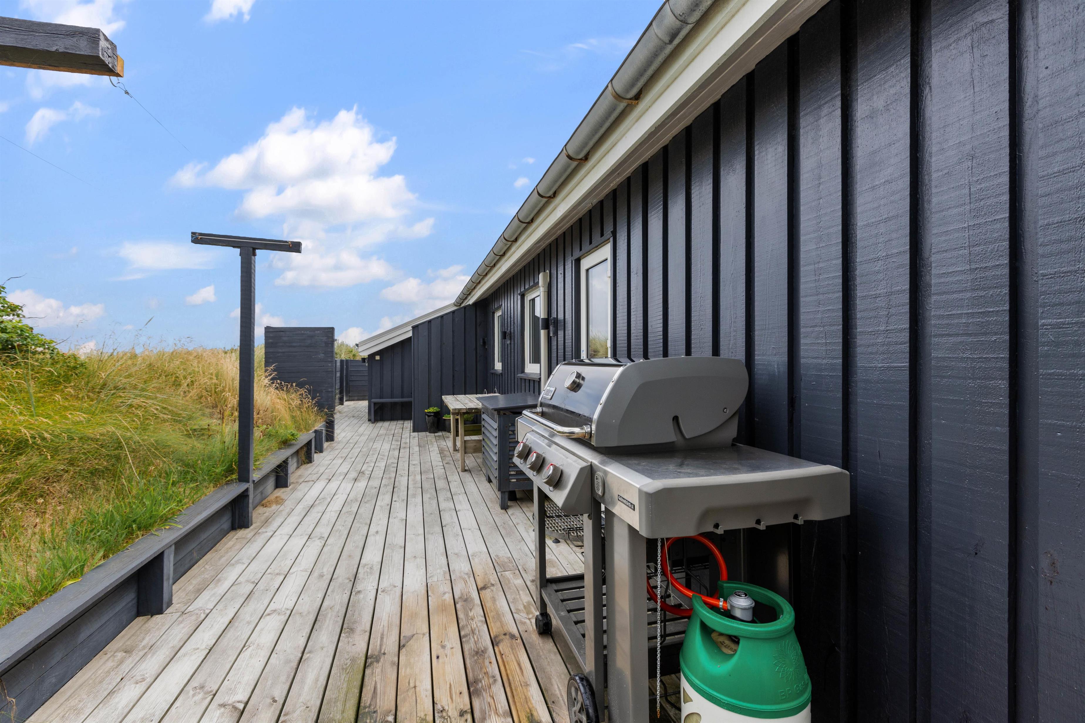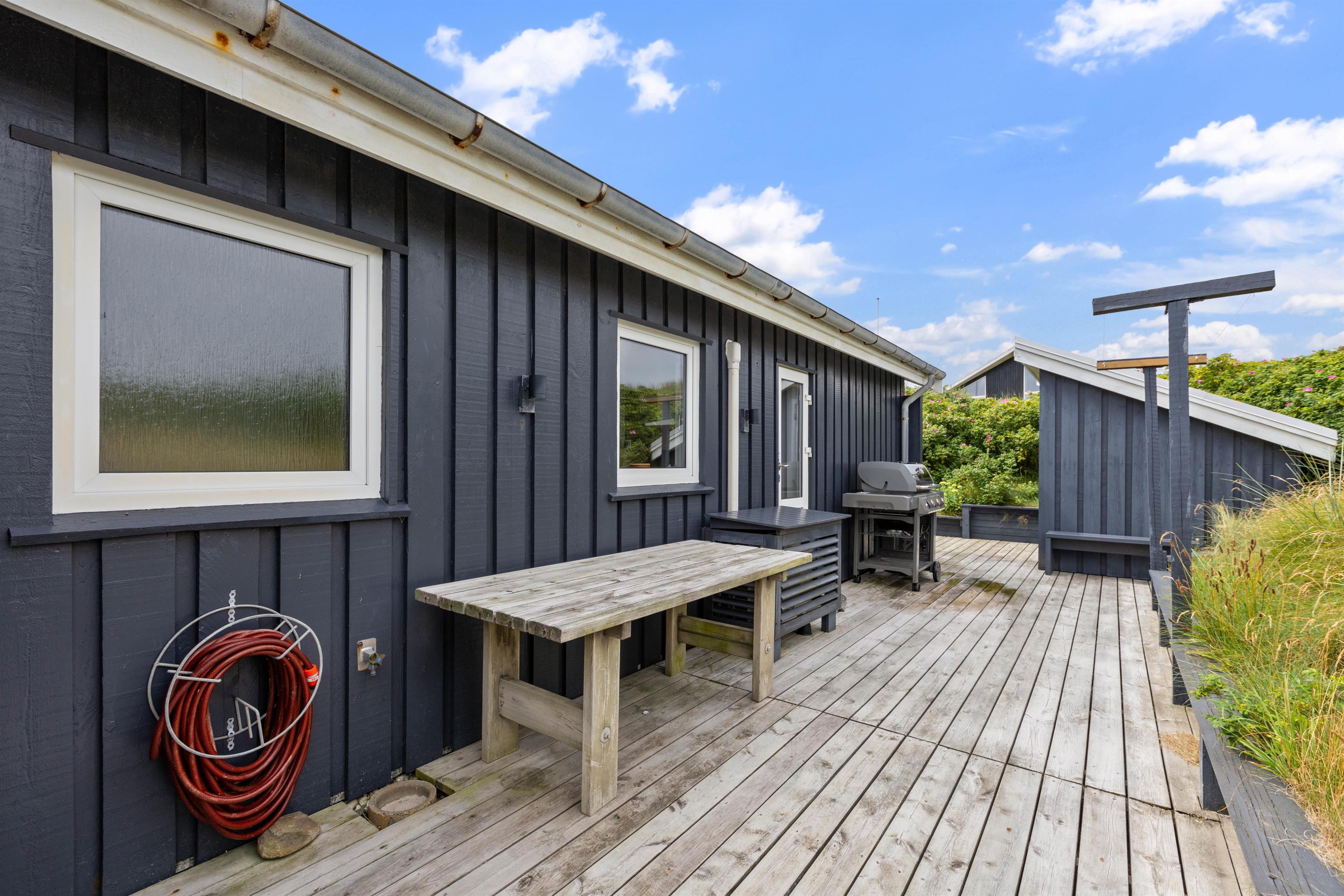 Sommerhuset ligger på en naturskøn klitgrund. Her finder I også den delvist afskærmet og overdækket terrasse, hvor I virkelig kan nyde den danske natur og den friske luft. På terrassen finder i komfortable havemøbler, lækre solvogne så I kan nyde solstrålerne og en grill til et lækkert grillmåltid når vejret tillader det. Til børnene er der en sandkasse, så de bliver holdt beskæftiget.