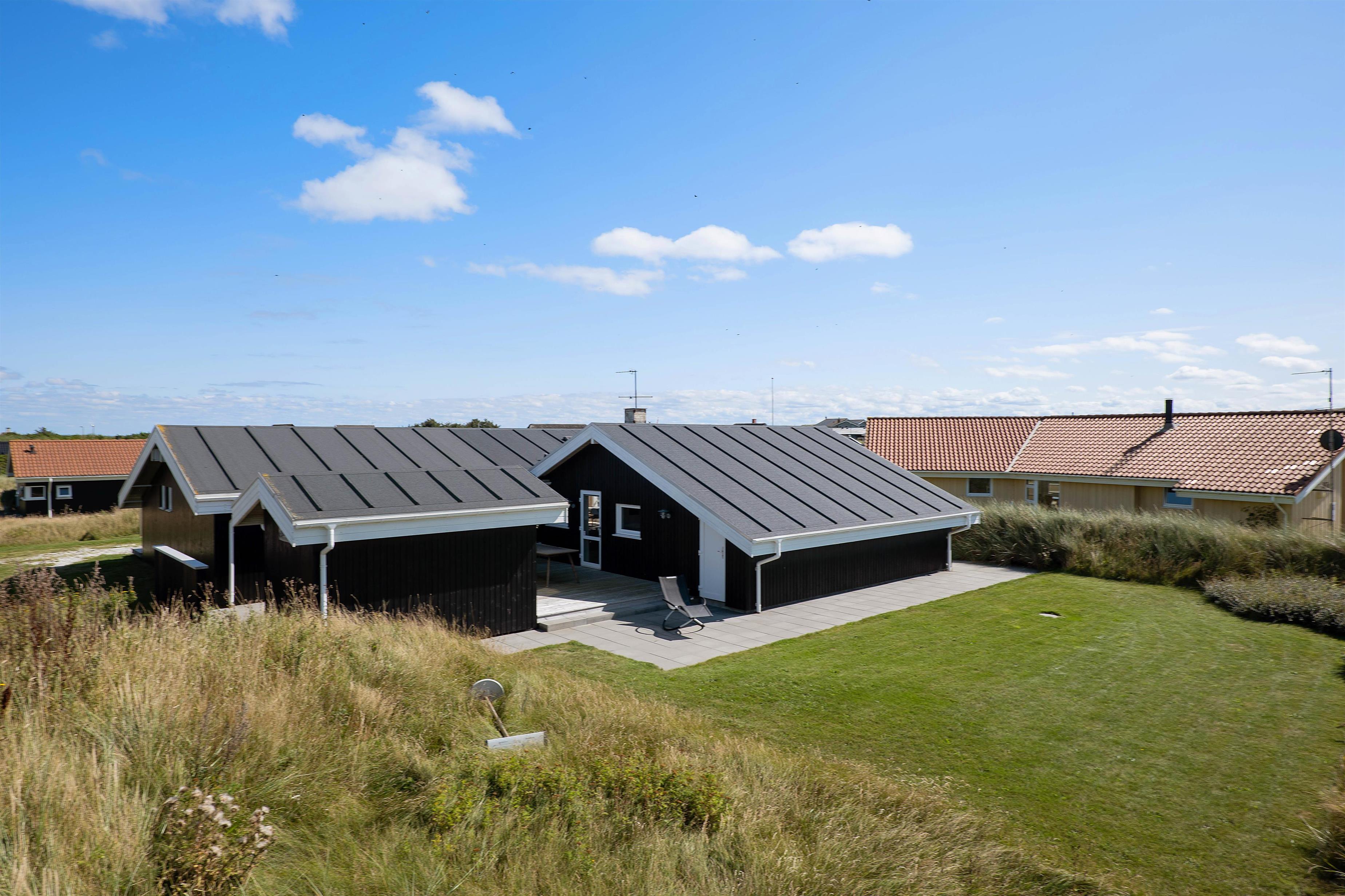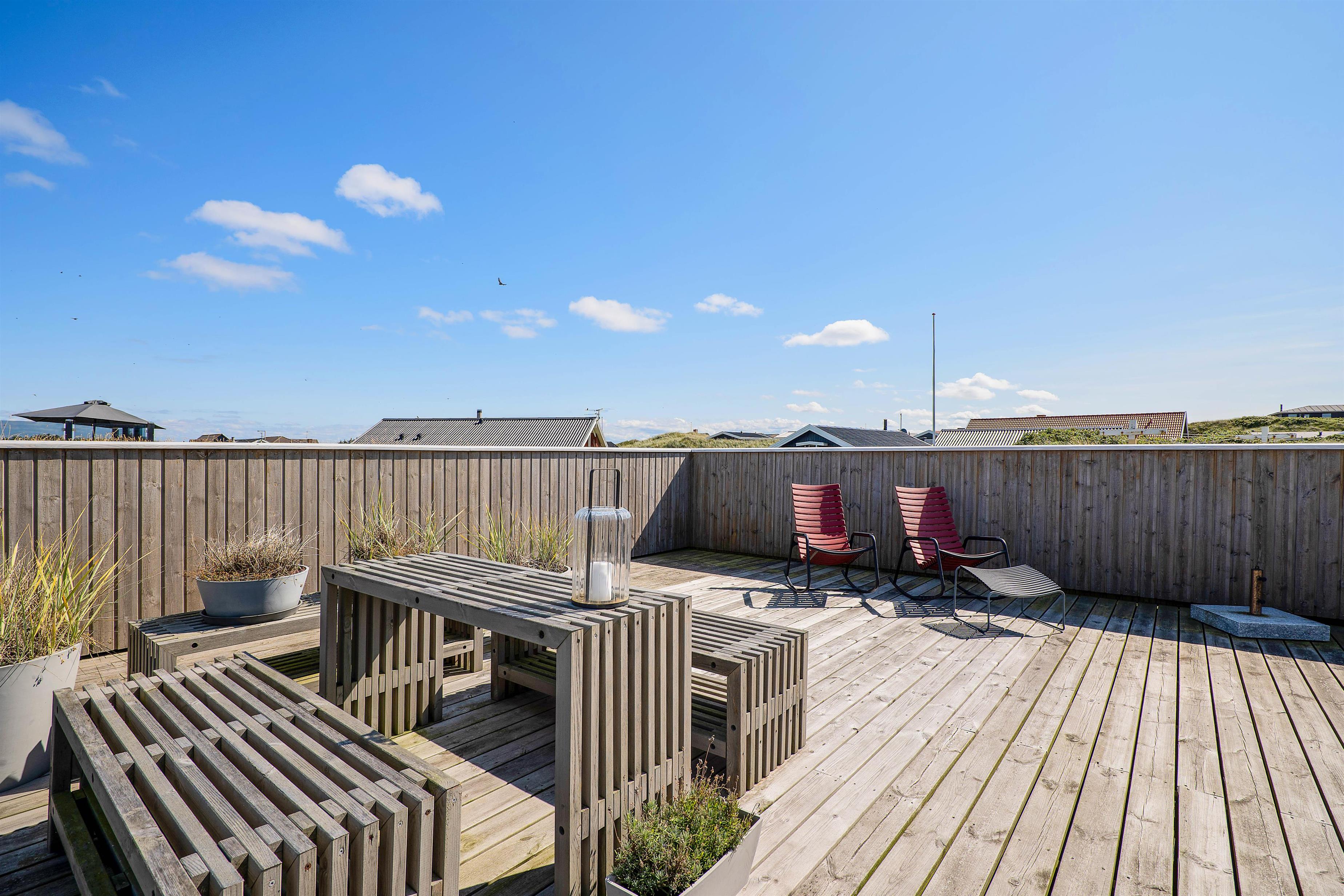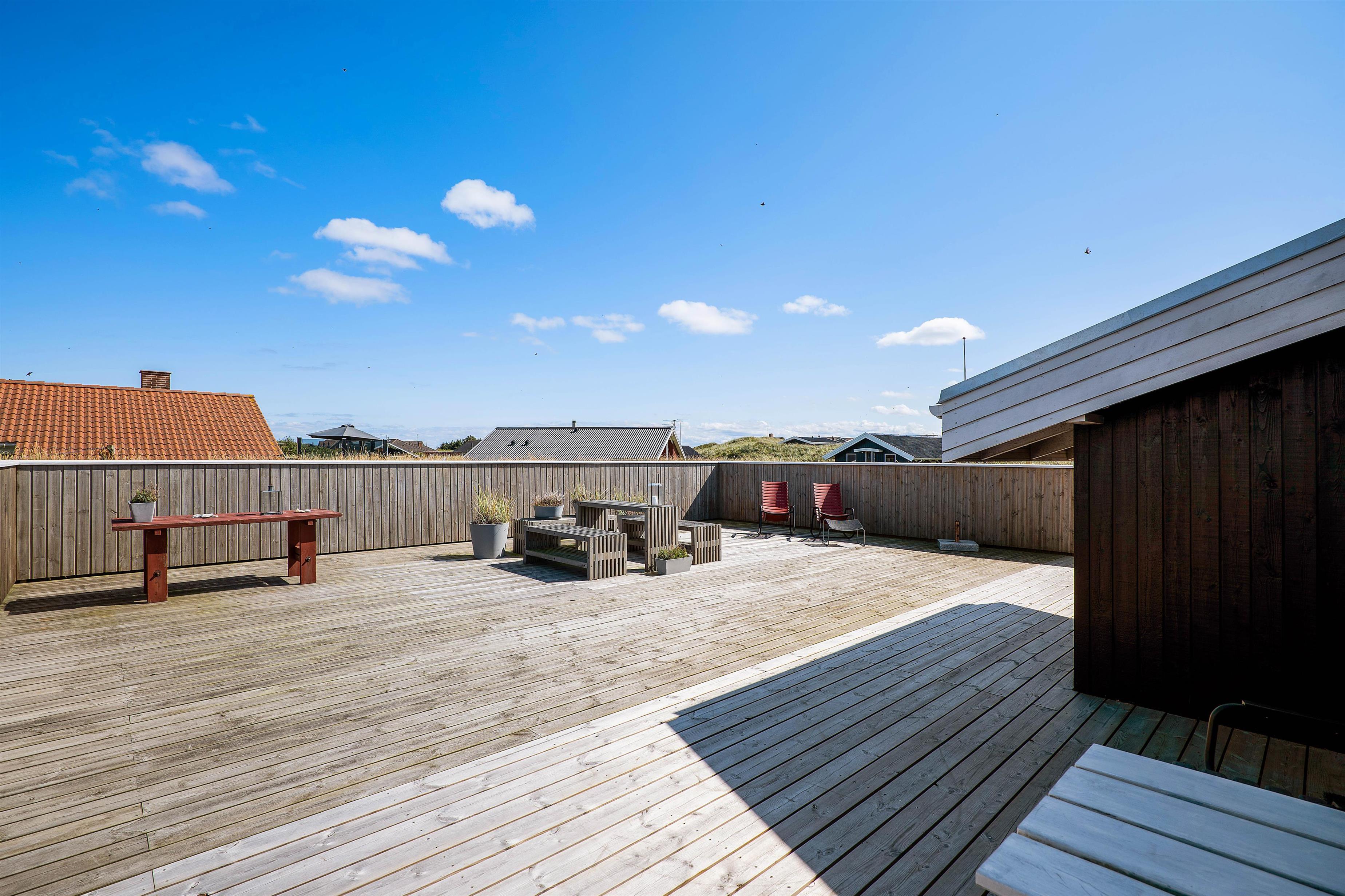 Sommerhuset har en lækker, stor træterrasse, hvor hele familien kan nyde en solrig dag. Lige fra solen står op til solnedgang, kan I nyde solen, da den store terrasse strækker sig fra øst- til sydsiden af sommerhuset. Desuden er der en terrasse mere, som er vest- og nordvendt. Her kan I nyde et par gode bøffer med et koldt glas vin, mens solen går ned bag klitterne. Begge terrasser er delvist afskærmede, så I kan sidde i læ for vinden.