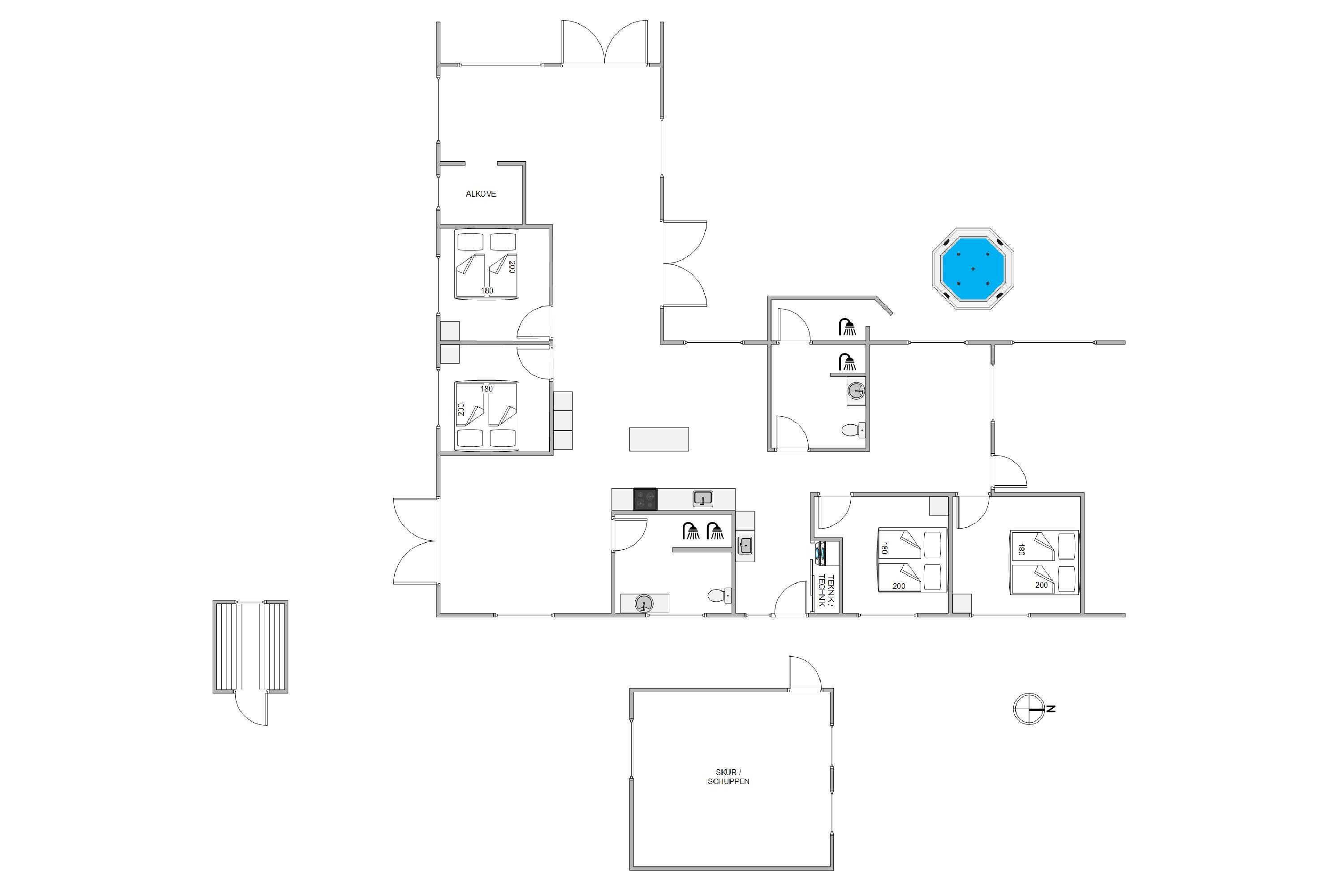 Sommerhuset byder på rummelige og smukt indrettede indearealer med hele 4 soveværelserog 2 ekstra sovepladser i en hyggelig alkove. Der er 2 badeværelser med gulvvarme, så I kan nyde en varm og behagelig start på dagen. Med praktiske faciliteter som opvaskemaskine, vaskemaskine og tørretumbler er der sørget for nem og bekvem husholdning.