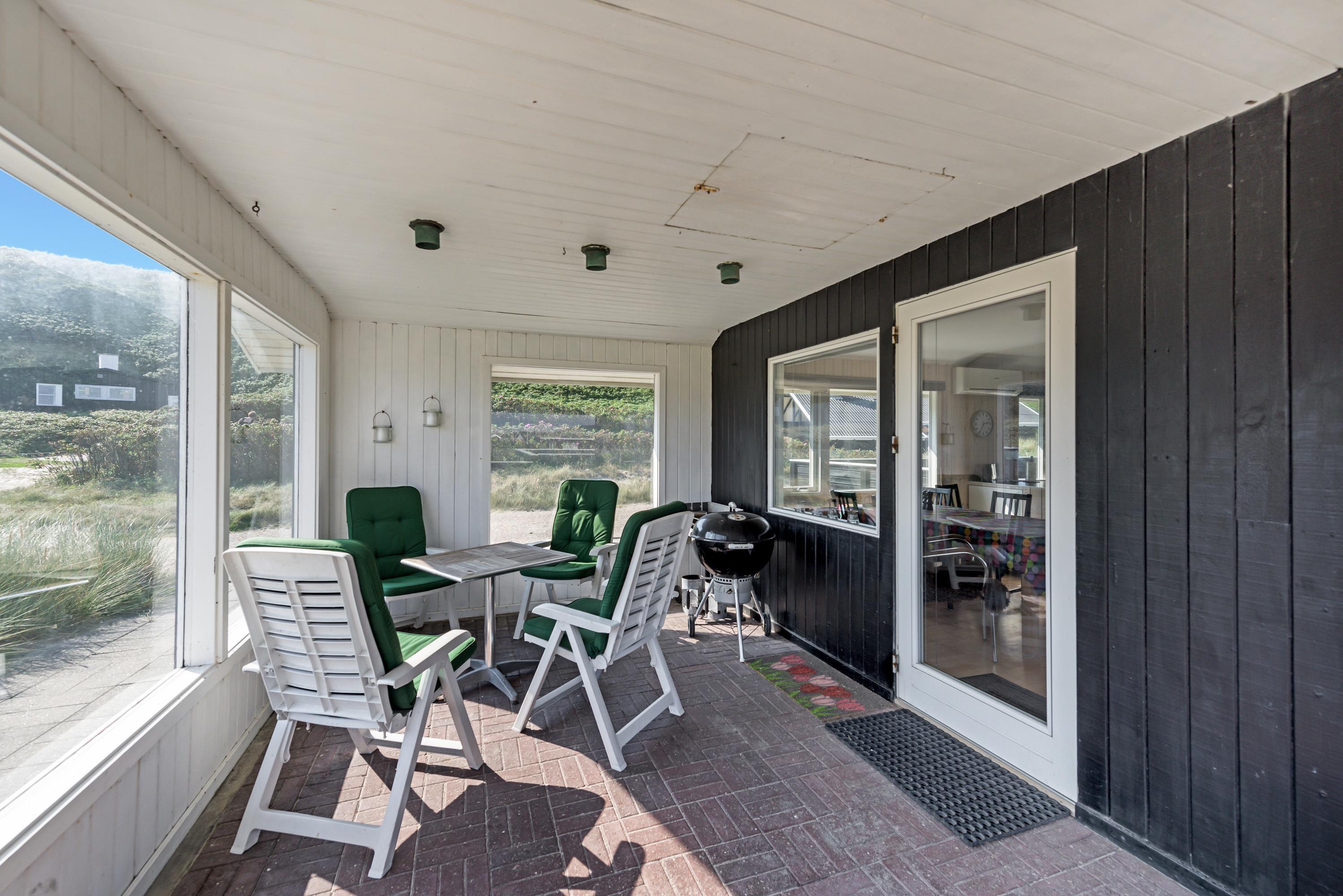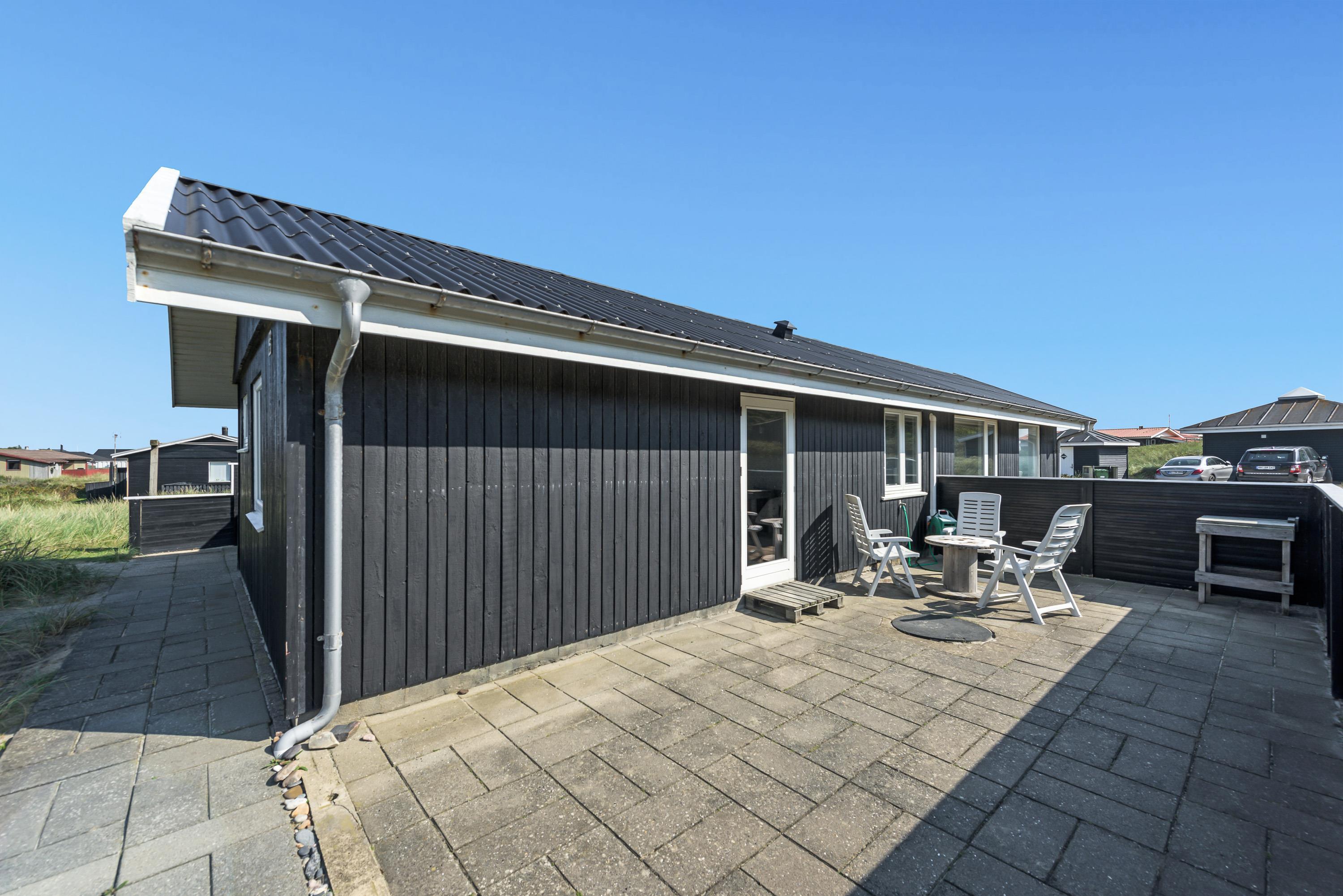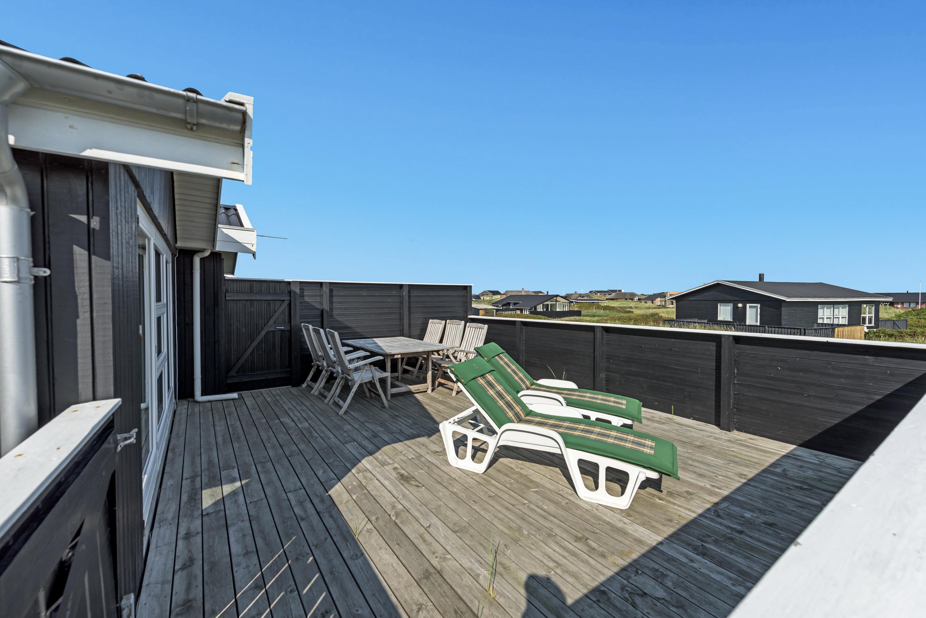 I kan forlænge jeres aftener ude på den flotte træterrasse, som går næsten hele vejen rundt om huset og også indeholder en overdækket terrasse, som har lukket den ene side af. Her kan I sidde efter at børnene er lagt i seng, og nyde hinanden og skåle for en god ferie – måske I kan se solnedgangen i klitterne.