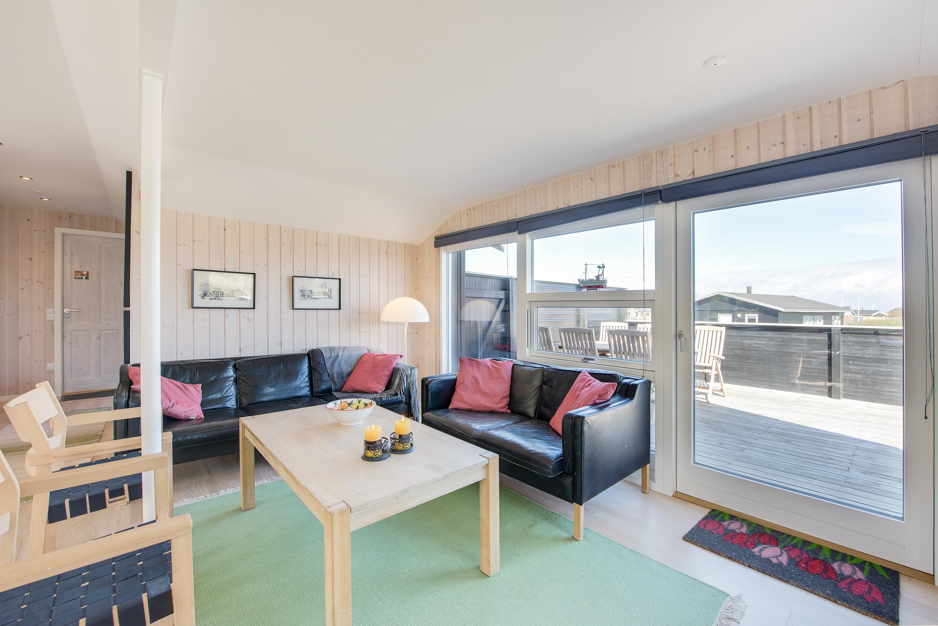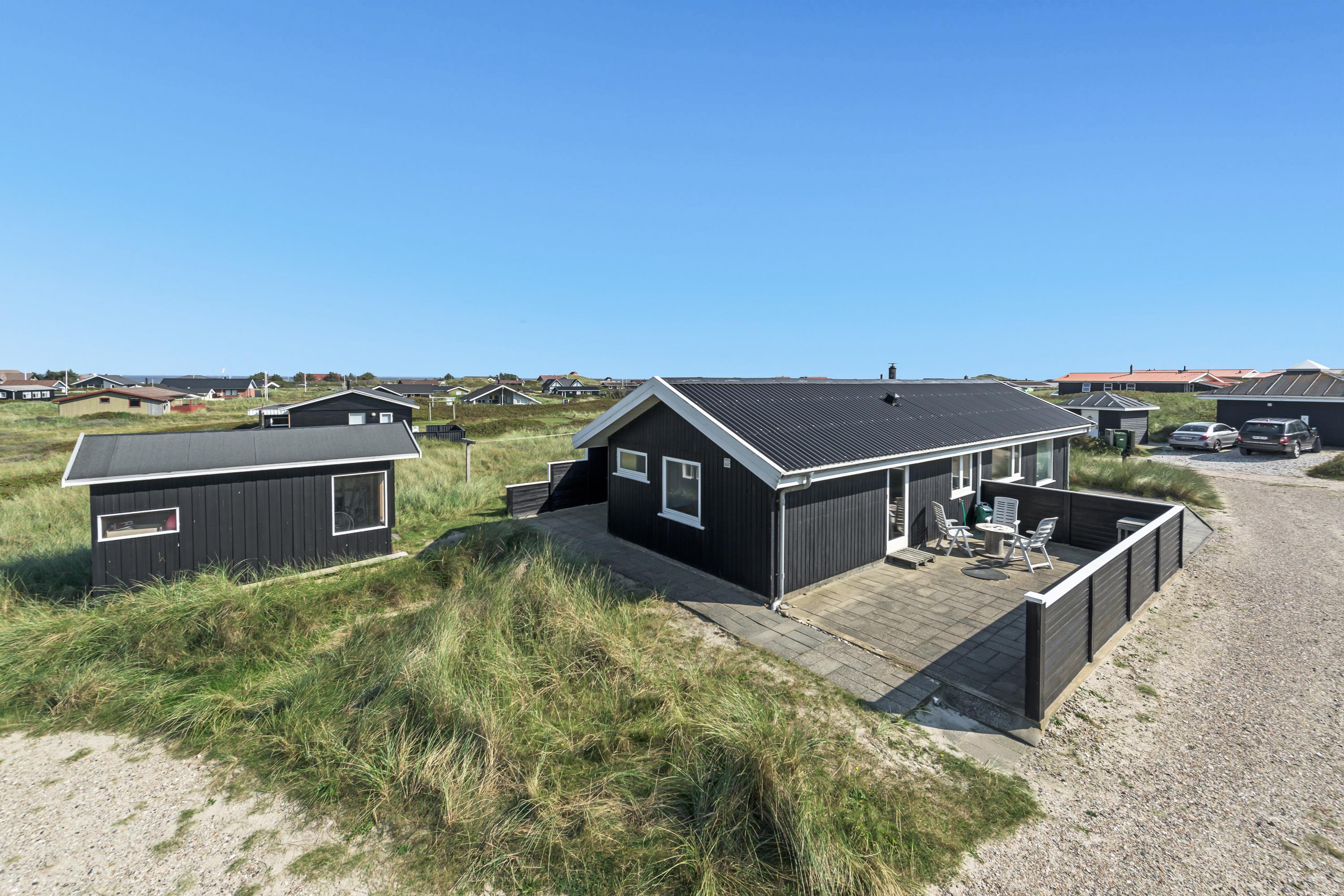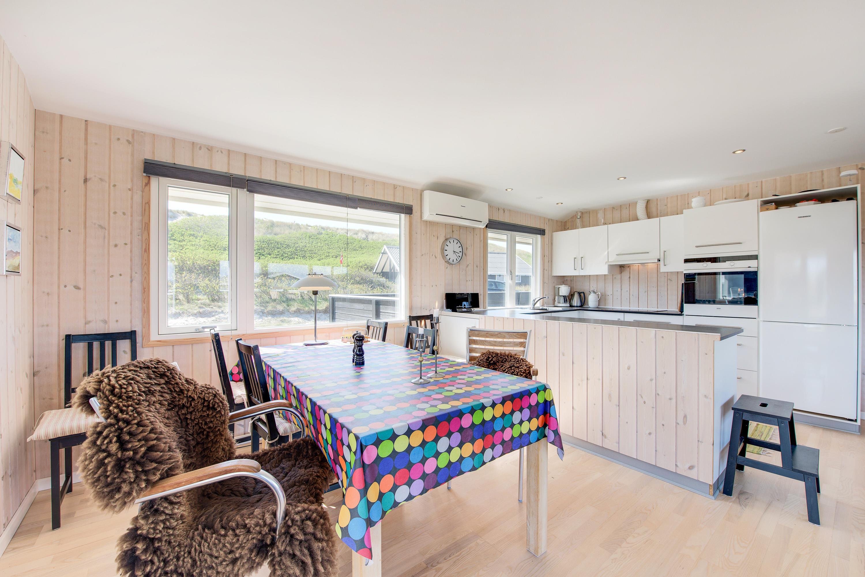 I kan forlænge jeres aftener ude på den flotte træterrasse, som går næsten hele vejen rundt om huset og også indeholder en overdækket terrasse, som har lukket den ene side af. Her kan I sidde efter at børnene er lagt i seng, og nyde hinanden og skåle for en god ferie – måske I kan se solnedgangen i klitterne.
