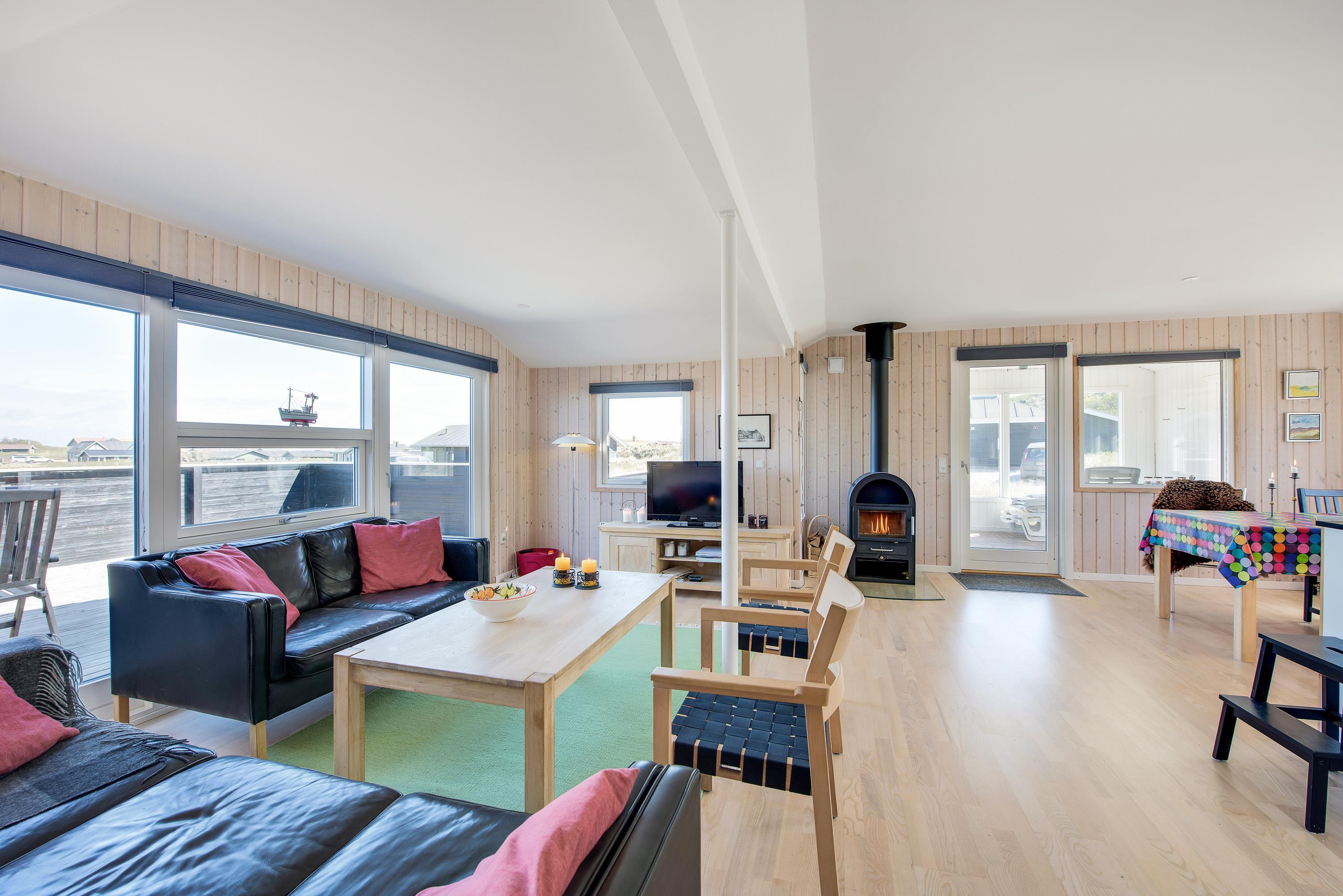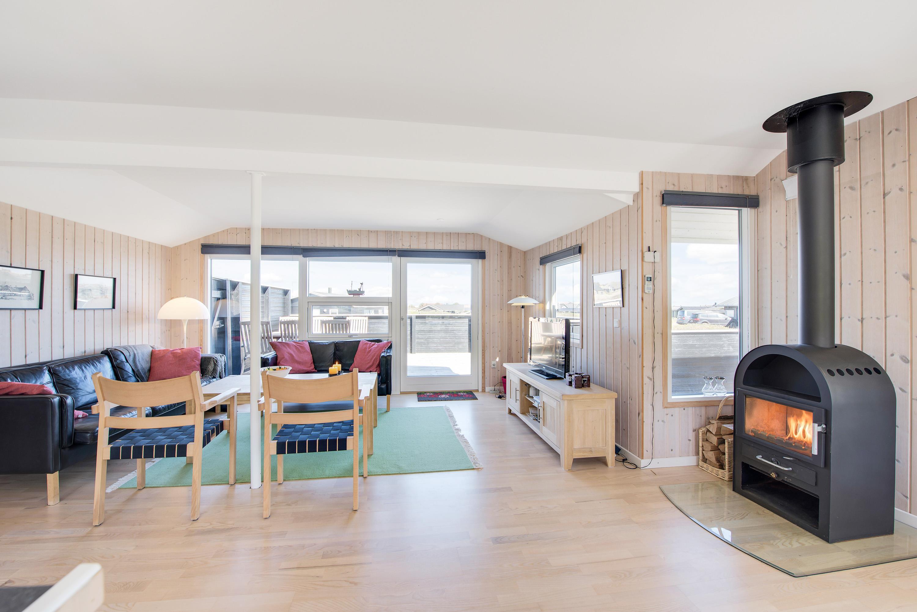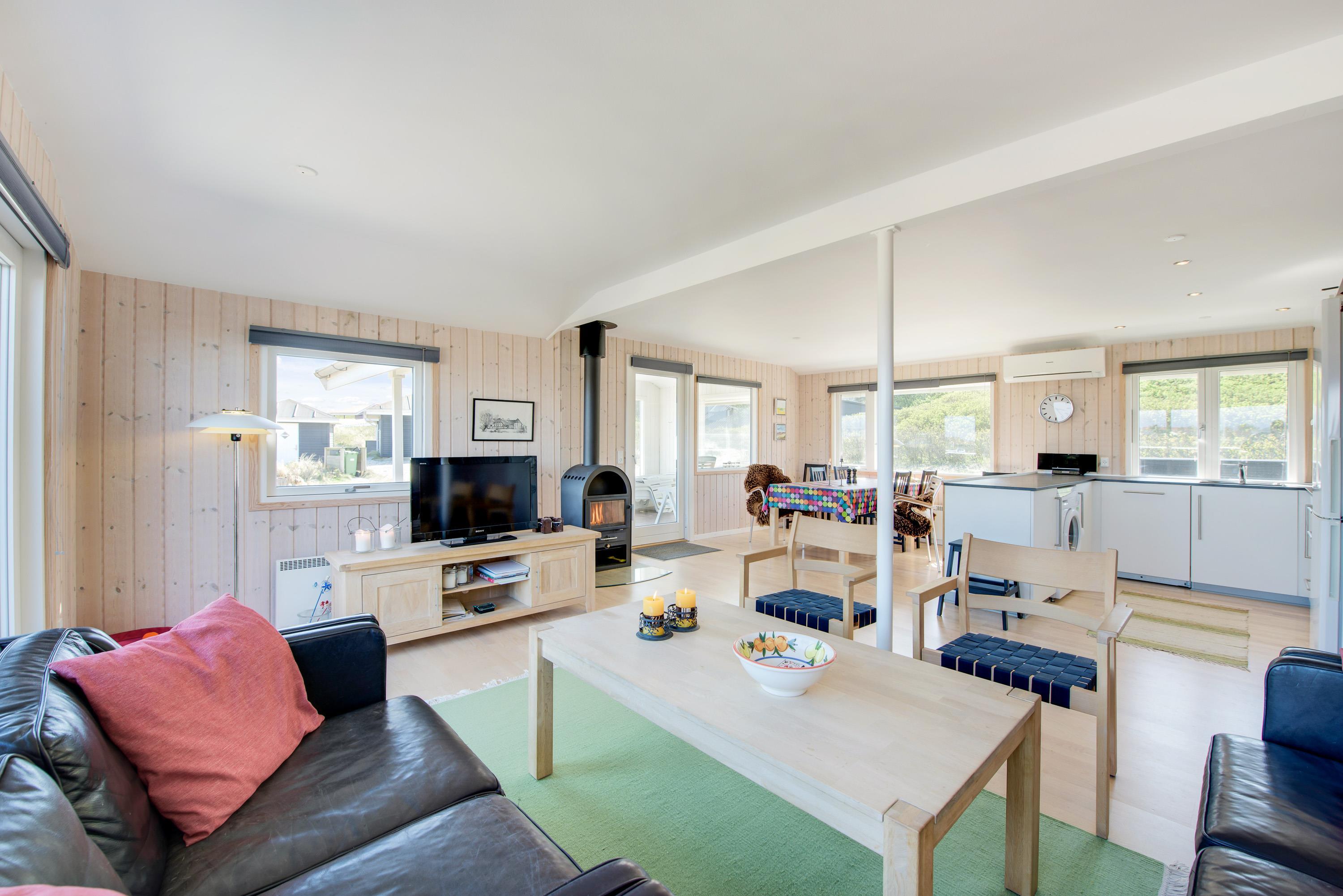 Velkommen indenfor på Granvej 12. Huset er flot og lyst indrettet med lyst køkken med opvaskemaskine, som kan tage en del af arbejdet fra jeres ferie, så I kan fokusere på at være sammen og ikke tænke på opvasken. Køkkenet er i åben forbindelse til stuen, som har en brændeovn til at skabe en masse hygge og varme når mørket falder på og det bliver køligt udenfor.