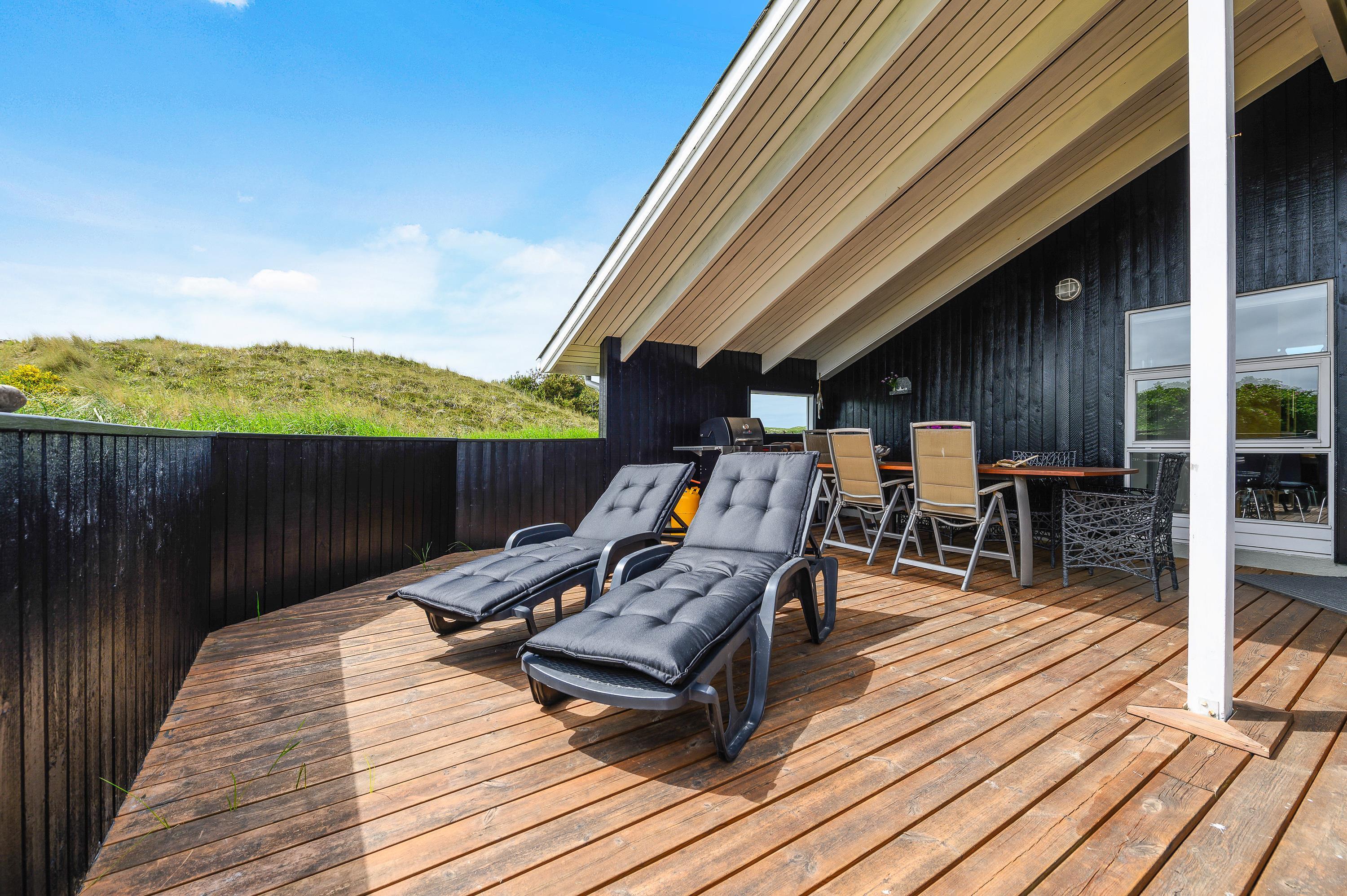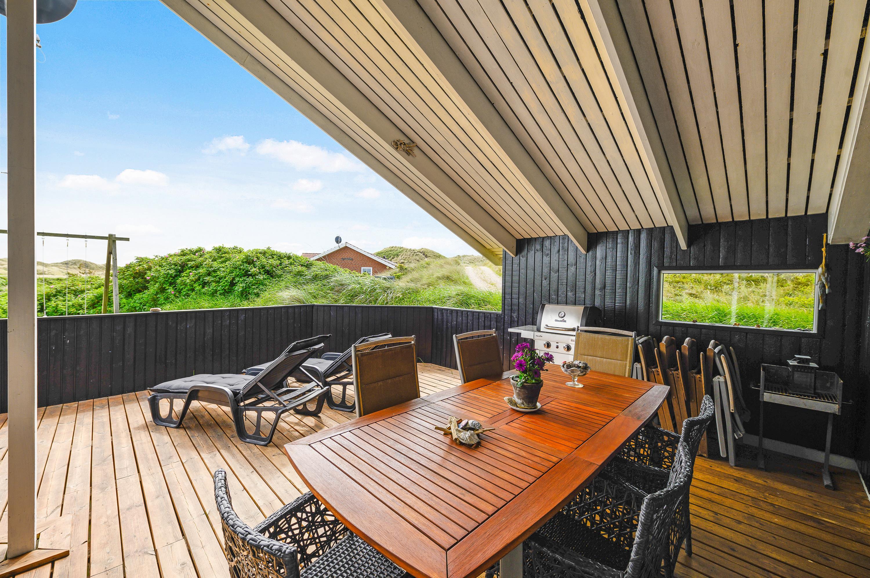 Sommerhuset har en dejlig træ terrasse, som omkranser næsten hele feriehuset. Her er der stort set mulighed for at finde læ, uanset hvor vinden kommer fra, og endvidere er noget af terrassen overdækket - skønt til de lange lyse aftener, hvor grillen har været igang, og man bare ikke har lyst til at gå ind.