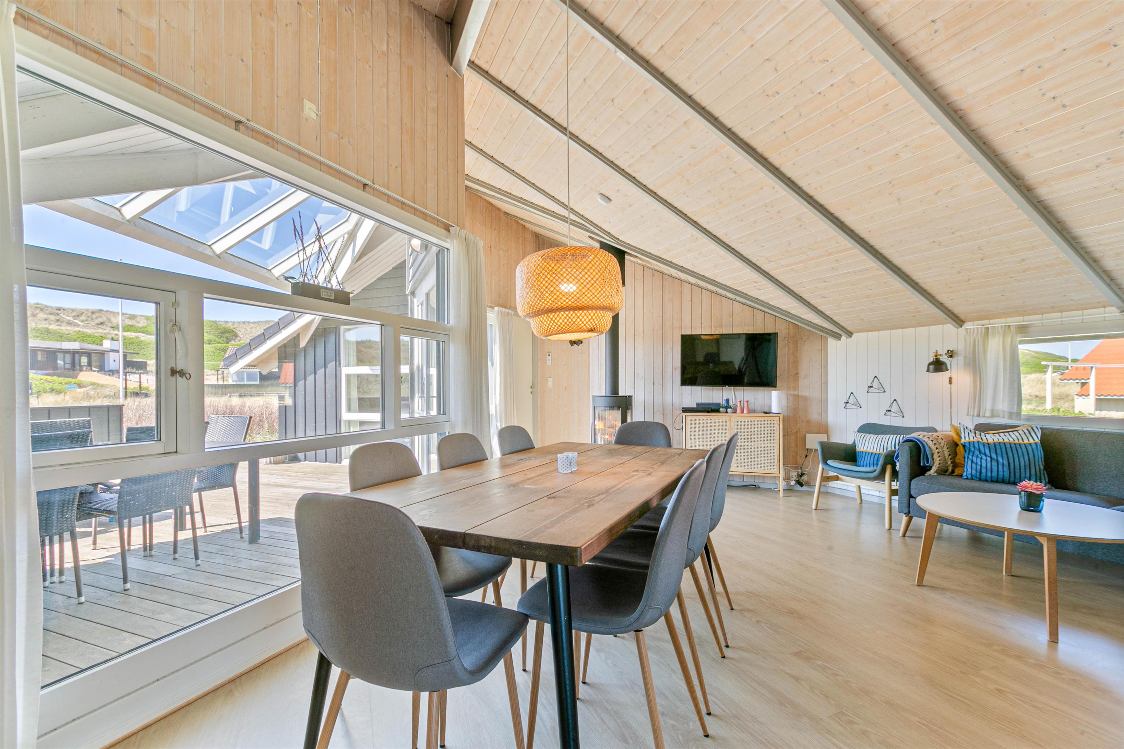 Lyst feriehus med stort vinduesparti og brændeovn