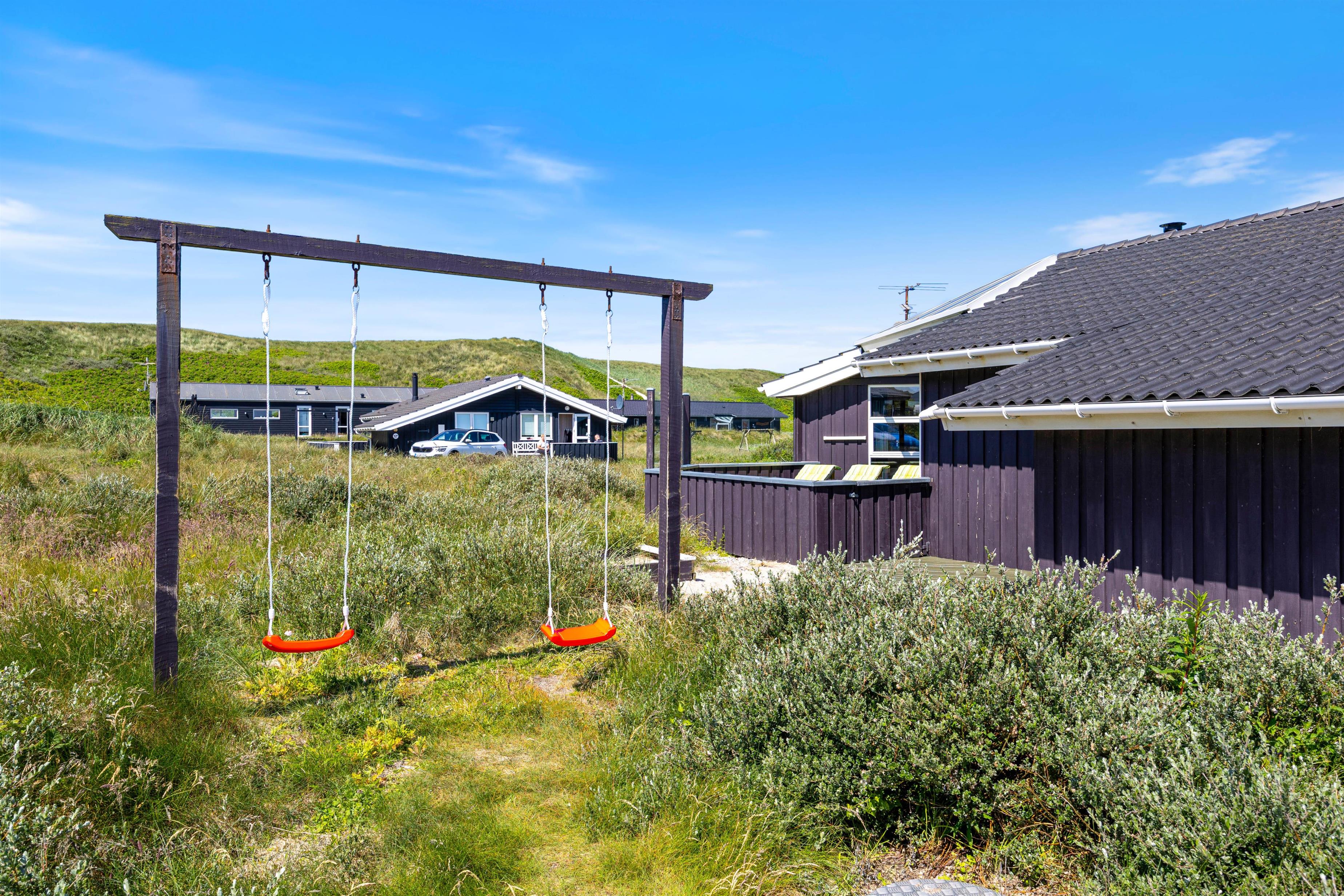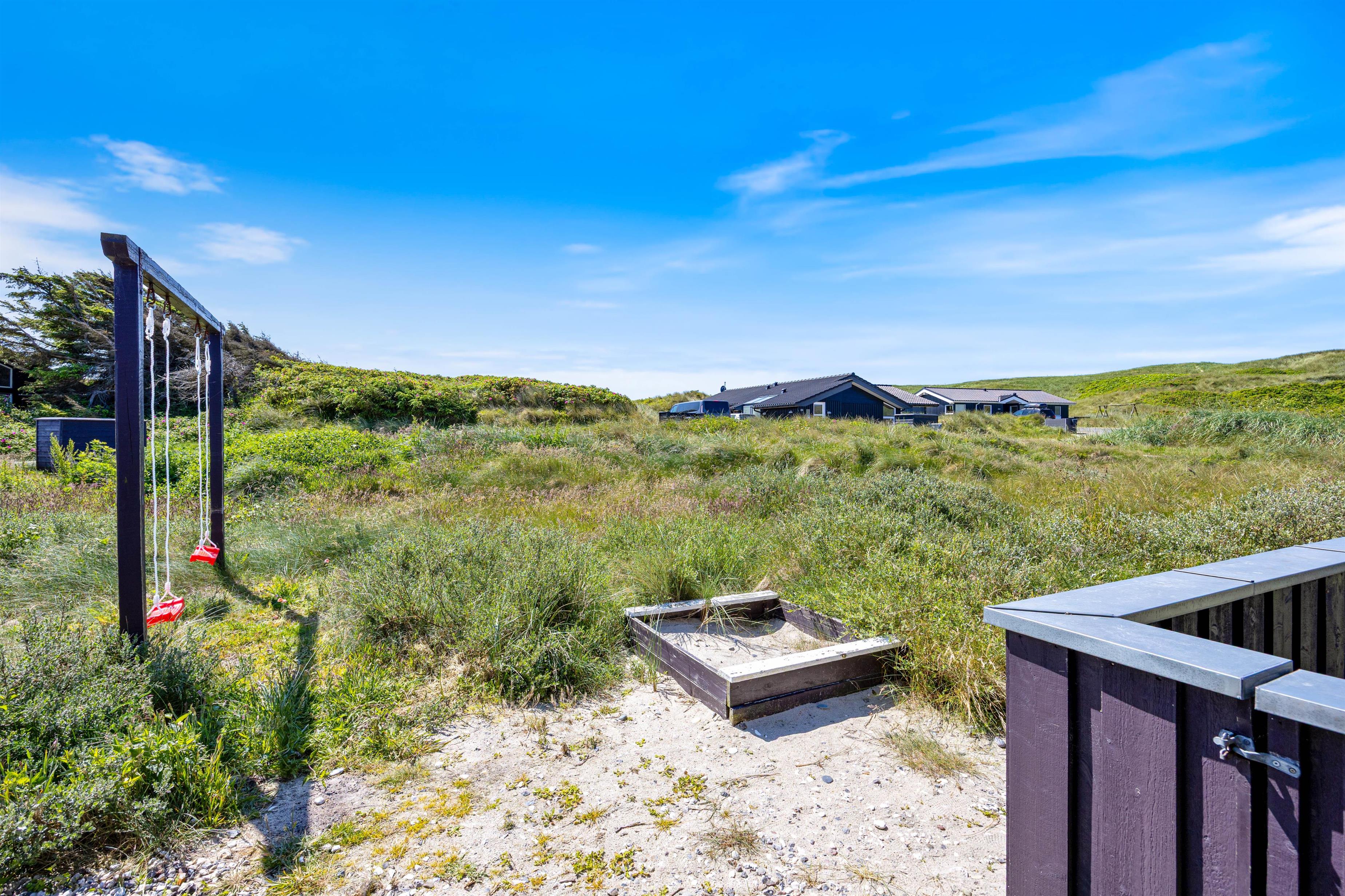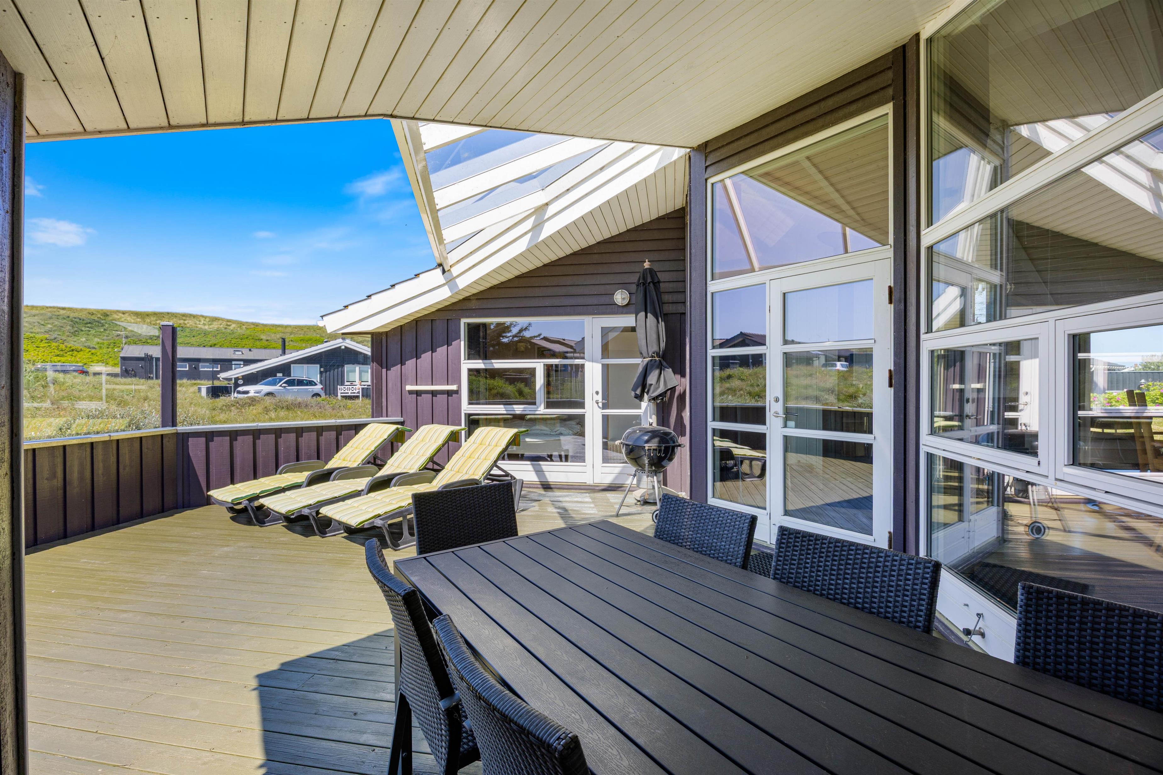 Terrassen er både lukket og delvist overdækket og er rigtig praktisk, hvis I har børn og hund med. Der er altid ly og læ at finde, og på de solrige dage står liggestolene og havemøblerne klar, så I kan holde ferie på ægte charter-manér. Til de små feriegæster er der sat gyngestativ og sandkasse op.