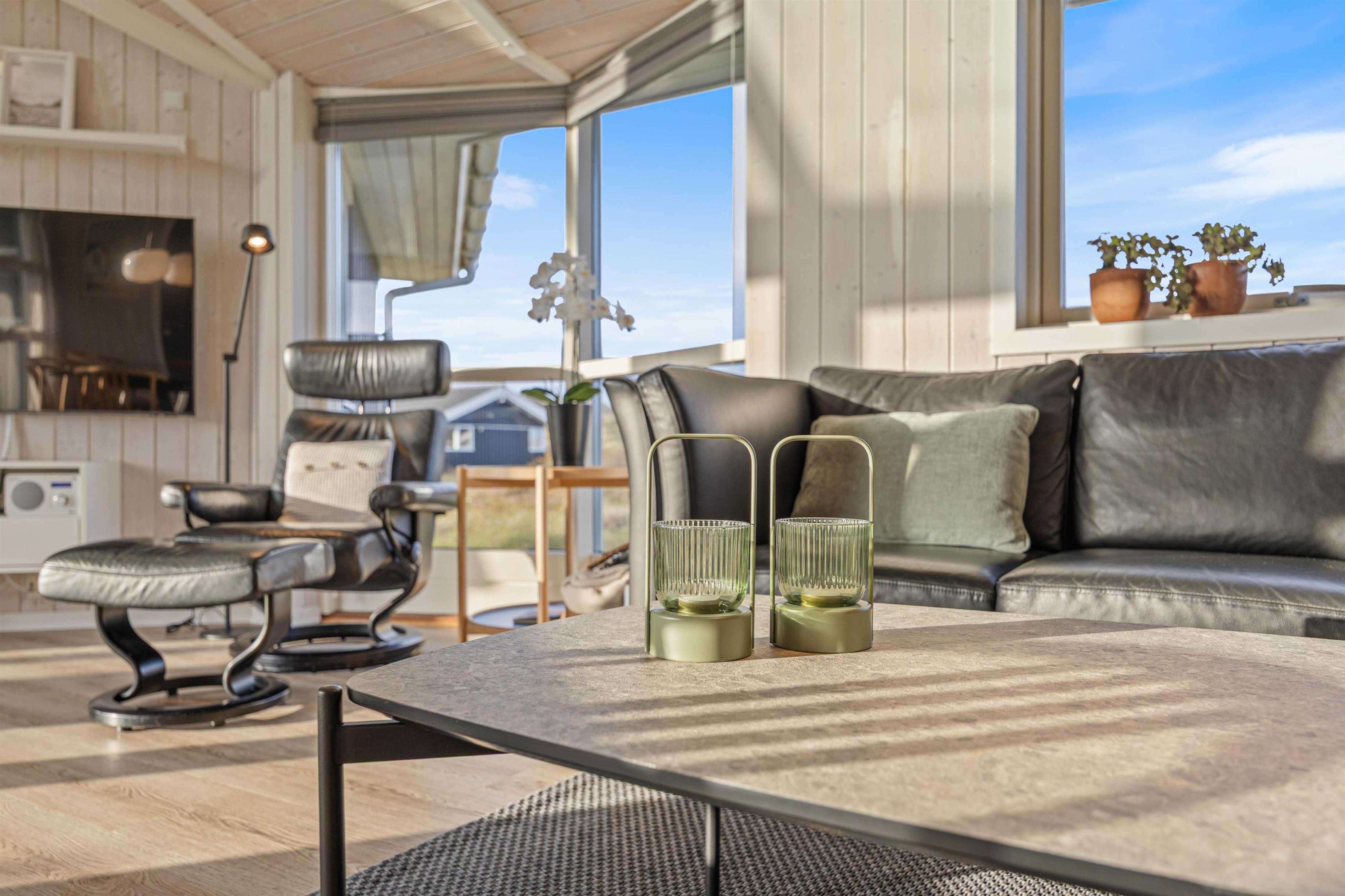Køkken og stue ligger i forlængelse af hinanden, og de store vinduespartier gør rummet endnu mere åbent og giver jer udsigt til det smukke klitlandskab. Brændeovnen sørger for varme og hyggelig atmosfære året rundt.