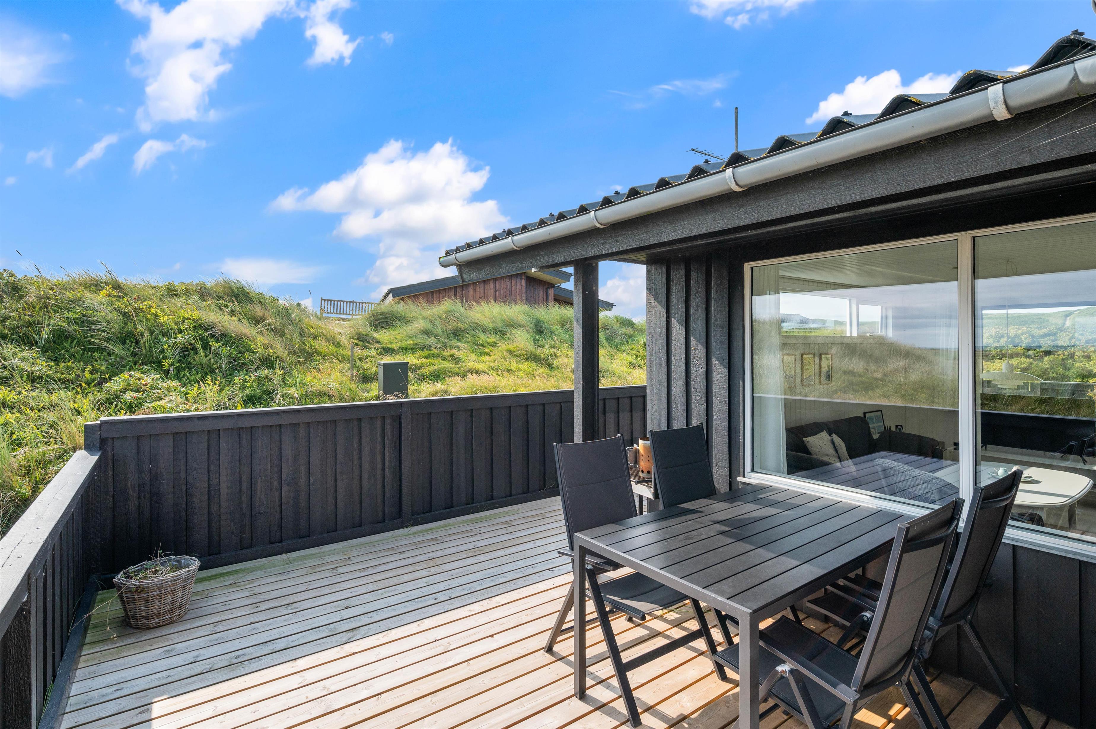 Fra den hyggelige stue er der udgang til en rummelig, lukket terrasse. Dette er især nyttigt for familier med små børn eller hundeejere. På grund af terrassens delvise overdækning kan du altid finde et lunt sted, hvor du kan slappe af i havemøblerne, imens hundene kan løbe frit rundt i løbegården. Nyd udsigten over den smukke naturgrund med Ringkøbing Fjord i baggrunden.