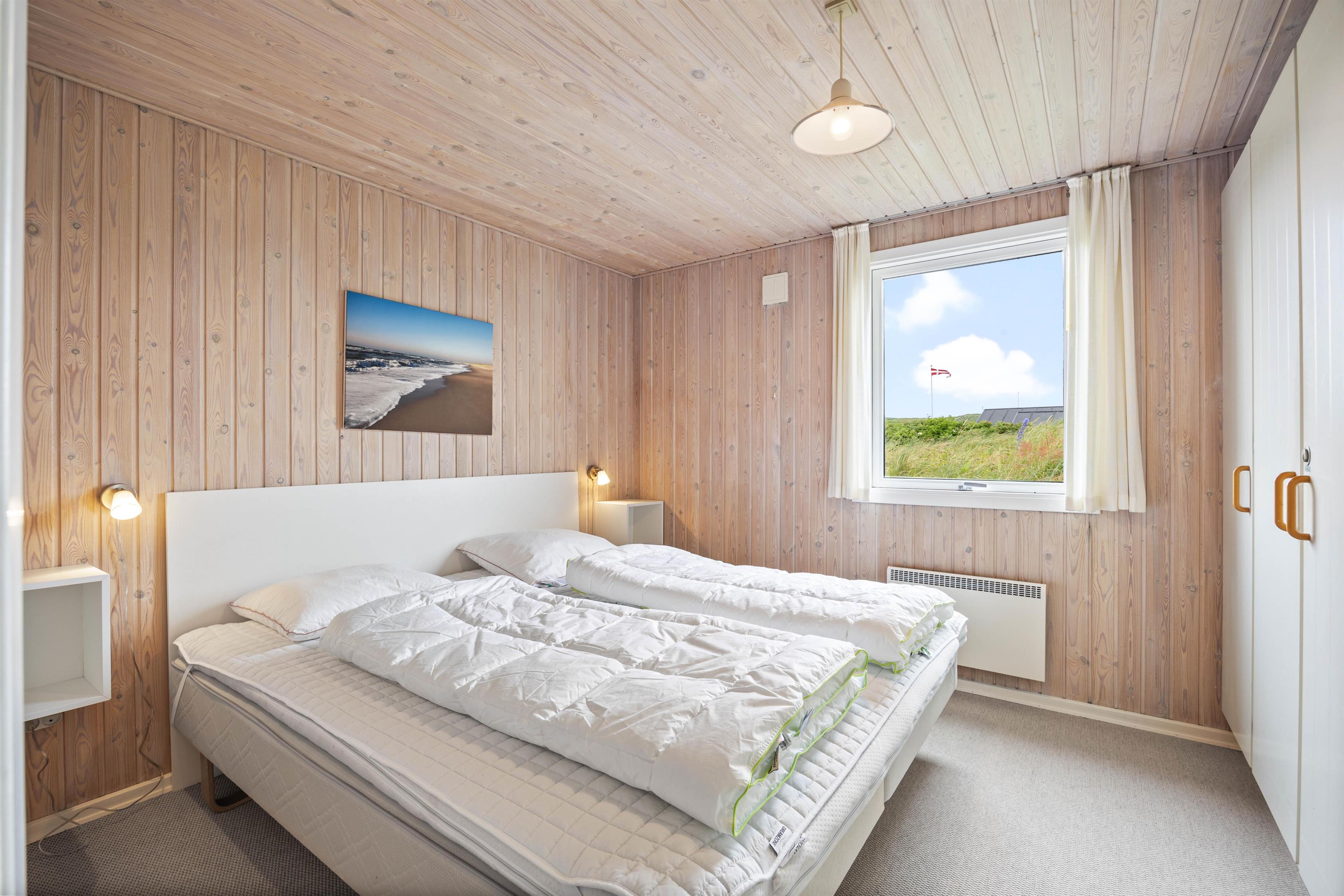 Det velholdte badeværelse er tilgængeligt fra et af soveværelserne samt fra entréen. I saunaen kan du blive gennemvarm efter en lang gåtur ved Vesterhavet. Der er 2 komfortable soveværelser med dobbeltsenge og et soveværelse med 2 enkeltsenge i sommerhuset. Her kan du hvile ud i den friske vesterhavsluft.
