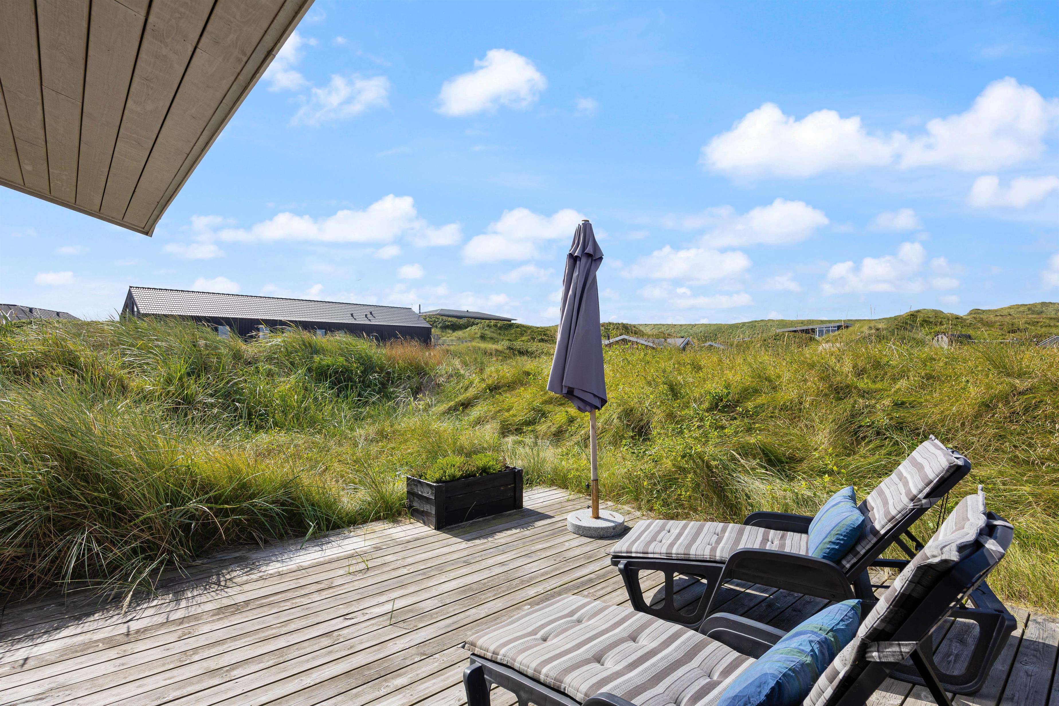 Udenfor finder I flere skønne kroge, hvor I kan slappe af og nyde ferien. På den store terrasse har I flere muligheder for at sidde i læ og nyde en dejlig varm kop kaffe. Det er også muligt at sidde ude under sommerhusets parasol og nyde en appetitlig aftensmad lavet på sommerhusets grill. Rundt om sommerhuset finder I også 2 delviste overdækket terrasser, hvor I kan sidde I læ for vinden.