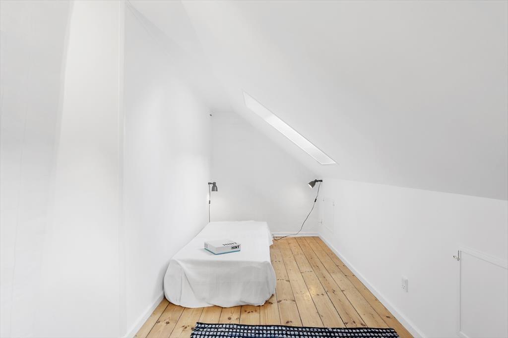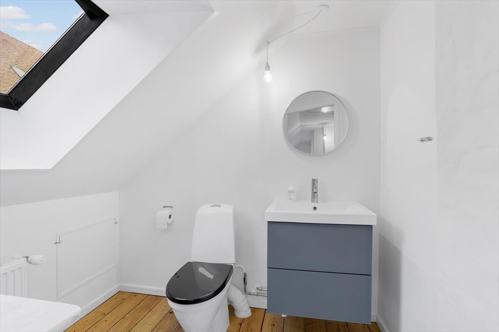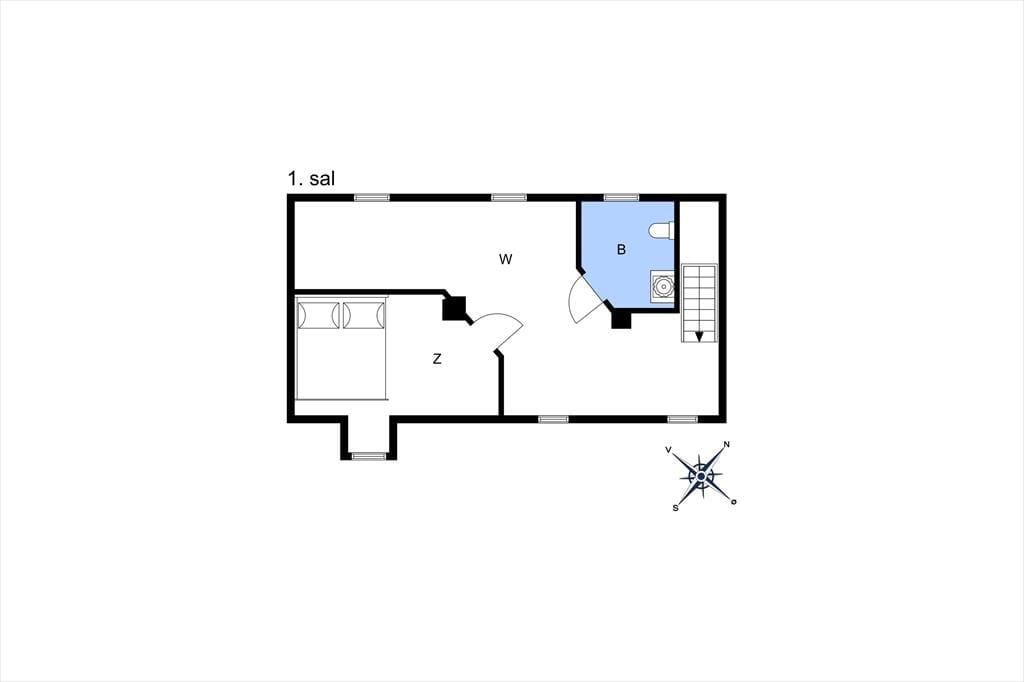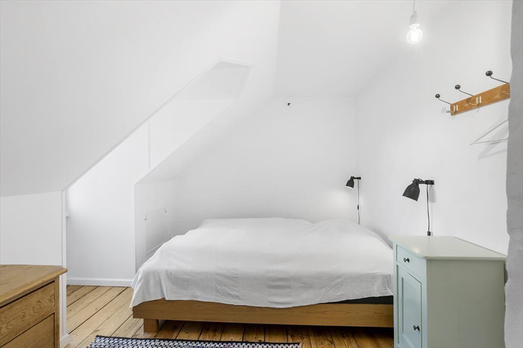 På førstesalen et toilet med håndvask. Soveværelse med dobbelt seng. Mulighed for opredning på madrasser til 2 personer.